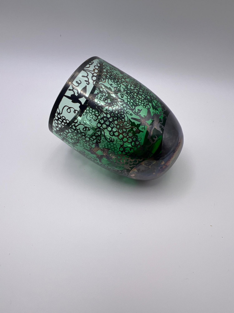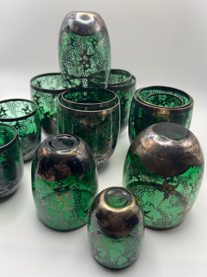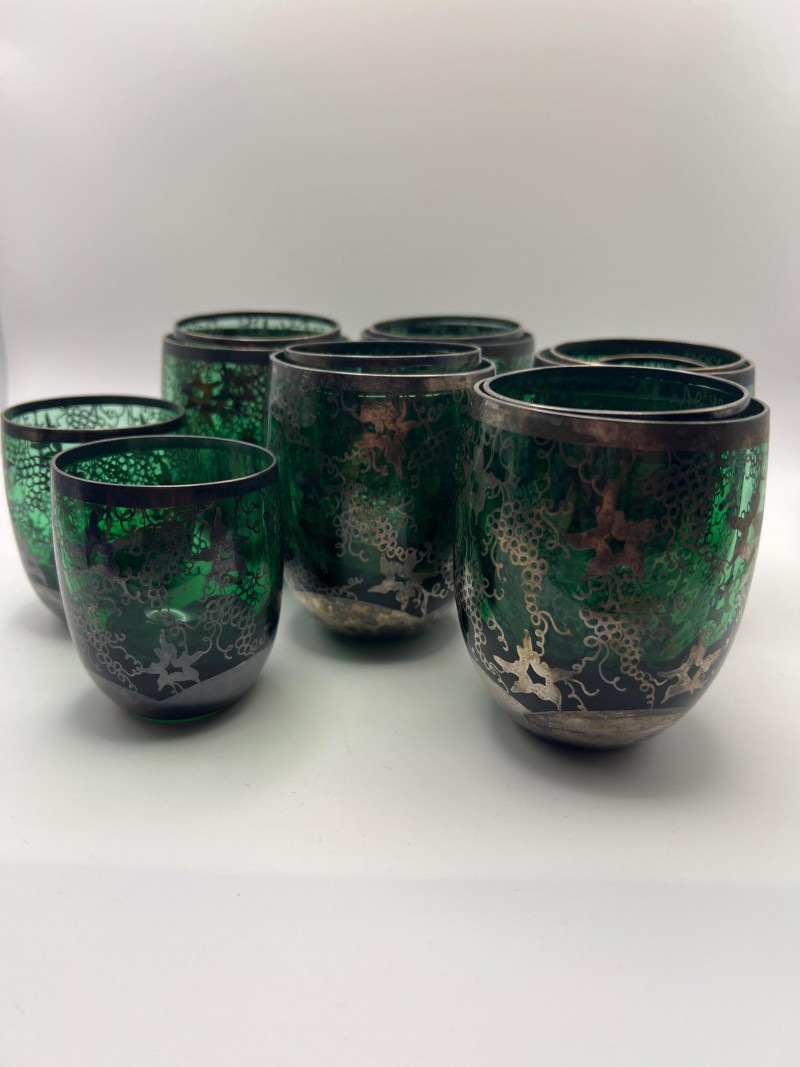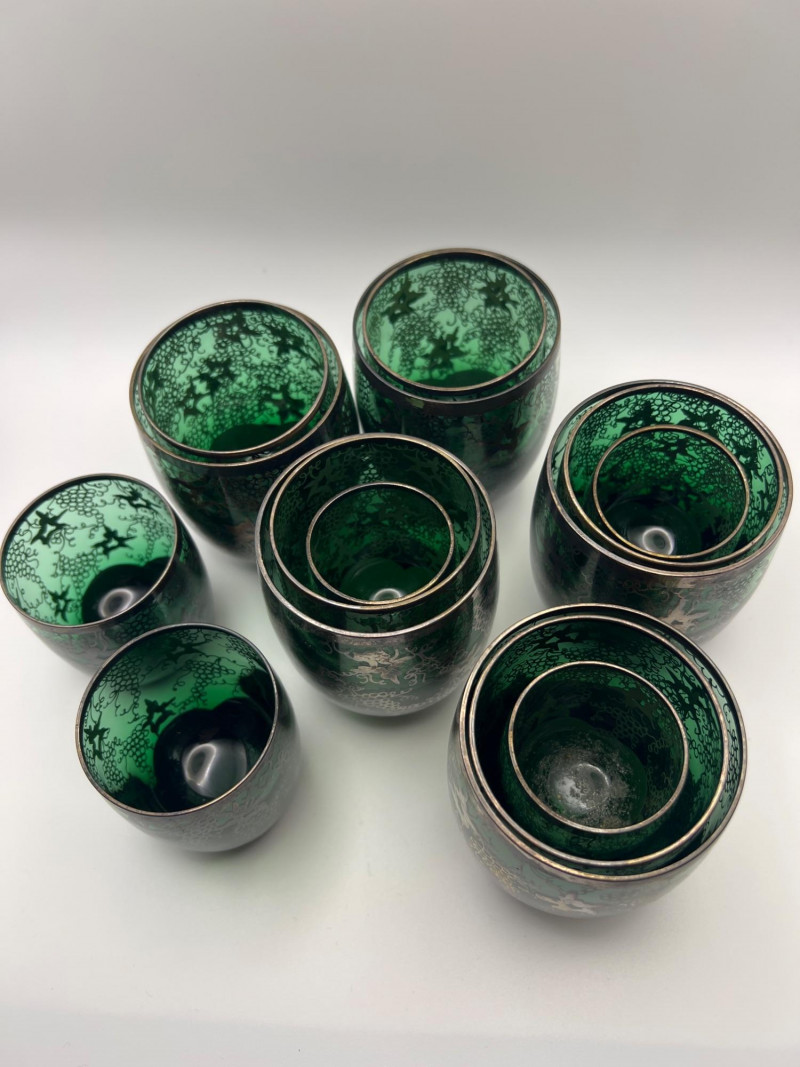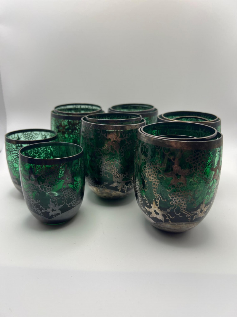 Decorative green glass cups featuring intricate silver overlay designs in a Middle Eastern–inspired style. Each cup shows detailed applied silver patterning over rich emerald glass, making them ideal for tea service, display, or collectible décor. Beautiful reflective surfaces and ornate motifs give the set a striking, artisan look. Total number of glasses is 15. Included sizes are: 5 - 3-5/8” height x 2-5/8” round 5 - 3” height x 2.25” round 2 - 2-5/8” height x 2” round 3 - 2.25” height x 1-3/4” round