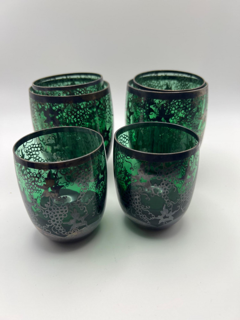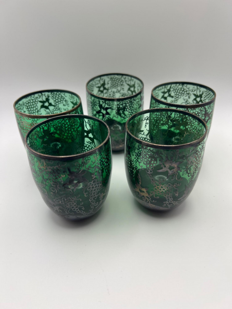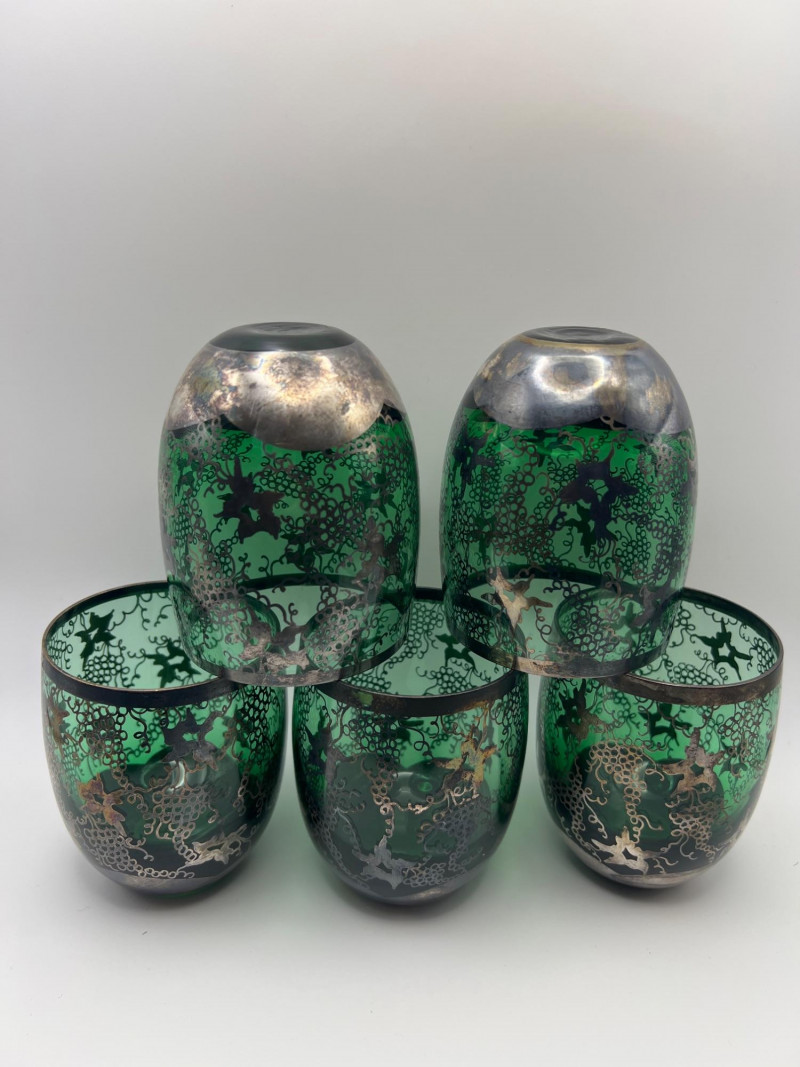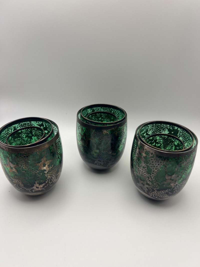 Lot # 111 - Indo-Persian Tea Glasses — Green Glass & Silver Overlay