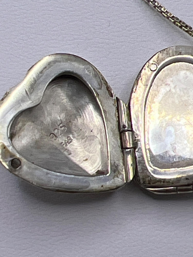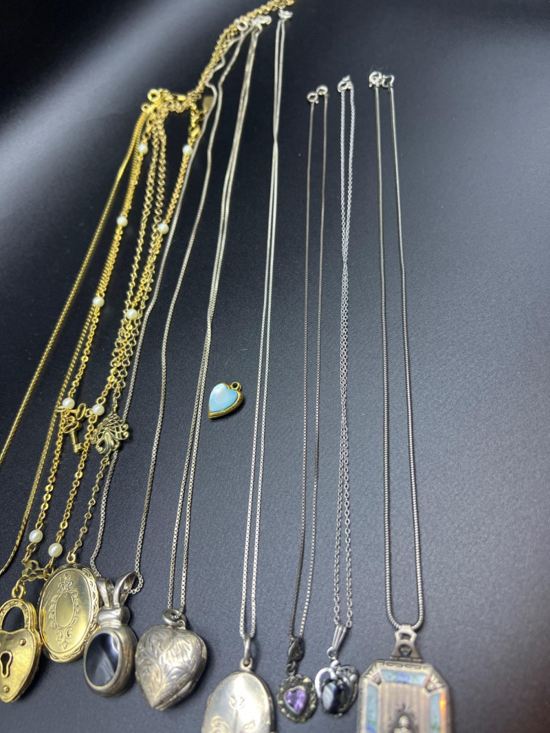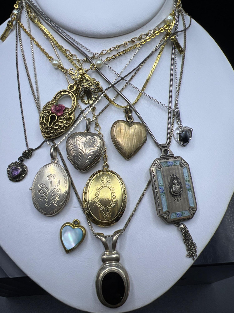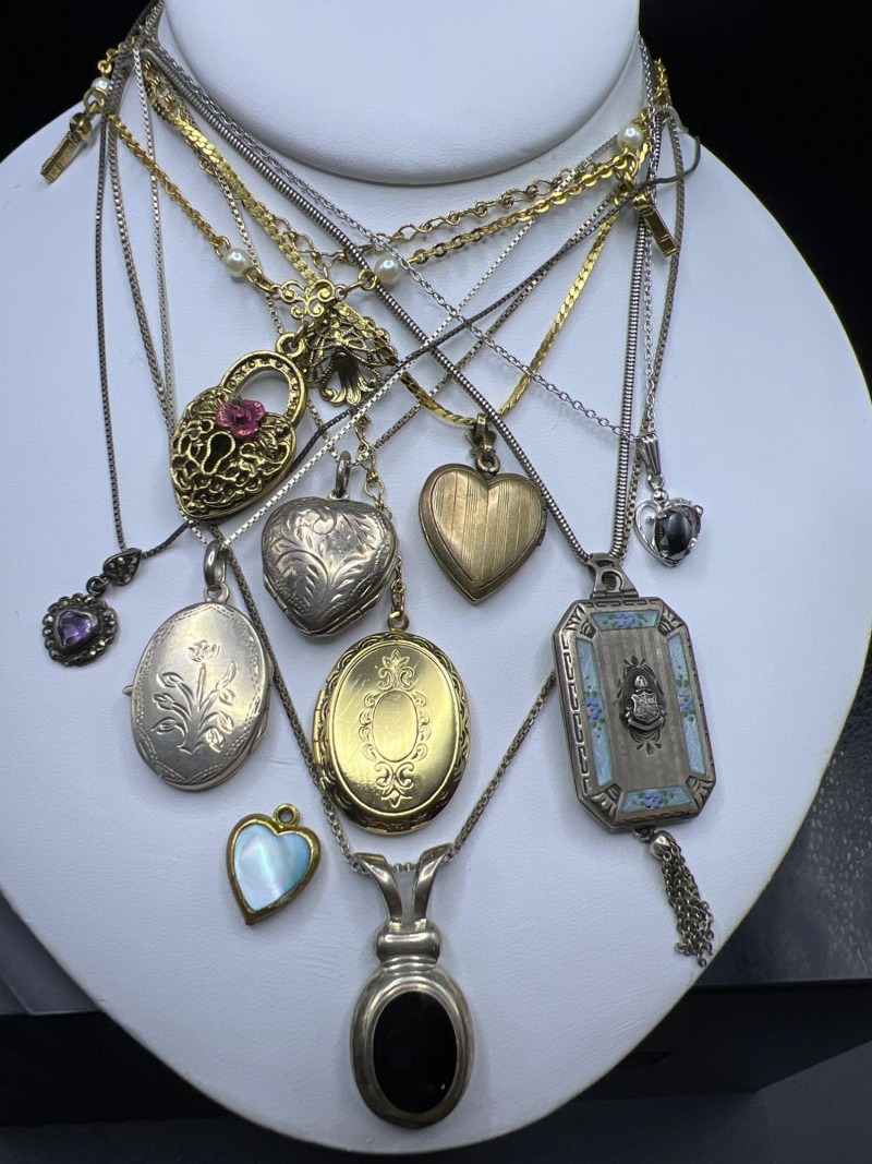 Assortment of fashion and sterling silver jewelry featuring an elegant mix of pendants, heart‑themed pieces, vintage‑style lockets, and multiple 925 chains. Includes engraved and filigree designs, gemstone‑accented pendants, and romantic motifs in both sterling and fashion metals. A versatile grouping ideal for collectors, resellers, or anyone who loves expressive mixed‑metal jewelry. Chains - 18” and 22”