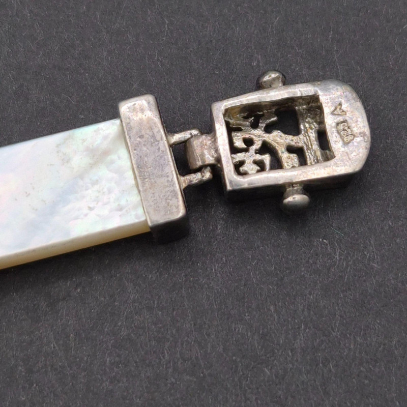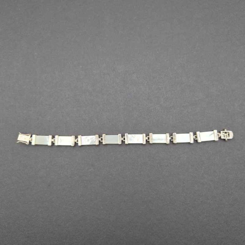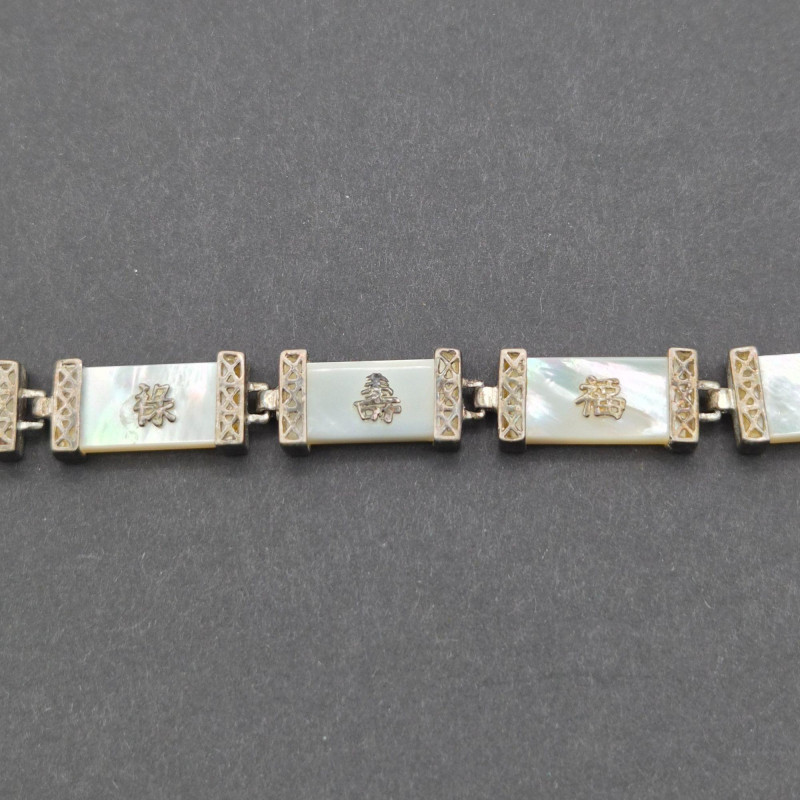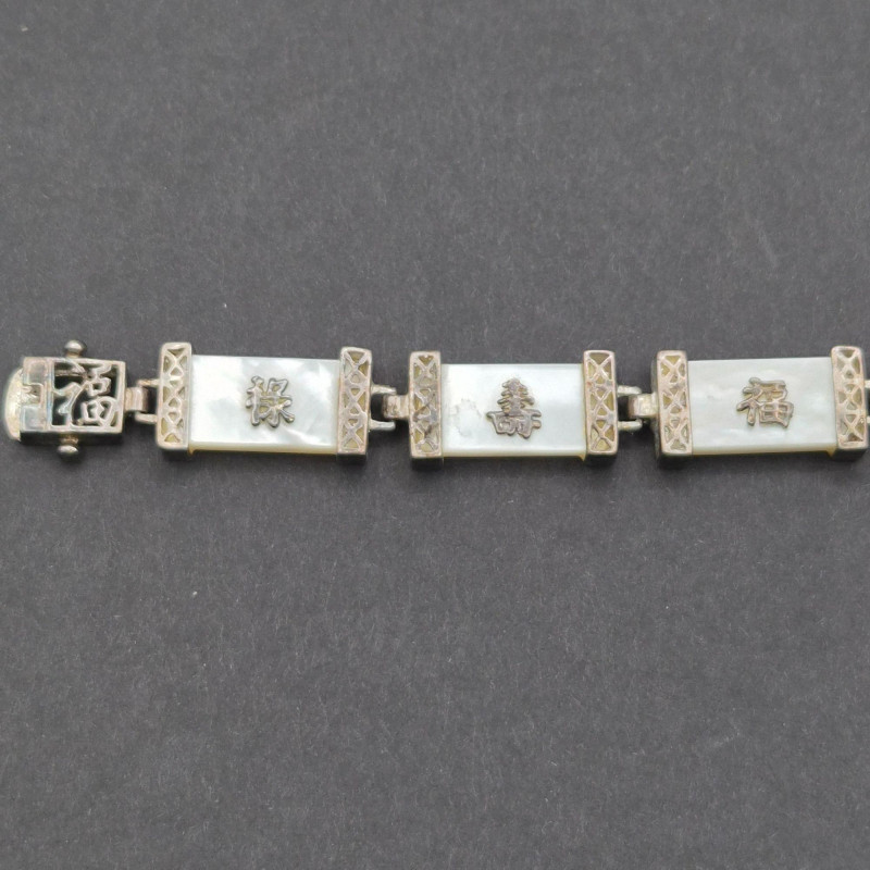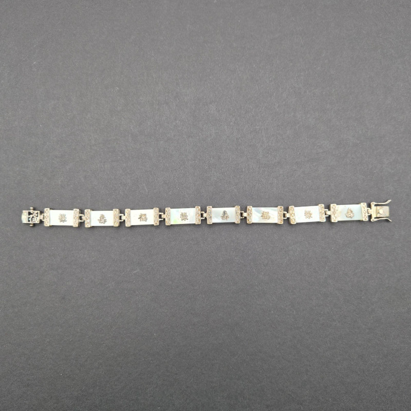 A graceful vintage sterling silver link bracelet featuring eight mother‑of‑pearl (MOP) links set between sterling links engraved with elegant Asian‑inspired motifs. The generous 7.75" length offers a comfortable fit for most wrists and the combination of luminous MOP and detailed silverwork creates a refined, wearable statement with subtle cultural flair.