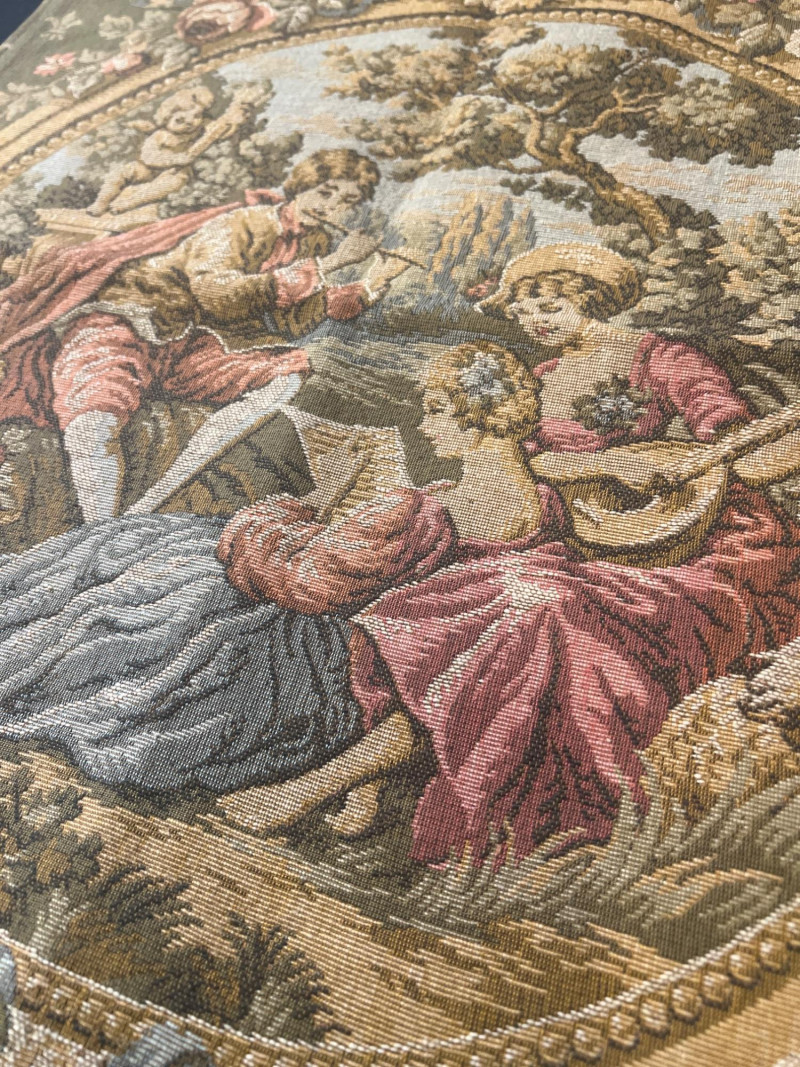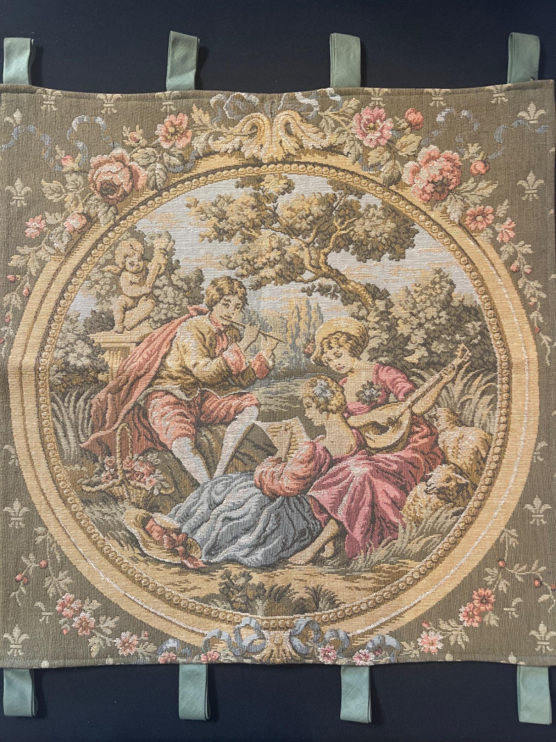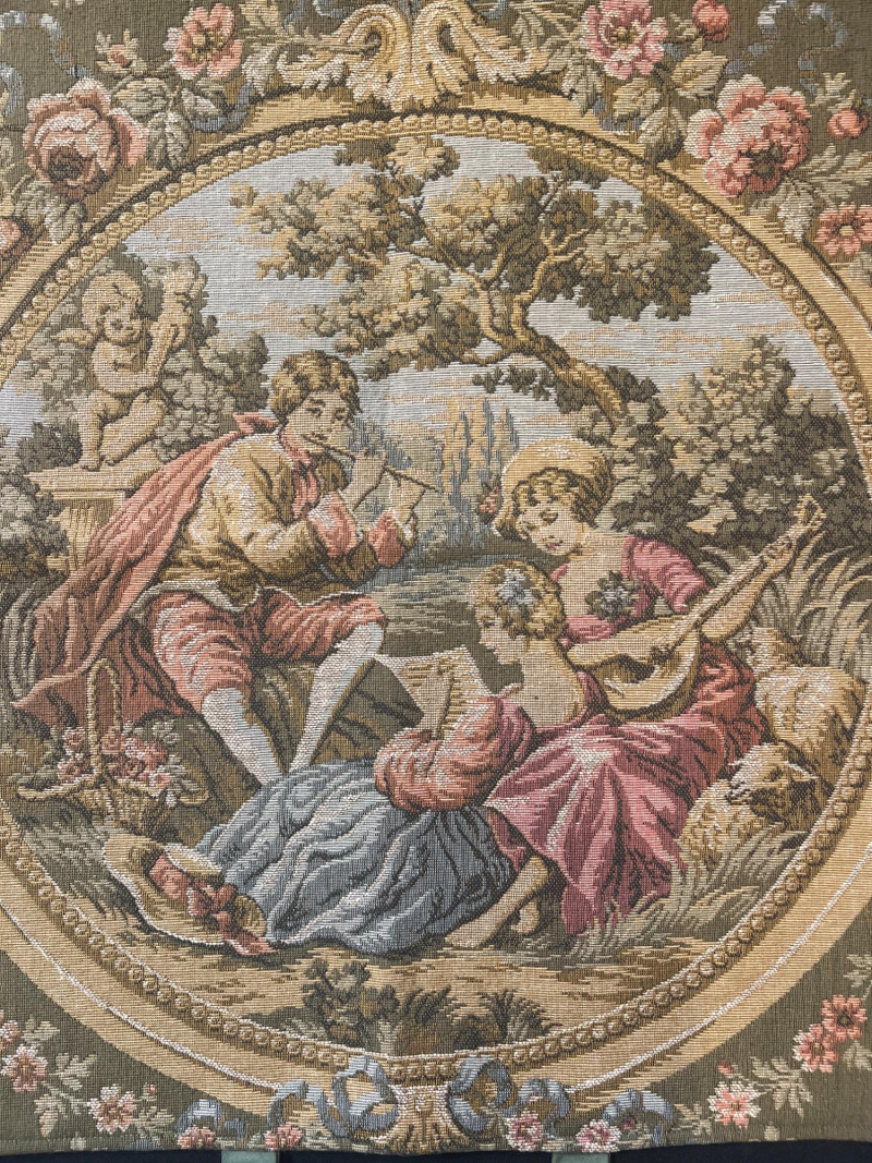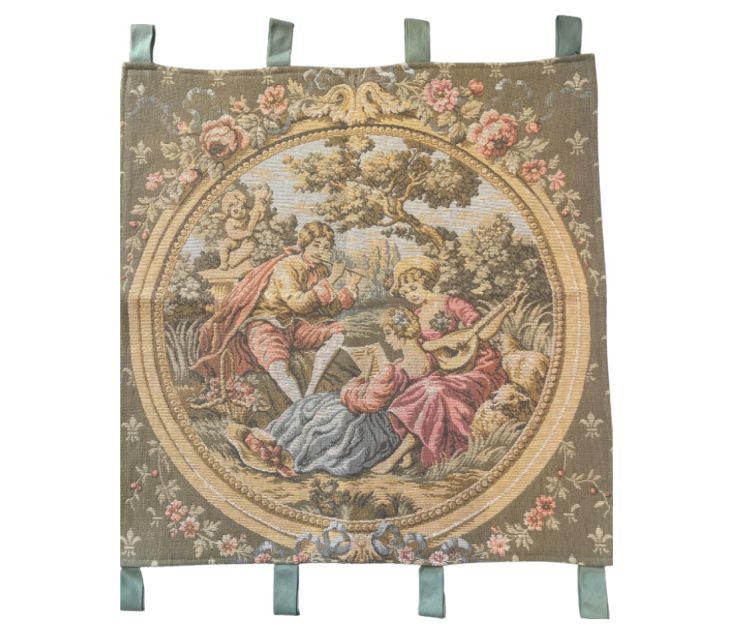 A beautifully woven vintage French tapestry wall hanging, marked Made in France, featuring an elegant pastoral scene framed within an ornate circular medallion. Three figures in period attire gather in a lush garden setting—one playing a flute, another with a lute, and a third reading—capturing the romantic leisure of an 18th‑century countryside tableau. The tapestry is bordered with intricate floral and scrollwork designs and includes fabric loops at the top and bottom for easy hanging or display. Its French origin enhances its decorative and collectible appeal, making it an excellent accent for traditional, European‑inspired, or cottage interiors.