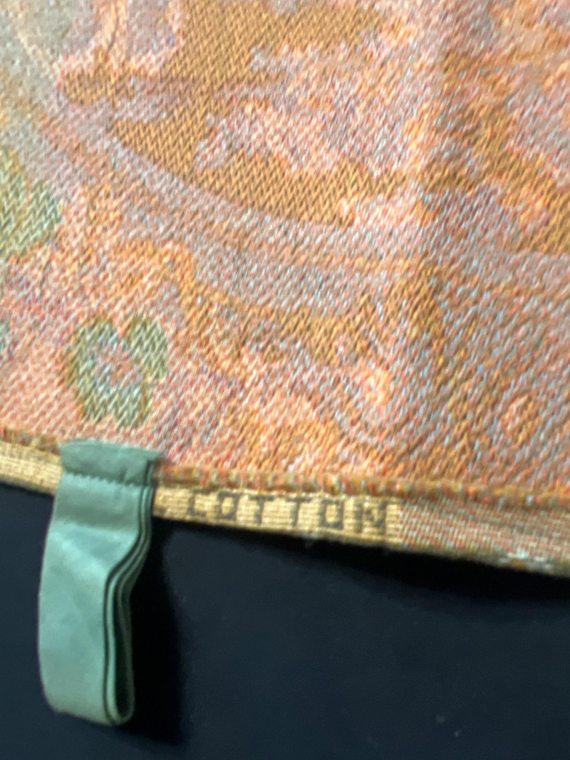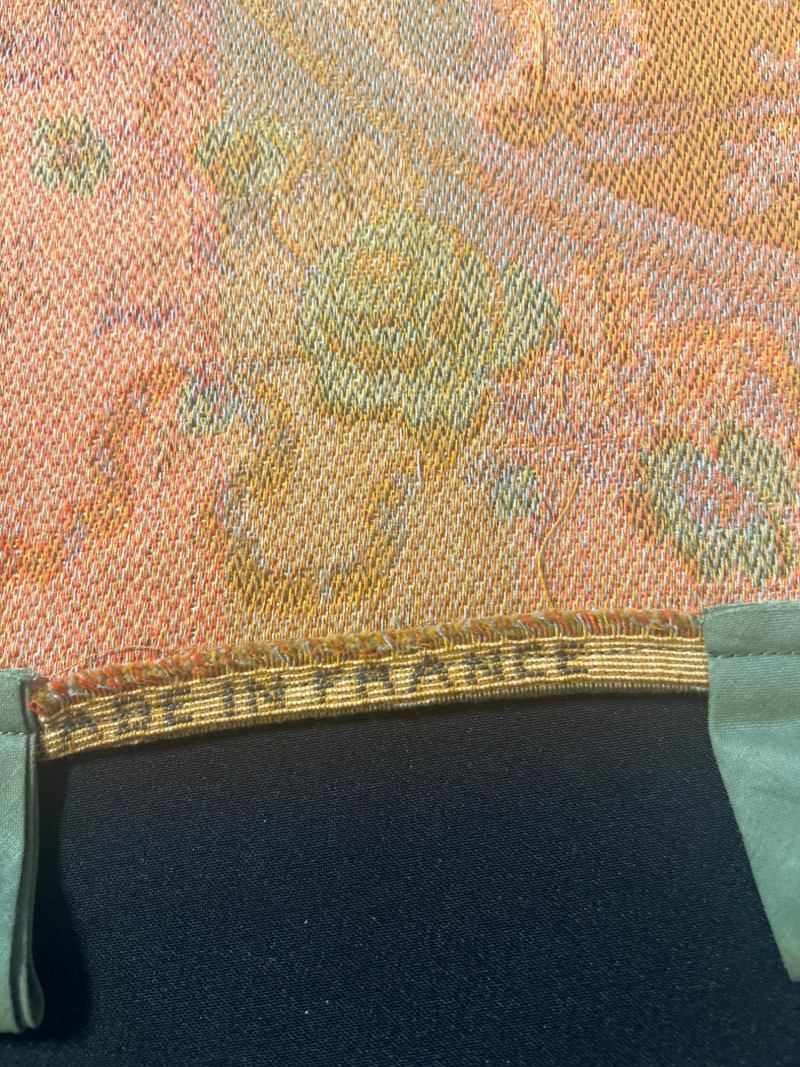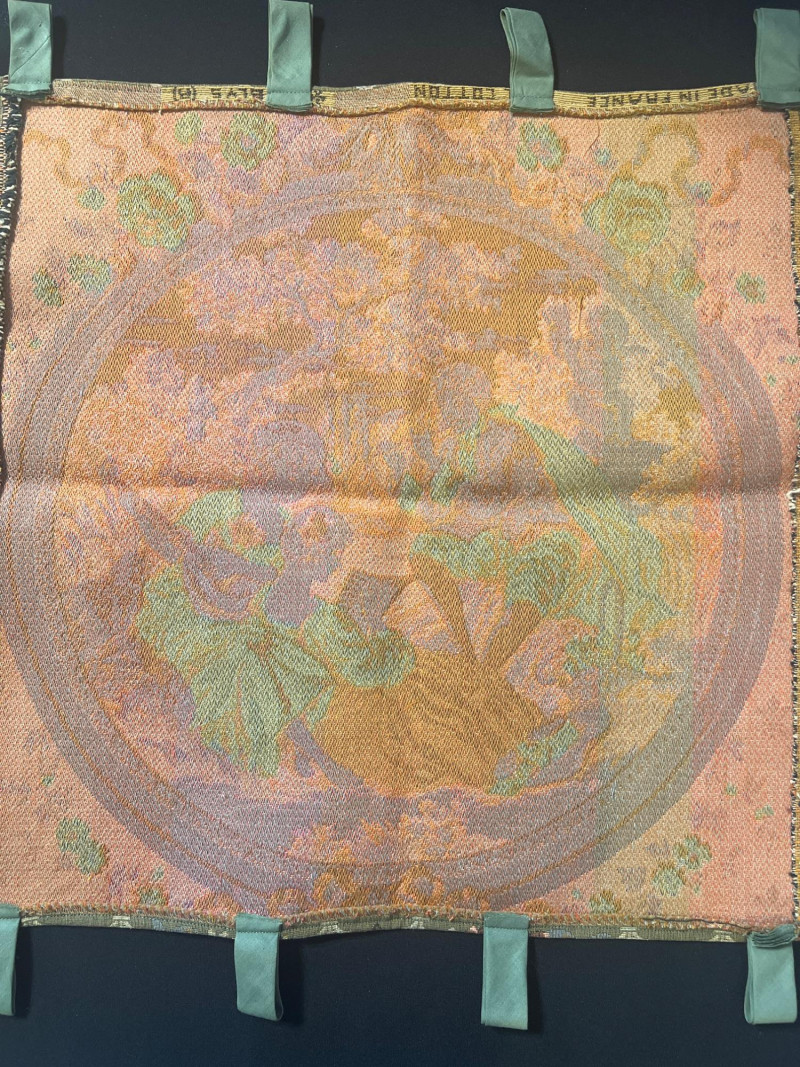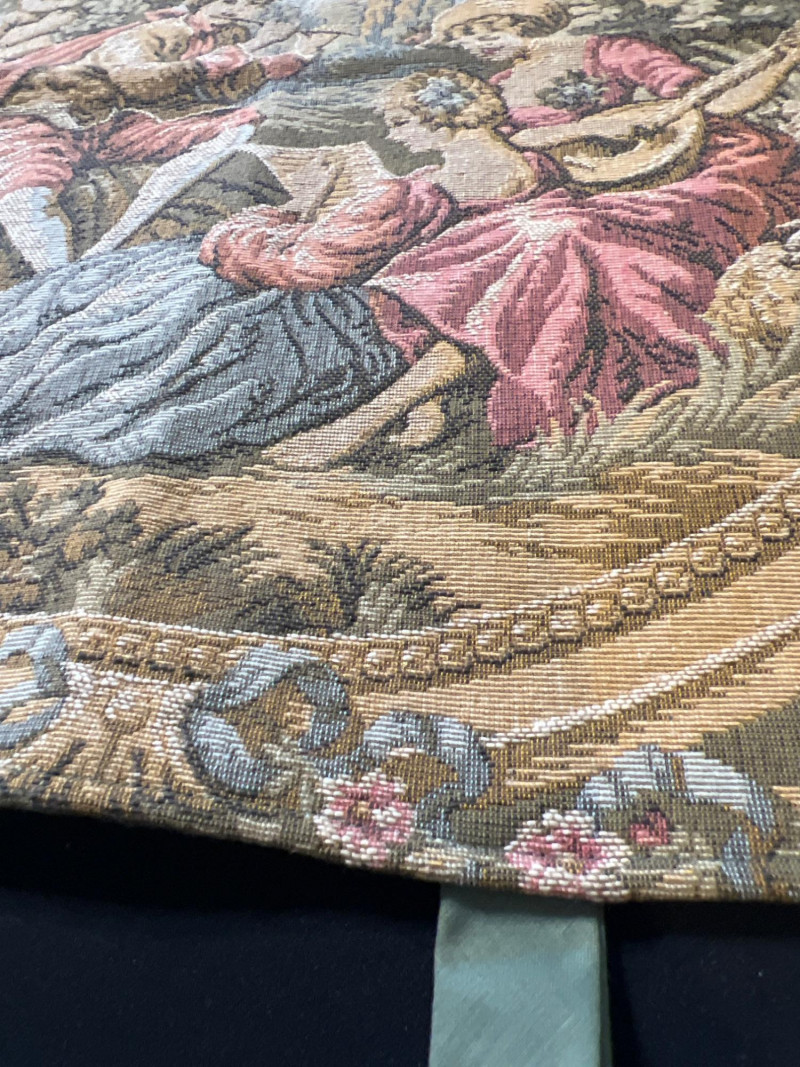 A beautifully woven vintage French tapestry wall hanging, marked Made in France, featuring an elegant pastoral scene framed within an ornate circular medallion. Three figures in period attire gather in a lush garden setting—one playing a flute, another with a lute, and a third reading—capturing the romantic leisure of an 18th‑century countryside tableau. The tapestry is bordered with intricate floral and scrollwork designs and includes fabric loops at the top and bottom for easy hanging or display. Its French origin enhances its decorative and collectible appeal, making it an excellent accent for traditional, European‑inspired, or cottage interiors.