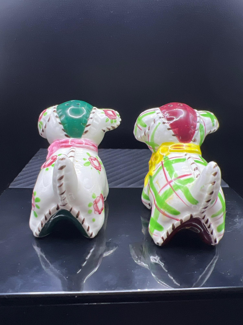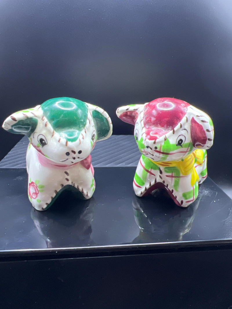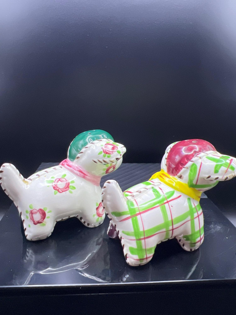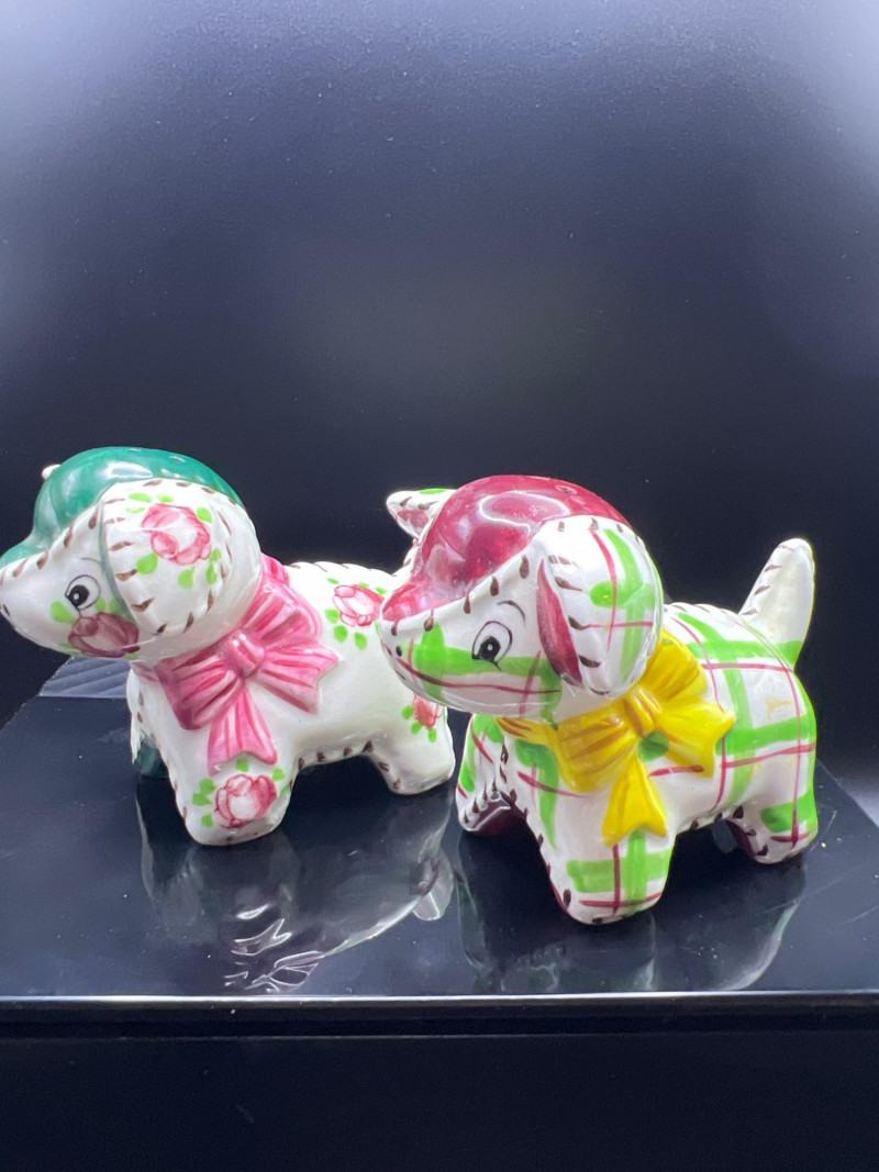 A charming mixed lot of vintage ceramics featuring an Occupied Japan Dutch Boy planter (4.5”H × 3.5”W × 2”D), accompanied by four miniature dog figurines ranging from 1” to 1.25” high. Completing the set is a colorful pair of patchwork dog salt & pepper shakers (2.5”H × 3.25”L × 2”W), decorated in bright quilt‑inspired patterns. This eclectic grouping blends post‑war Japanese craftsmanship with playful mid‑century whimsy, making it a delightful addition for collectors of Occupied Japan pieces, canine figurines, or vintage ceramic décor.