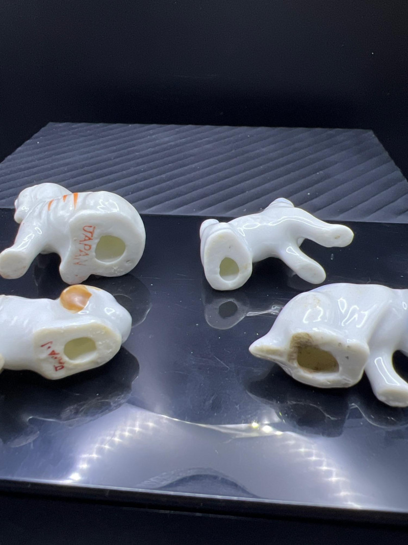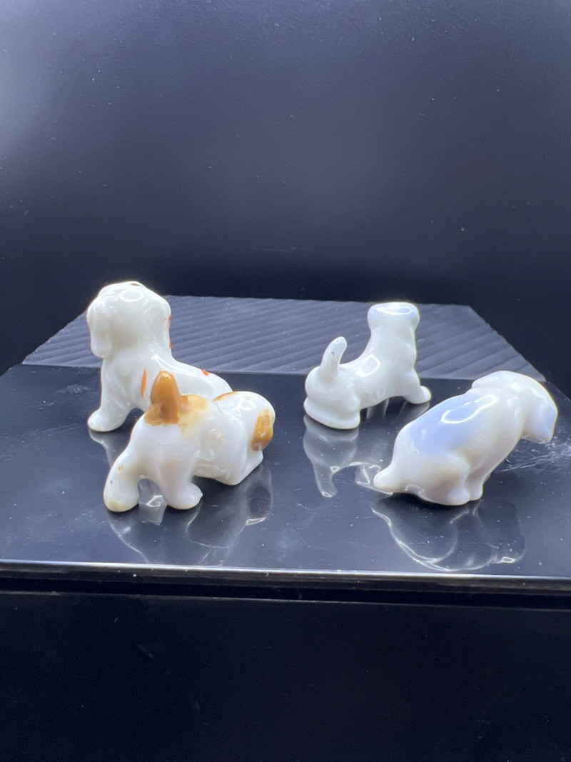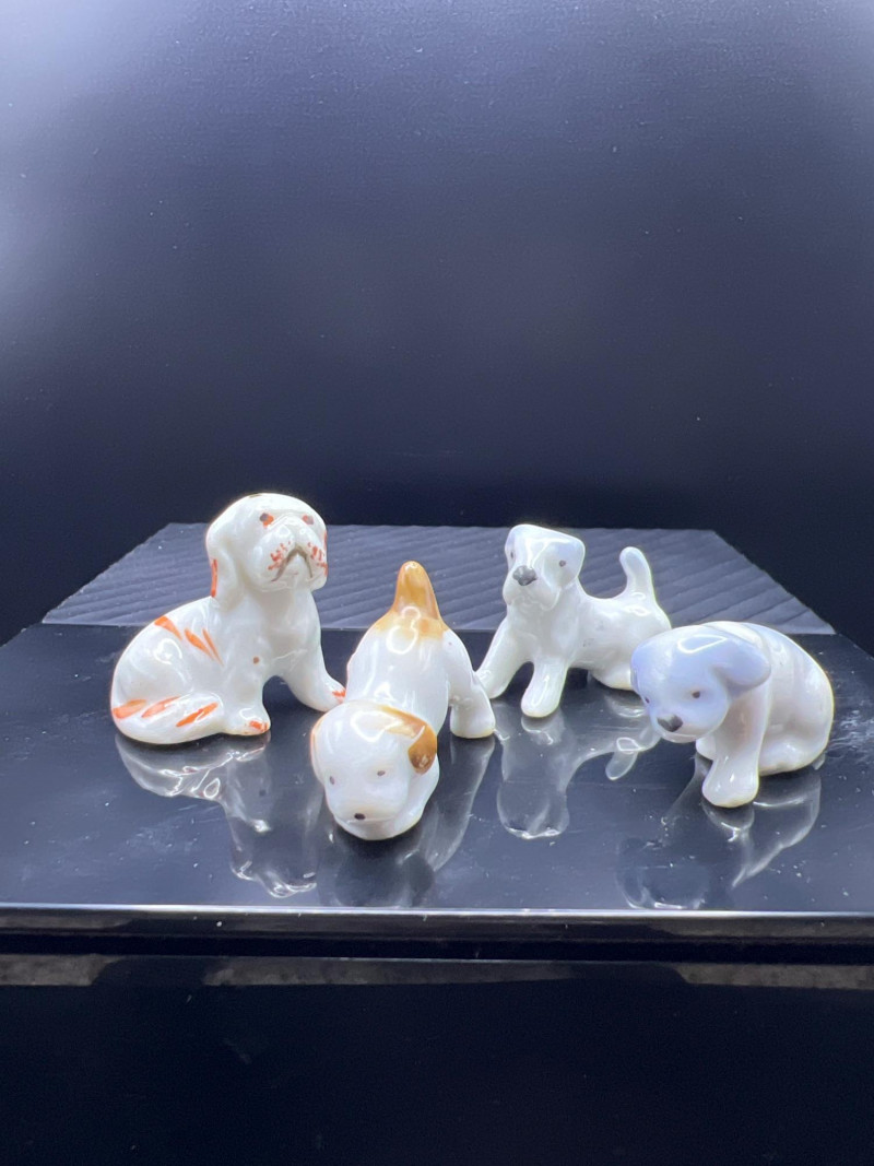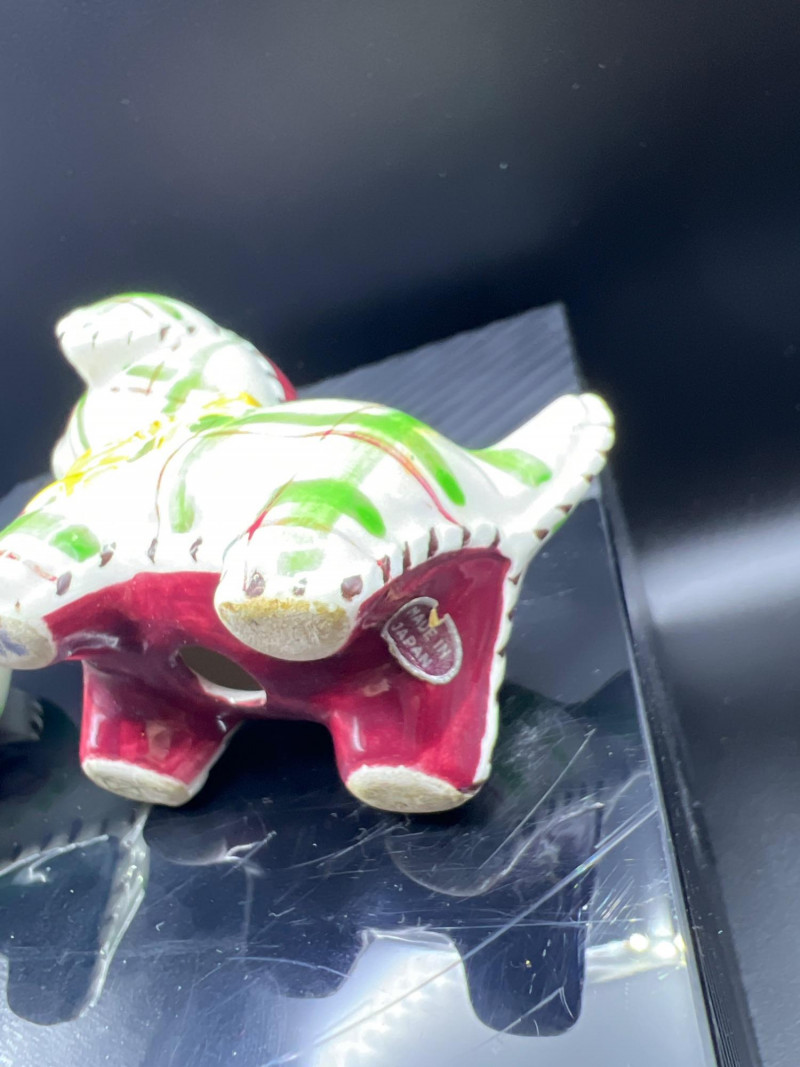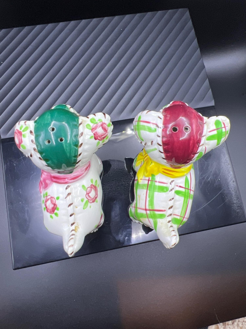 A charming mixed lot of vintage ceramics featuring an Occupied Japan Dutch Boy planter (4.5”H × 3.5”W × 2”D), accompanied by four miniature dog figurines ranging from 1” to 1.25” high. Completing the set is a colorful pair of patchwork dog salt & pepper shakers (2.5”H × 3.25”L × 2”W), decorated in bright quilt‑inspired patterns. This eclectic grouping blends post‑war Japanese craftsmanship with playful mid‑century whimsy, making it a delightful addition for collectors of Occupied Japan pieces, canine figurines, or vintage ceramic décor.