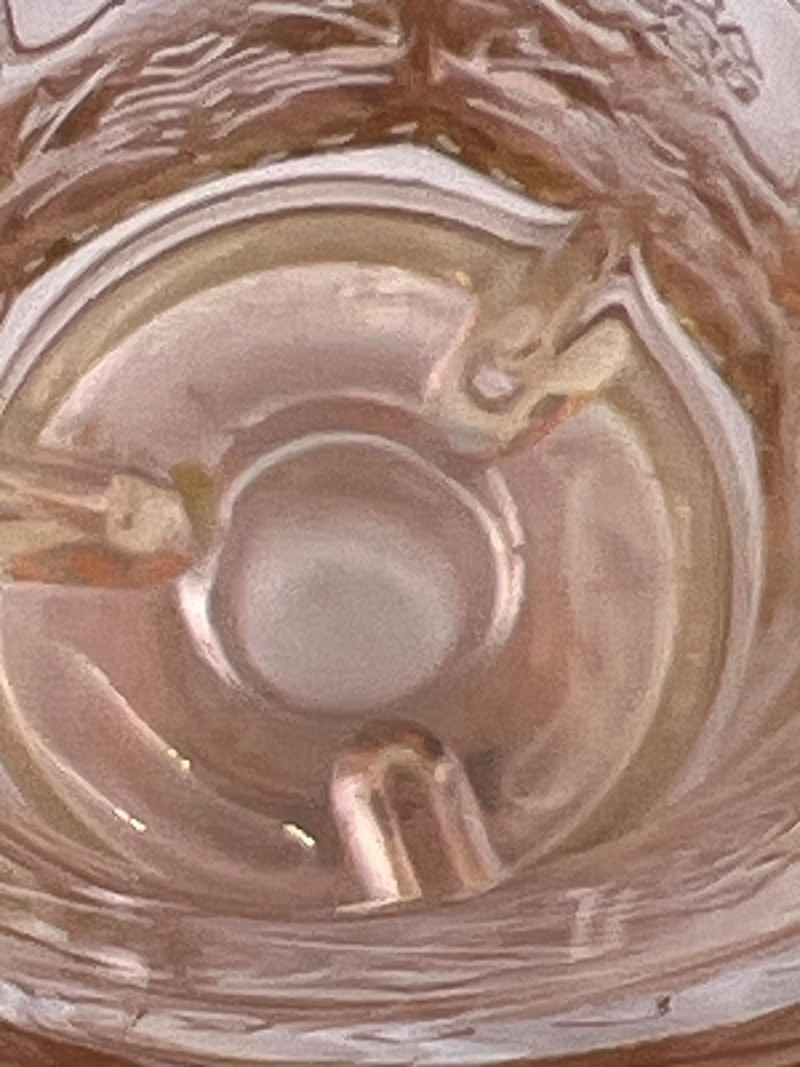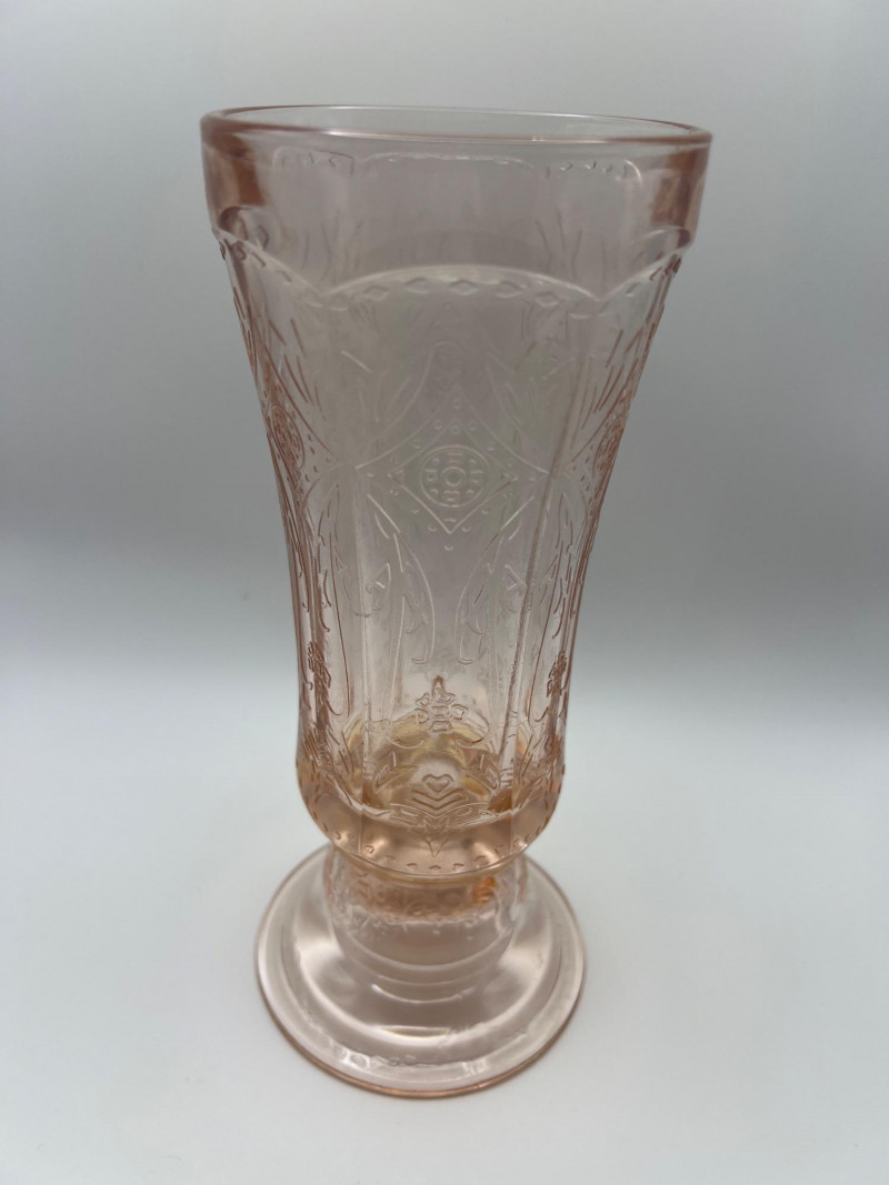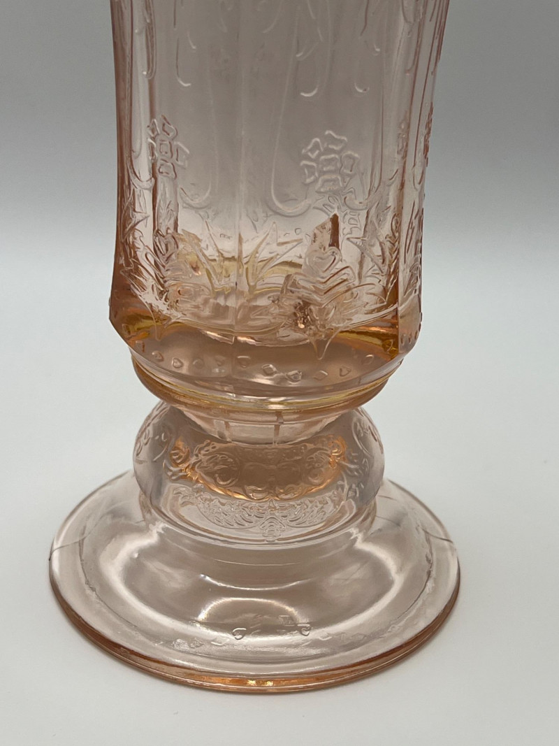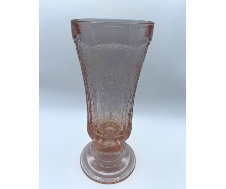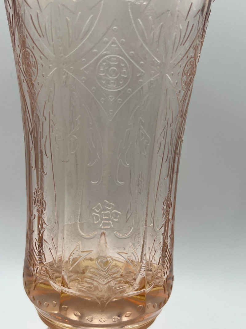 A pink depression style glass hurricane vase featuring the intricate Madrid scroll and floral pattern. Originally this design was introduced by Federal Glass in 1932 during the Great Depression. Indiana Glass Company acquired the molds and reissued the pattern under the name Recollection. This version was also popular in the 1970s and 1980s. It is unverified as to which era this vase originates.