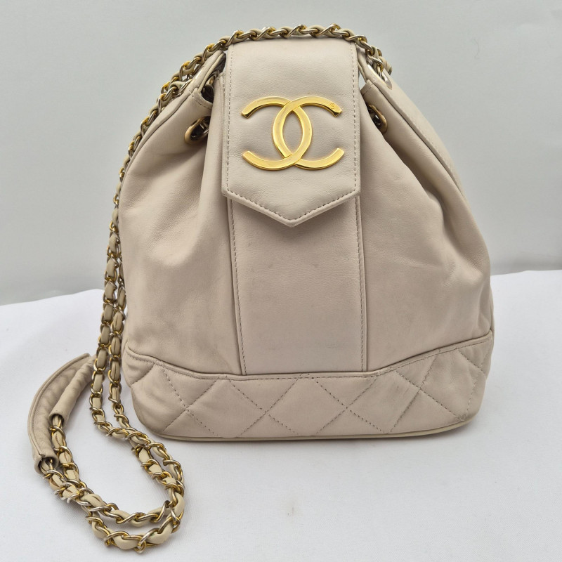 Lot # 8 - Vintage Chanel-Inspired (Replica) Lambskin Drawstring Bag, Light Beige