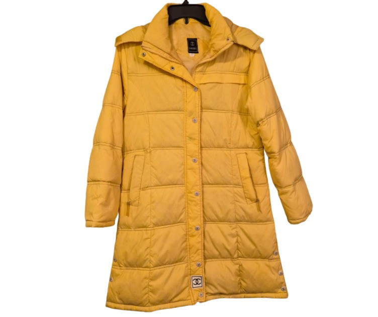 Turn heads in this Chanel-style yellow nylon puffy coat, a bold winter essential with unmistakable designer-inspired details. Crafted in a vibrant quilted nylon, this oversized coat features a roomy hood, snap-button front, and signature zipper pulls on the front pockets—each element echoing the luxury of Chanel’s iconic outerwear. Double CC logo snaps that add instant cachet and collector appeal. While this piece is not authenticated, its styling and finish evoke the spirit of high-fashion winterwear from the Lagerfeld era. Sized XXL for dramatic silhouette and comfort, it’s perfect for layering or making a solo statement. Whether you're curating a vintage-inspired wardrobe or seeking standout street style, this coat delivers warmth with unmistakable flair. Please look at all photos for condition. Since it is vintage, it is not mint - couple spots on front and hood tie needs to be fixed but do not see any rips, holes or tears.