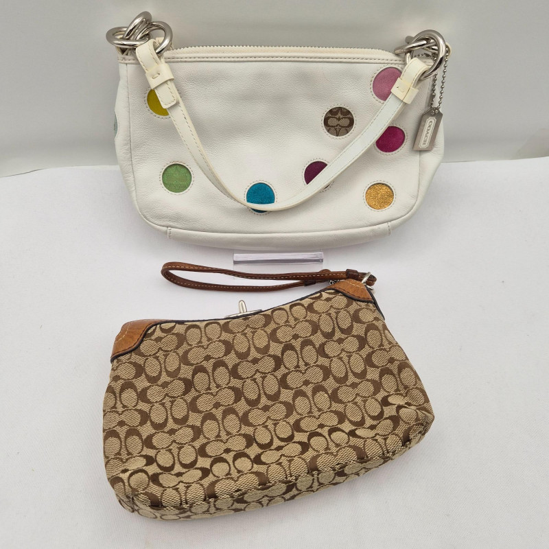 Charming pair of authentic Coach wristlet bags, each showcasing the brand’s signature craftsmanship and playful sophistication. The first is an off-white mini leather wristlet with a zip-top closure and clean brown signature lining. A pattern of colorful dot cut-outs that add a whimsical pop to the sleek silhouette. Measuring approximately 8.5" x 5.5" x 1.5", it’s perfect for essentials with a touch of personality. The second is a two-tone brown wristlet in Coach’s classic signature cotton canvas, trimmed in leather and secured with a twist clasp closure. Sized at 7.5" x 5" x 1.5", it offers timeless style and everyday versatility.