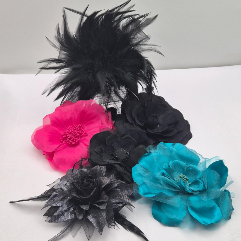 Stunning bouquet of handcrafted camellia & floral brooches and hair clips, each blooming with bold personality and couture-level detail. Designed for fashionistas, stylists, and collectors alike, this set includes six oversized floral accessories made from a luxe mix of satin, taffeta, velvet, batting, and feathers. Highlights include: Each piece is backed with a dual clip/brooch pin, making them versatile for hair, hats, lapels, scarves, or even handbags. Whether you're dressing for a gala, styling a photoshoot, or curating a vintage-inspired wardrobe, this lot delivers fashion-forward flair with handcrafted soul.