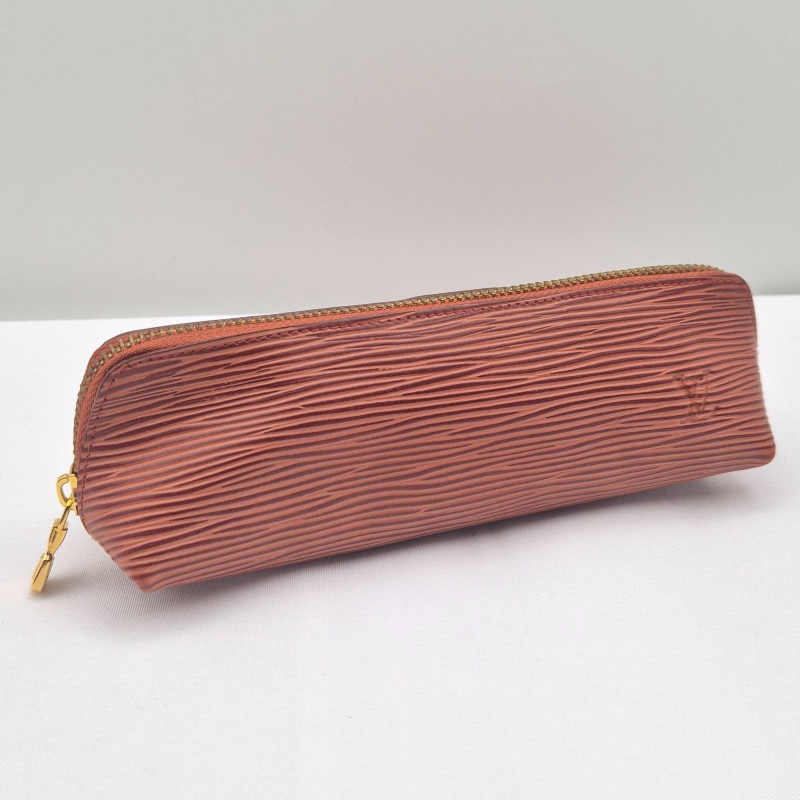 Designer-inspired Louis Vuitton glasses or accessories case, crafted in rust brown leather or leather-like material with a textured epi-style lined design. The sleek silhouette and 3/4 zipper closure make it both functional and fashion-forward—ideal for storing eyewear, cosmetics, or small essentials. While this item is not authenticated, it channels the refined aesthetic of Louis Vuitton’s classic epi leather line.