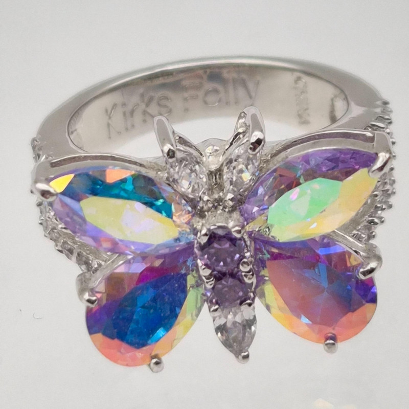 Exquisite and whimsical butterfly ring by Kirks Folly, known for their enchanting, fairy-tale inspired designs. This raised butterfly silhouette is adorned with Swarovski Aurora Borealis crystals, casting a kaleidoscope of shimmer with every movement. Crafted in a silver-tone setting, the butterfly’s wings sparkle with iridescent brilliance, while the sculpted body adds depth and drama. Size 7