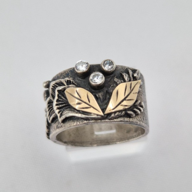 Lot # 25 - Artisan 925 Silver Ring 14k Gold Leaf Accents