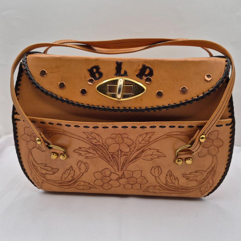 Step into the spirit of the 1970s with this fabulous hand-tooled tanned leather handbag, a piece that blends rugged artistry with refined structure. Crafted with care and unmistakable vintage flair, this bag features: Measuring approx. 11" x 8" x 3.5"