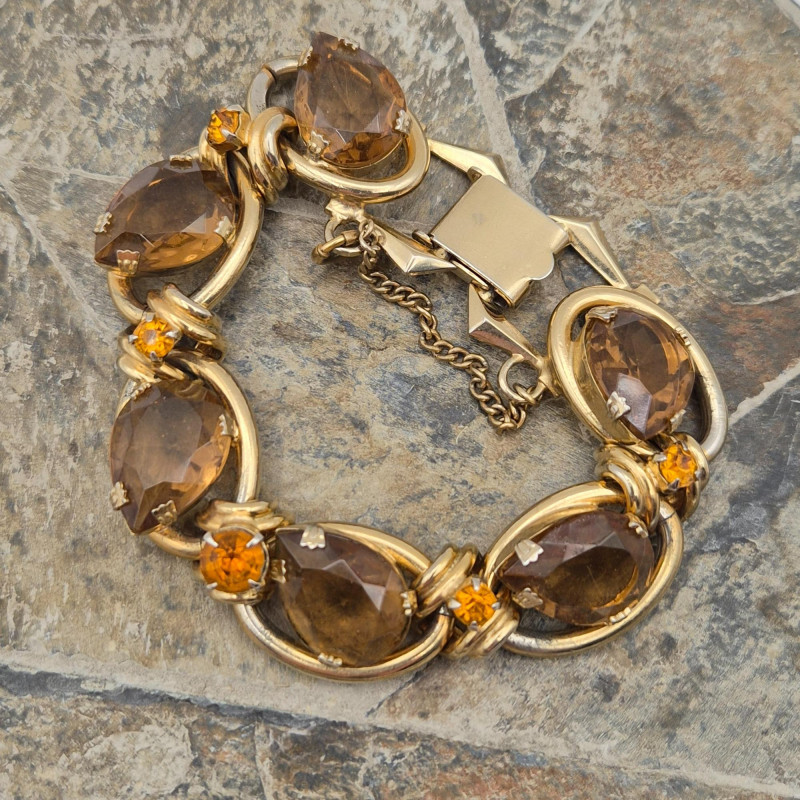 A radiant showpiece that captures the warmth and glamour of vintage costume jewelry- Stunning vintage rhinestone bracelet adorned with substantial golden-brown topaz-colored tear drop stones, each set in a classic open-back setting to maximize light reflection and depth. The stones are prong-set for security and brilliance, creating a rich, amber-toned sparkle that evokes mid-century elegance.
