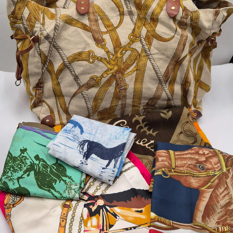 Rustic-chic Miu Miu cotton canvas tote paired with five pre-loved equestrian-themed fashion scarves, each rich in color, texture, and visual storytelling. The Miu Miu tote features: Complementing the tote are five scarves in silk, viscose, and polyester blends: