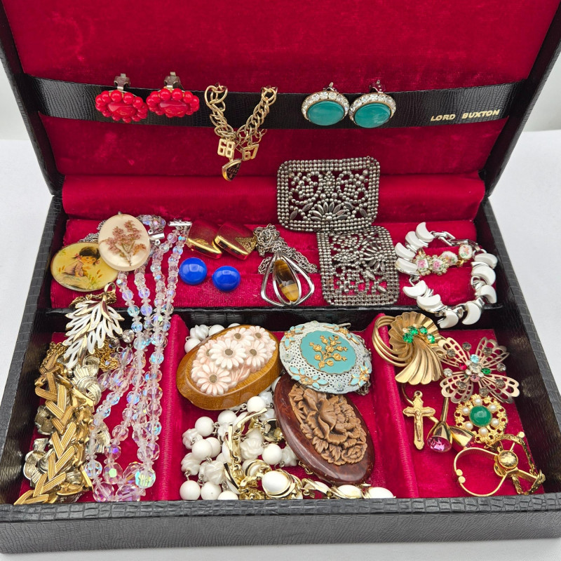 Assortment of 1950s–1960s vintage jewelry, housed in a classic Lord Buxton jewelry box. This collection blends playful kitsch with timeless craftsmanship, perfect for collectors, stylists, or anyone drawn to the charm of mid-century accessories. Included in this lot: