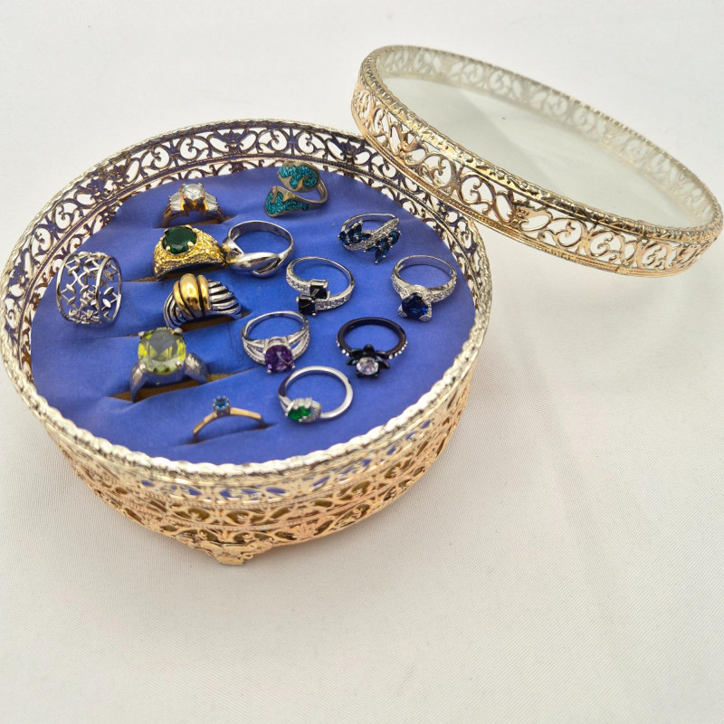 Vintage-style vanity jewel box with a glass top and ornate metal frame, filled with a glittering mix of fashion and vintage rings. From bold cocktail styles to delicate bands, this assortment offers variety in size, stone color, and design. A few are stamped 925 (likely plated), adding a hint of intrigue. The box measures approx. 5.5" round x 2.5" tall
