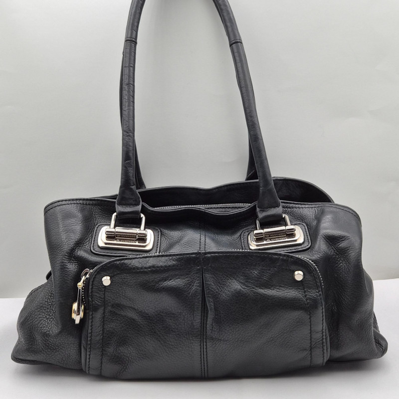 A refined yet functional handbag from B. Makowsky, known for its luxurious leathers and timeless silhouettes. This baguette-style bag is crafted in supple black pebbled leather and lined with the brand’s signature brown and black animal print interior—adding a touch of wild charm to its classic exterior. Designed for both style and organization, the bag features three compartments: two with magnetic snap closures and a center with full zipper closure. Thick padded leather straps (11" handle length) offer comfortable carry, while four metal bottom feet provide structure and durability.