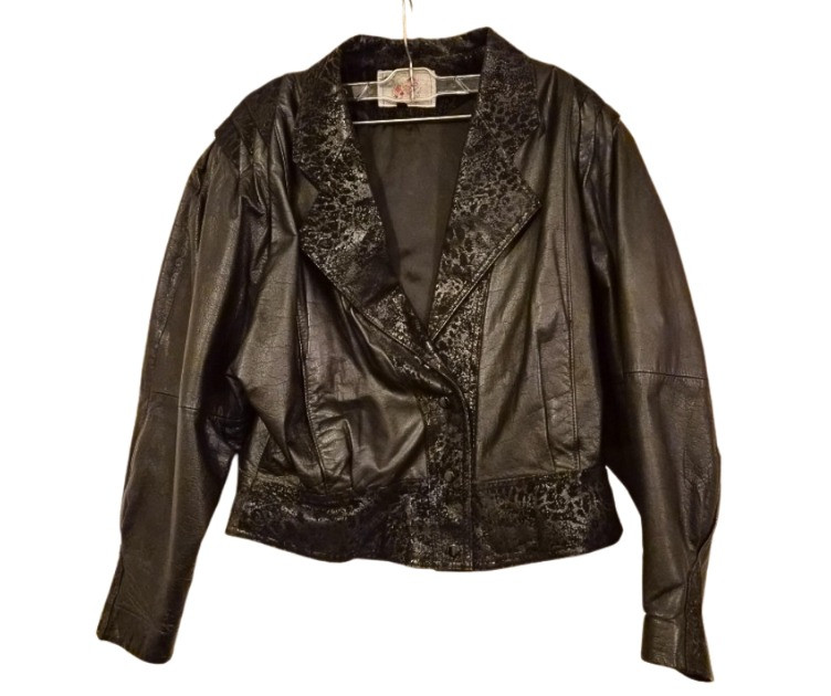 Bold throwback to 1980s fashion—structured yet soft, with that unmistakable puffy silhouette and tactile contrast. A quintessential 1980s statement piece, this black leather and suede jacket features a short, puffy silhouette that channels retro edge with wearable comfort. Crafted in a mix of smooth leather and soft suede panels, it offers visual depth and textural contrast that defined the era’s fashion-forward outerwear. Three snap-front closure. Sized Large, the jacket is ideal for layering over knits or pairing with high-waisted denim for a throwback look, this piece delivers bold attitude and timeless cool.