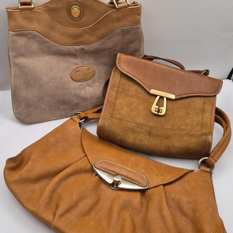 Trio of tan and camel brown handbags, each offering its own take on texture, tone, and timeless style. From designer elegance to vintage character, this lot is ideal for collectors, stylists, or anyone drawn to warm neutrals and classic silhouettes.