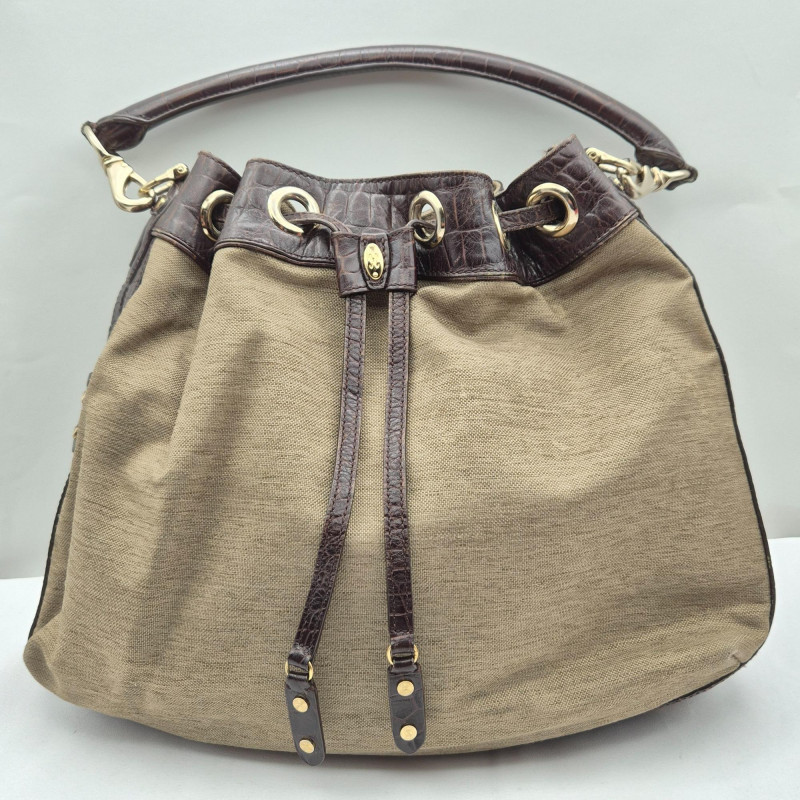 Rustic style and functional drawstring bag from Cole Haan, crafted in olive green cotton canvas with rich leather trim. This piece blends rugged texture with refined detailing, offering a versatile silhouette that transitions effortlessly from city errands to weekend escapes.