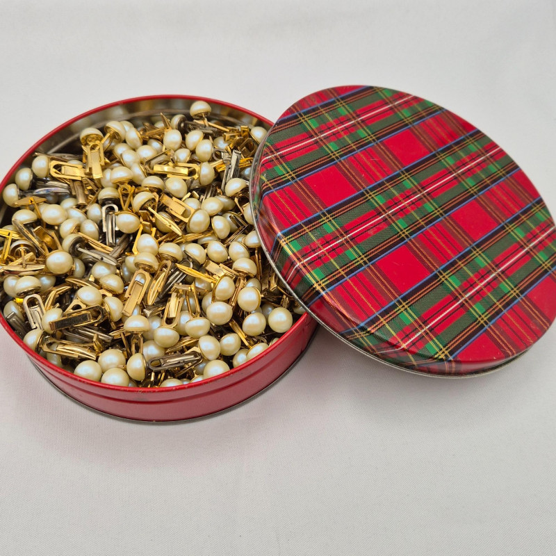 Hundreds of faux pearl cufflinks housed in a charming vintage tin measuring 6.5" in diameter and 2" tall. Whether you're crafting jewelry, designing mixed-media art, or stocking up for resale, this rare stash offers: Perfect for DIY enthusiasts, costume designers, or anyone who sees beauty in bulk. A rare find with room to imagine.