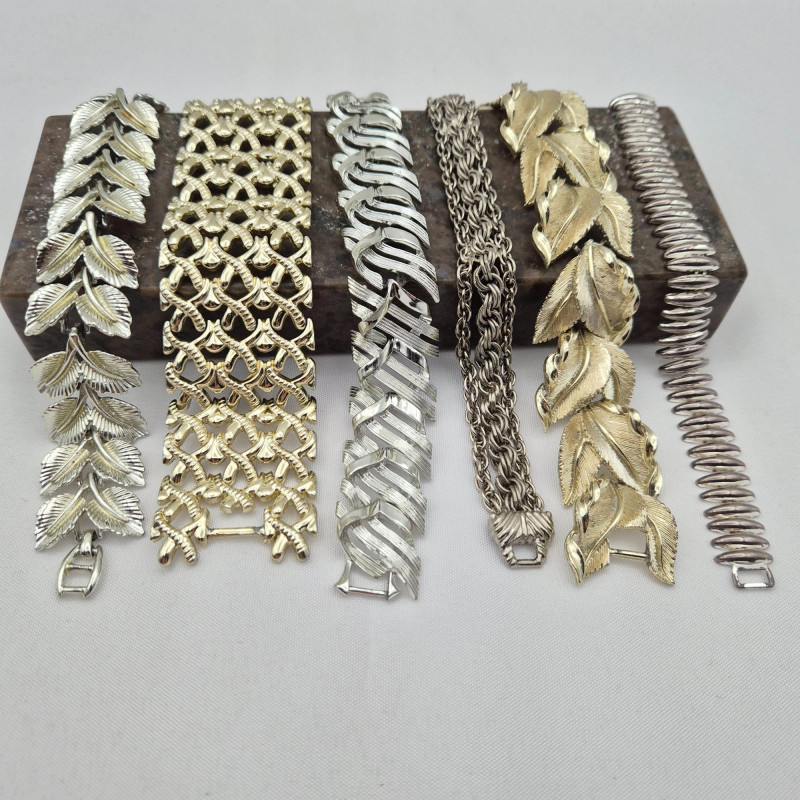 A stylish set of six vintage metal link bracelets, each measuring approximately 7" and crafted by a mix of beloved mid-century and costume jewelry makers. This curated collection includes: