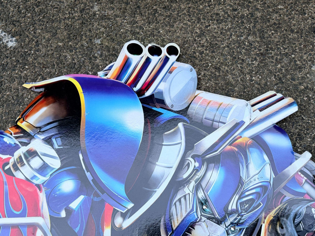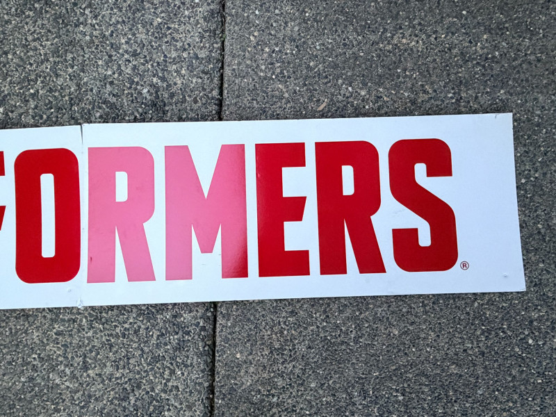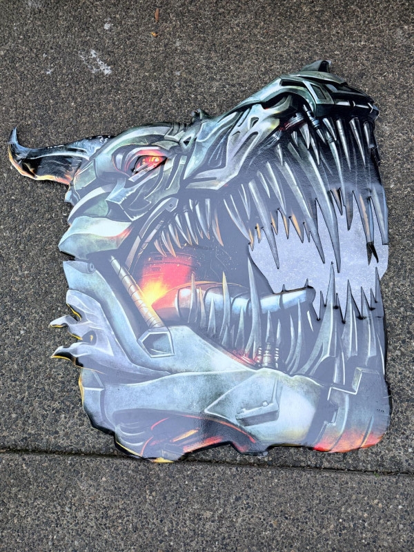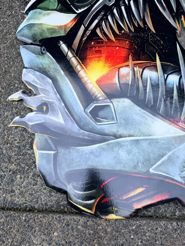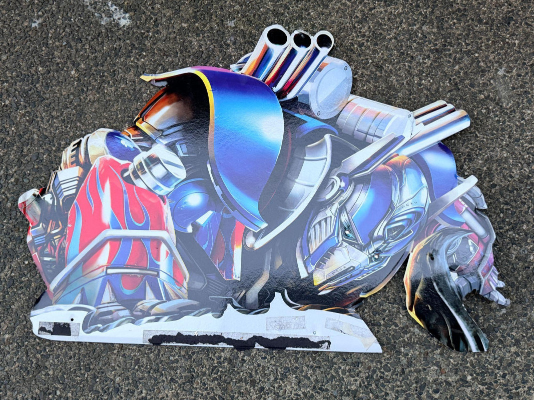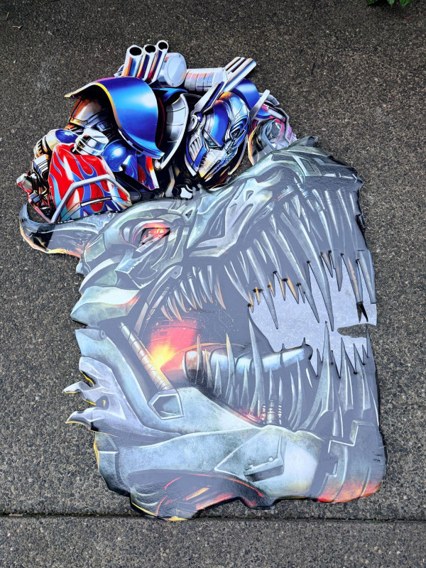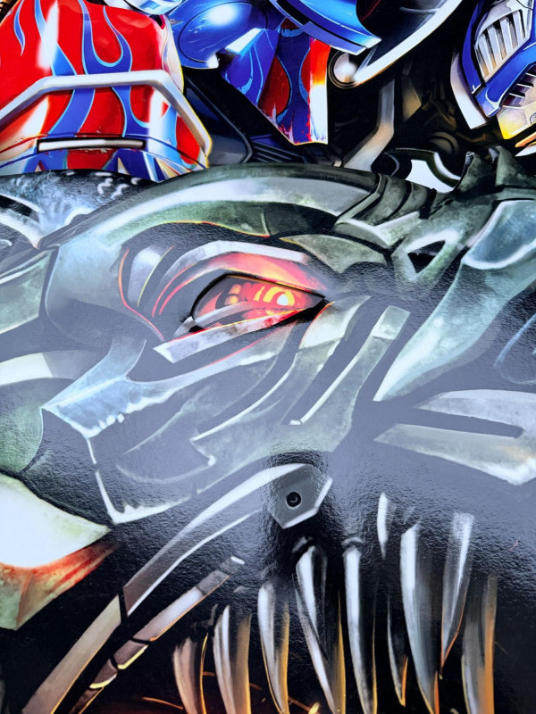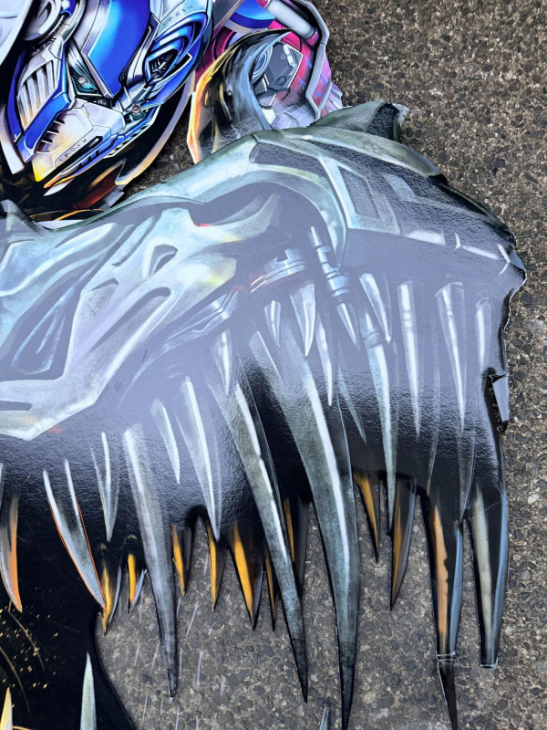 A dynamic duo from Transformers: Age of Extinction, this display set features Optimus Prime alongside a dinosaur-style Transformer in a bold, cinematic pose. Designed for visual impact, the figures evoke the high-stakes energy of the film and the enduring legacy of the franchise. Ideal for collectors, fans, or themed decor, this lot offers a striking tribute to the battle-ready heroes of Cybertron. Grimlock and Optimus Prime are two pieces but are also shown connected in pictures: Transformer sign in two pieces - 90 inches long (45" length each piece) and 17 inches tall