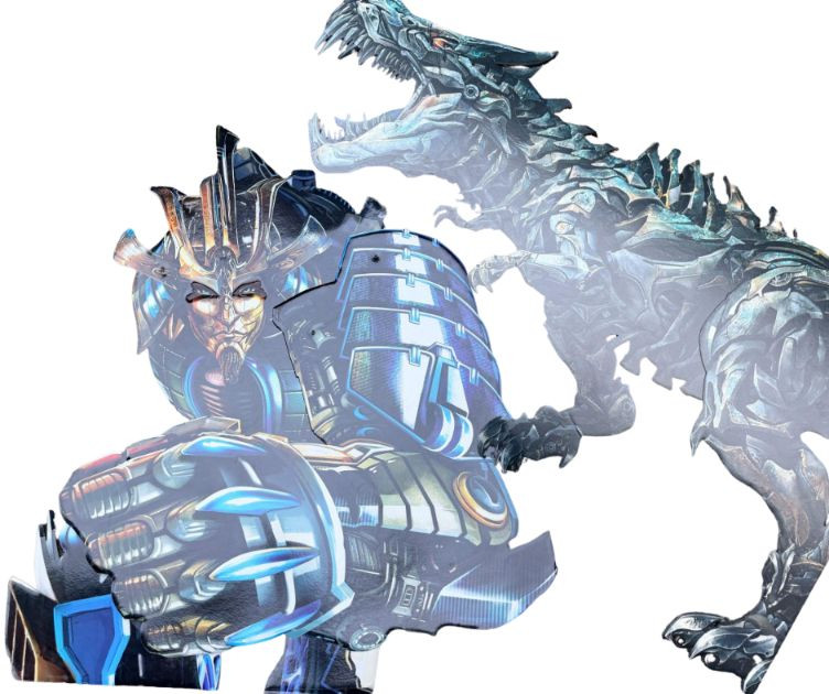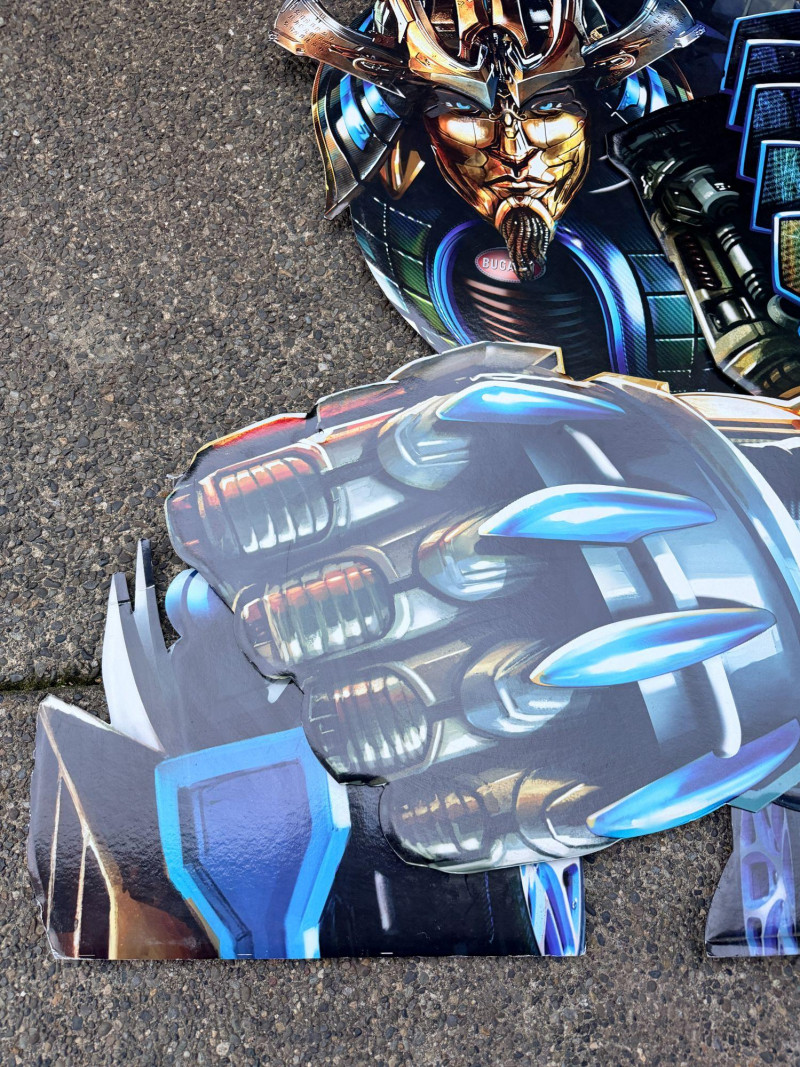 A striking pair of Transformers: Age of Extinction promotional displays featuring the sleek Bugatti Veyron (Drift) and a towering Dinobot silhouette. These cardboard standees were designed for retail or theatrical environments and showcase the bold, metallic styling of the Bayverse era. No figures included—these are display-only pieces, ideal for collectors of cinematic memorabilia, franchise branding, or visual storytelling.