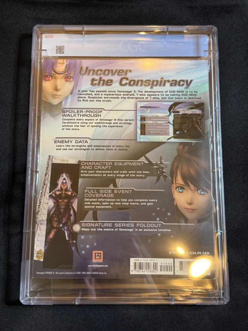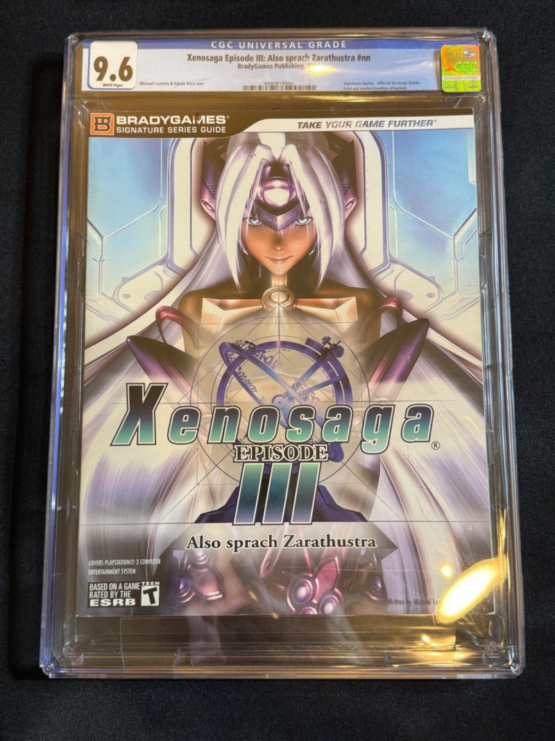 A CGC 9.6 graded copy of the Xenosaga Episode III strategy guide. This beautifully illustrated guide offers deep lore, gameplay walkthroughs, and character insights from the final chapter of the acclaimed sci-fi RPG trilogy. Ideal for fans of JRPG storytelling, artbook-style guides, or CGC-graded media, this piece bridges gameplay and narrative with collector-grade presentation.
