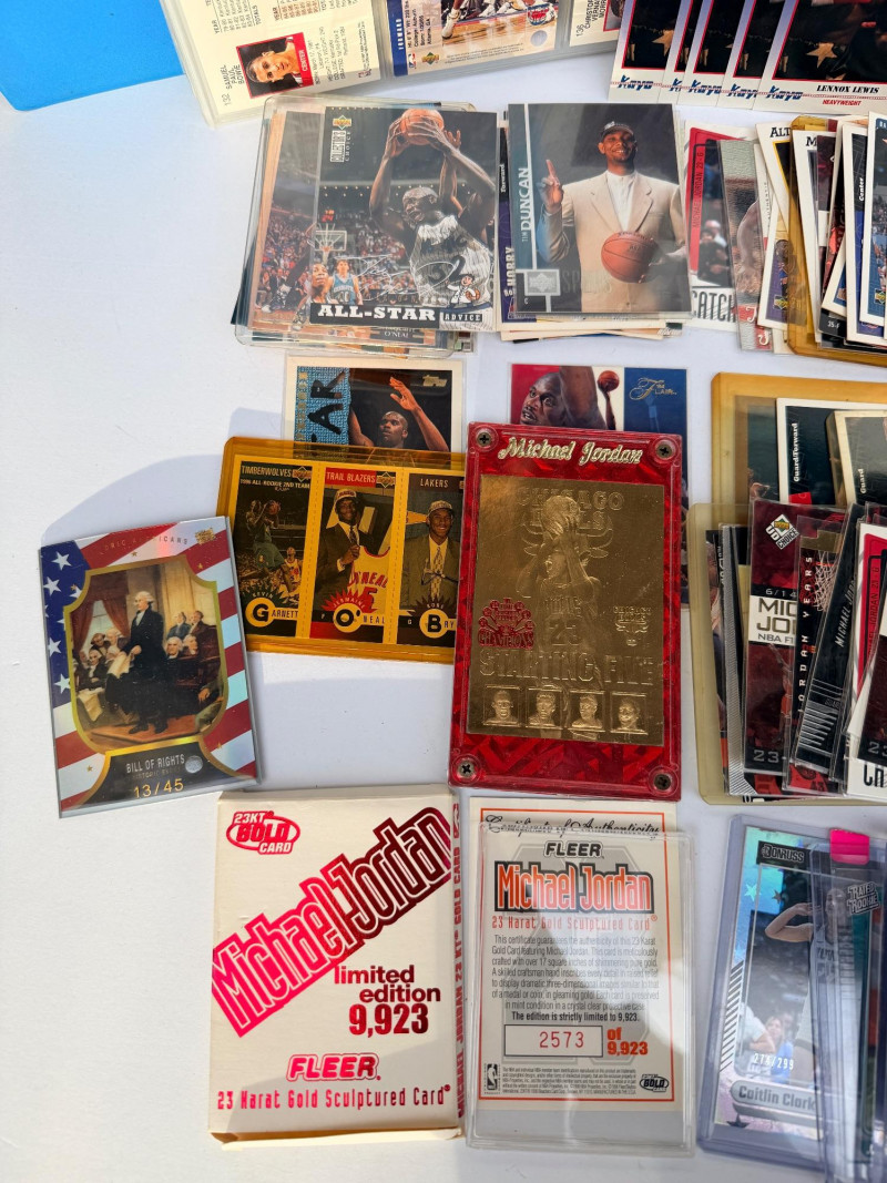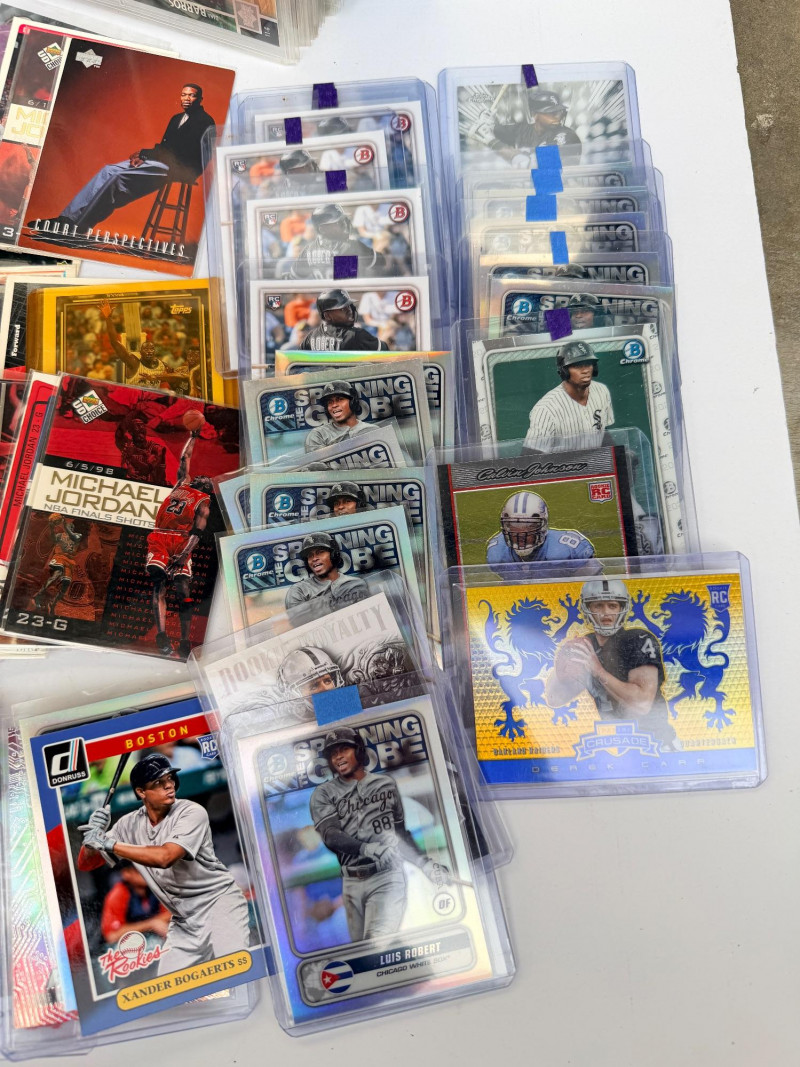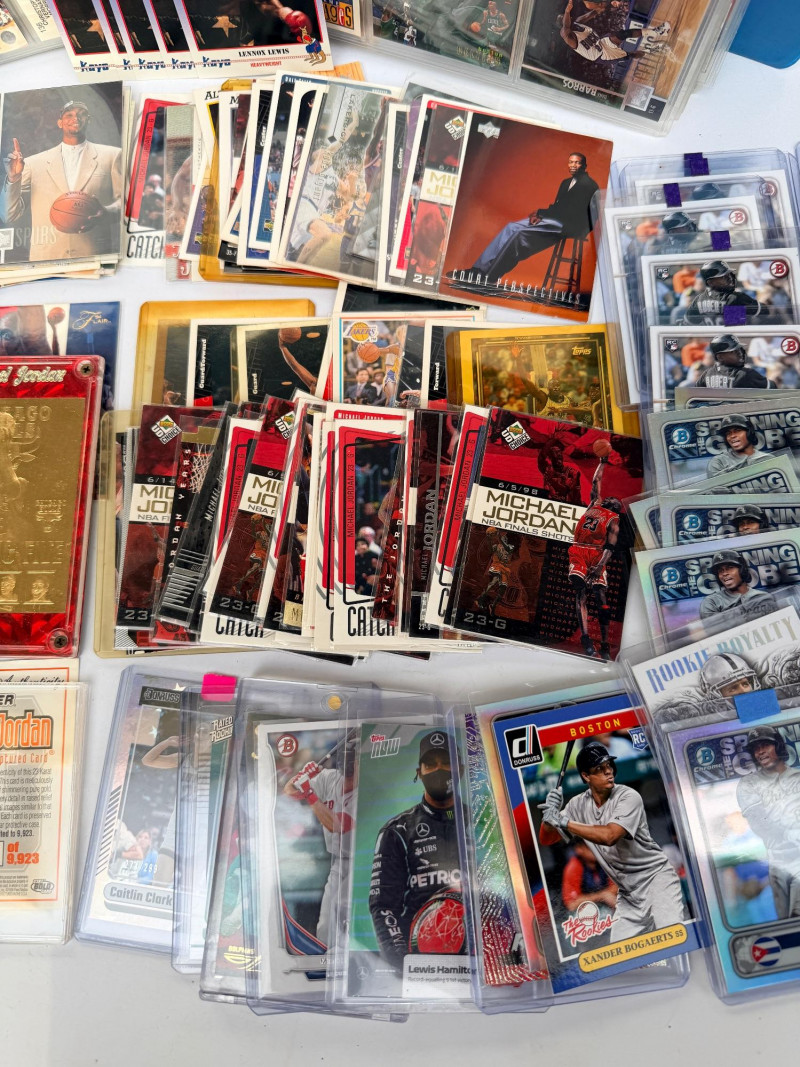 A vibrant mix of sports trading cards featuring legends from basketball, baseball, and football. This lot includes standout names like Michael Jordan, Ken Griffey Jr., and Dan Marino, alongside a variety of team sets, inserts, and era-spanning highlights. From slam dunks to home runs and game-winning drives, each card captures a moment of athletic brilliance. Ideal for collectors seeking nostalgic depth, rookie potential, or iconic faces that defined decades of sport. Condition varies, with select cards ready for display or portfolio building.