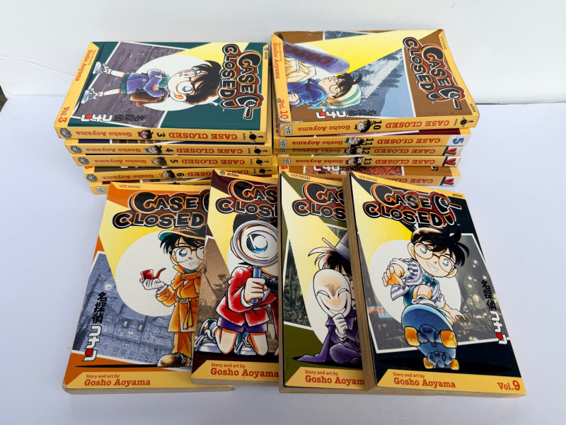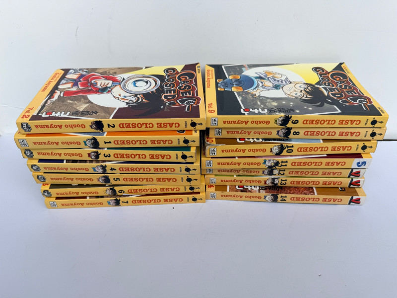 An assorted lot of Case Closed manga volumes, featuring the beloved teen detective Conan Edogawa as he solves intricate crimes with wit and charm. This long-running mystery series blends suspense, humor, and clever storytelling—ideal for fans of classic whodunits and anime-inspired art. A great starter bundle for new readers or a nostalgic addition for longtime collectors of detective manga. Volumes 1 through 14.