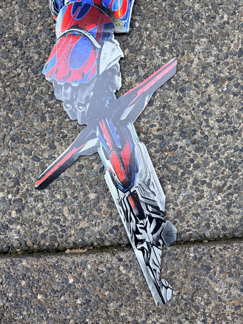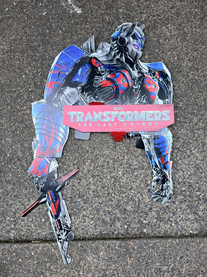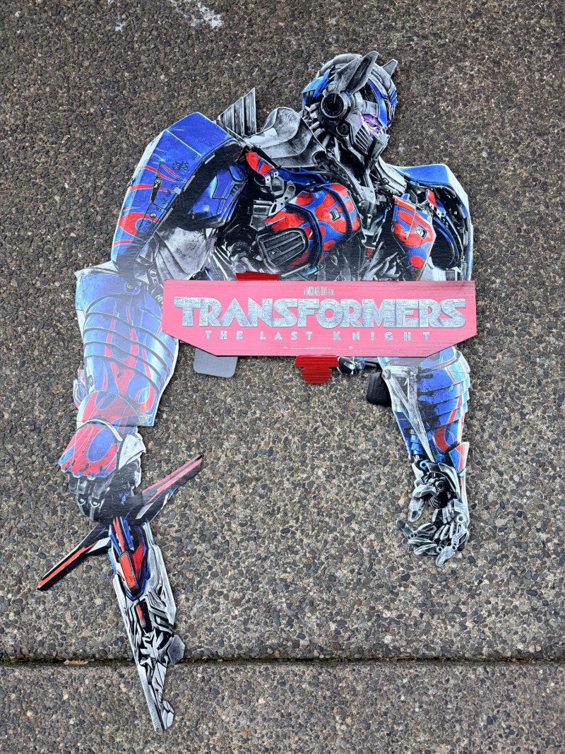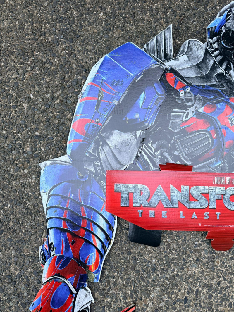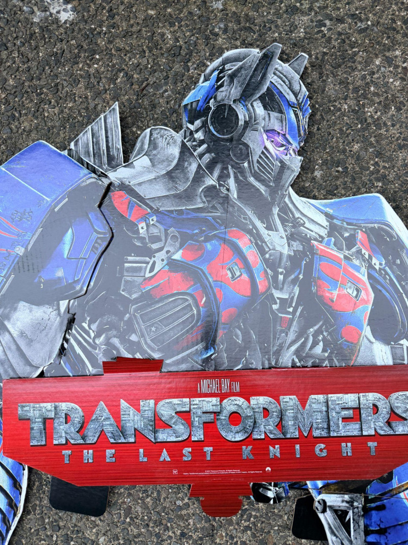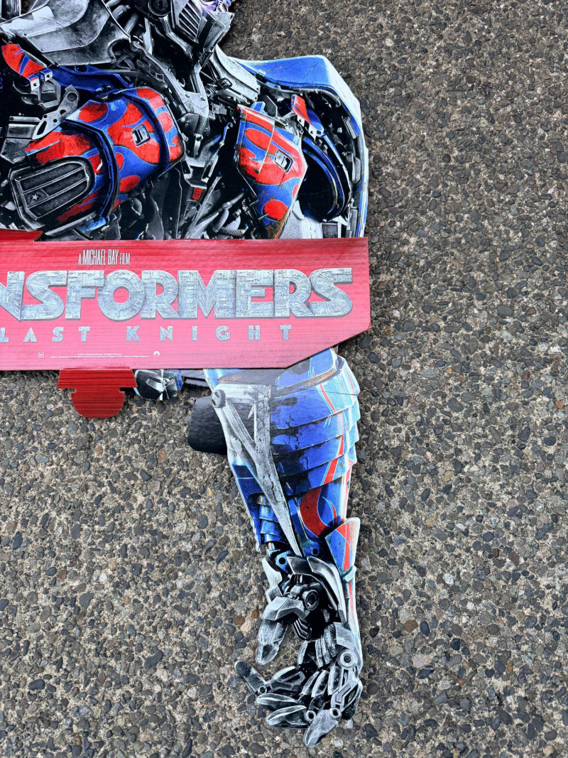 An oversized promotional display panel from Transformers: The Last Knight, originally used to advertise the DVD release. This is the top half of a larger retail display, featuring bold character art and stylized branding from the film’s campaign. Dimensions: 50" long × 30" wide Printed on rigid material suitable for wall mounting or showroom presentation Ideal for collectors, media rooms, or pop culture installations A dramatic tribute to the final chapter in Michael Bay’s Transformers saga, this piece captures the explosive energy and visual scale of the franchise.