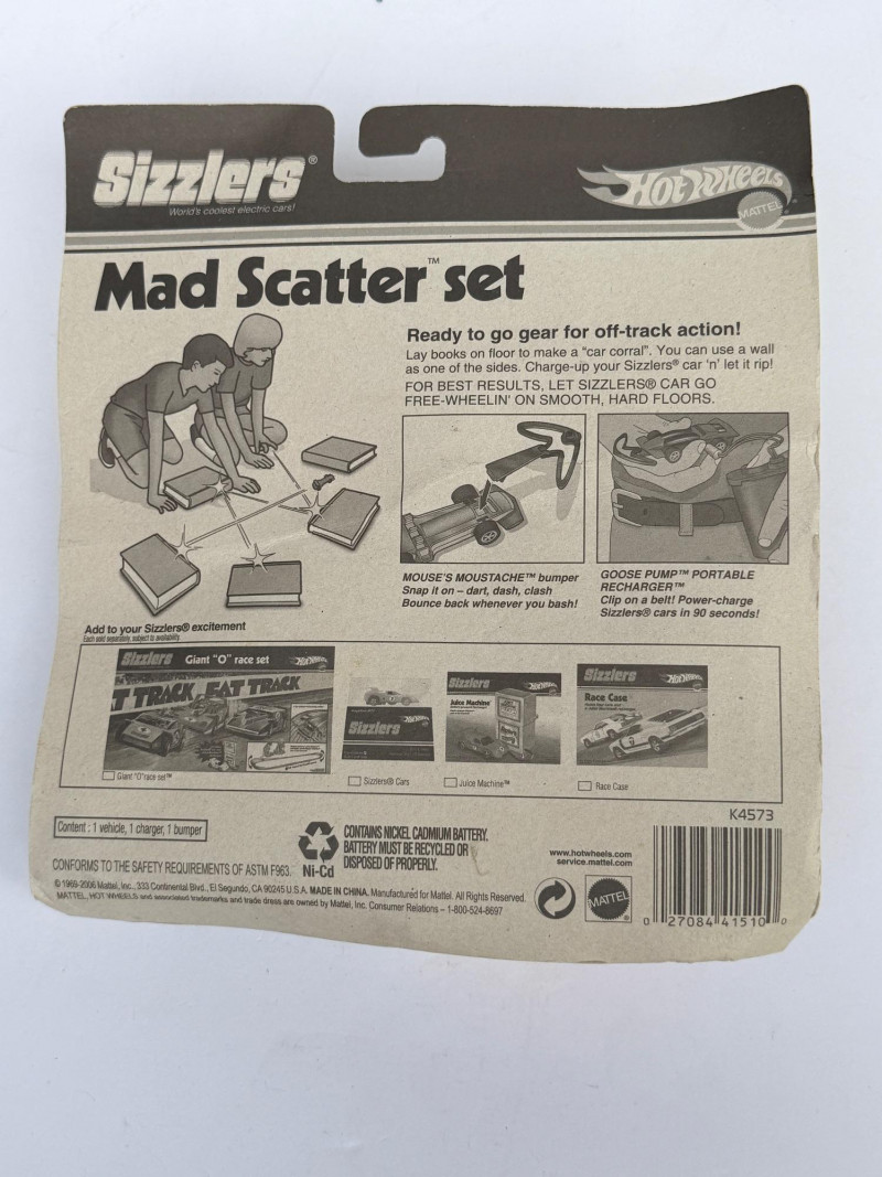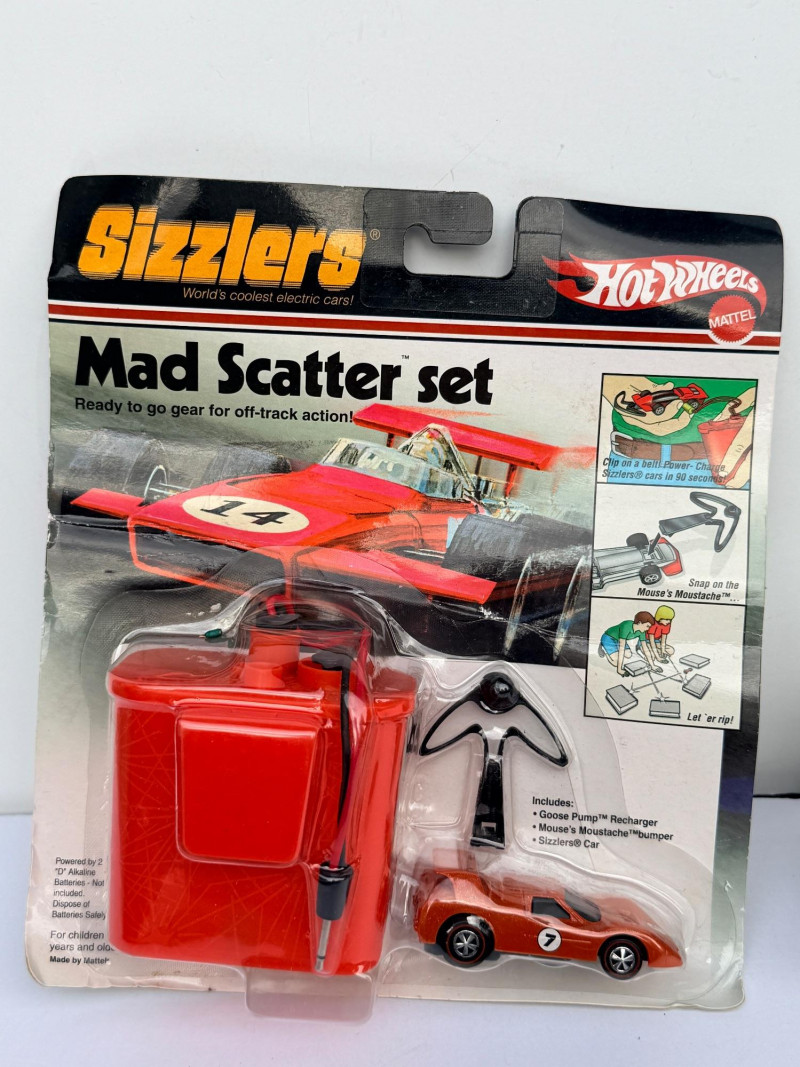 A thrilling throwback to the golden age of Hot Wheels, this vintage Sizzlers lot includes the Mad Scatter track set and one original Sizzlers car. Designed for high-speed, battery-powered action, Sizzlers cars were a 1970s innovation that raced independently—no push required. The Mad Scatter set features dynamic curves and scatter zones that amplify the chaos and excitement of solo racing. Whether you're a longtime Hot Wheels enthusiast or rediscovering childhood favorites, this lot delivers motion, nostalgia, and collector-grade charm.