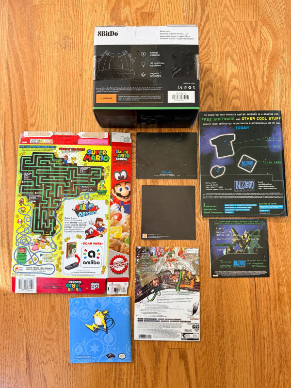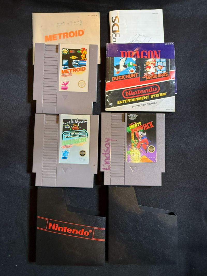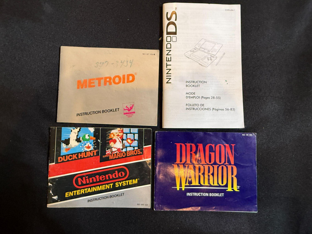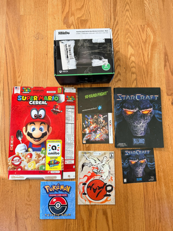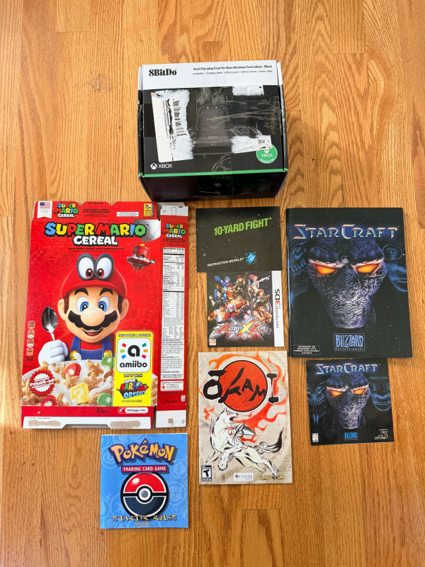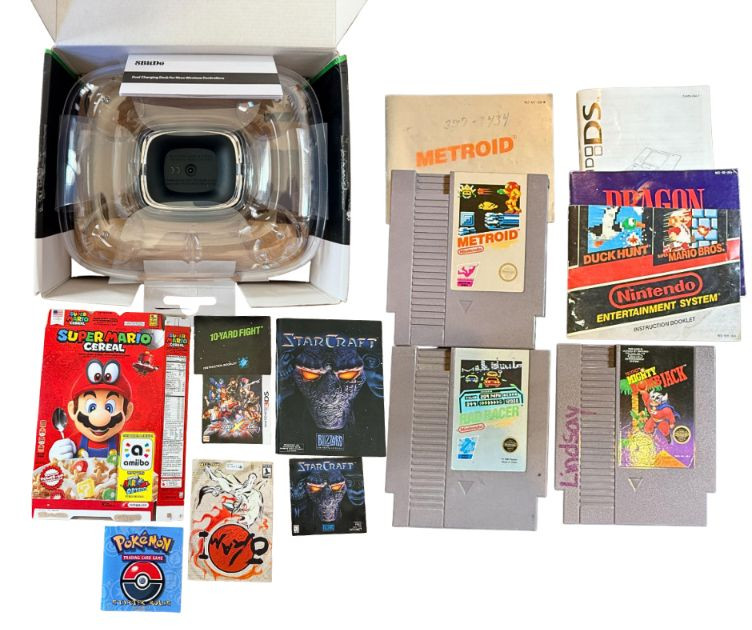 A curated mix of vintage gaming items spanning multiple eras and platforms, ideal for collectors and nostalgia seekers: Nintendo NES cartridges: Metroid, Rad Racer, Mighty Bomb Jack Manuals: Metroid, Dragon Warrior, Nintendo DS, Starcraft, Pokémon, and more Accessories: 8BitDo Dual Charging Block Bonus: Super Mario Cereal box (outer shell only) This lot blends iconic NES titles with a cross-platform selection of manuals and accessories, offering a tactile journey through gaming history. Perfect for display, research, or expanding a retro collection.