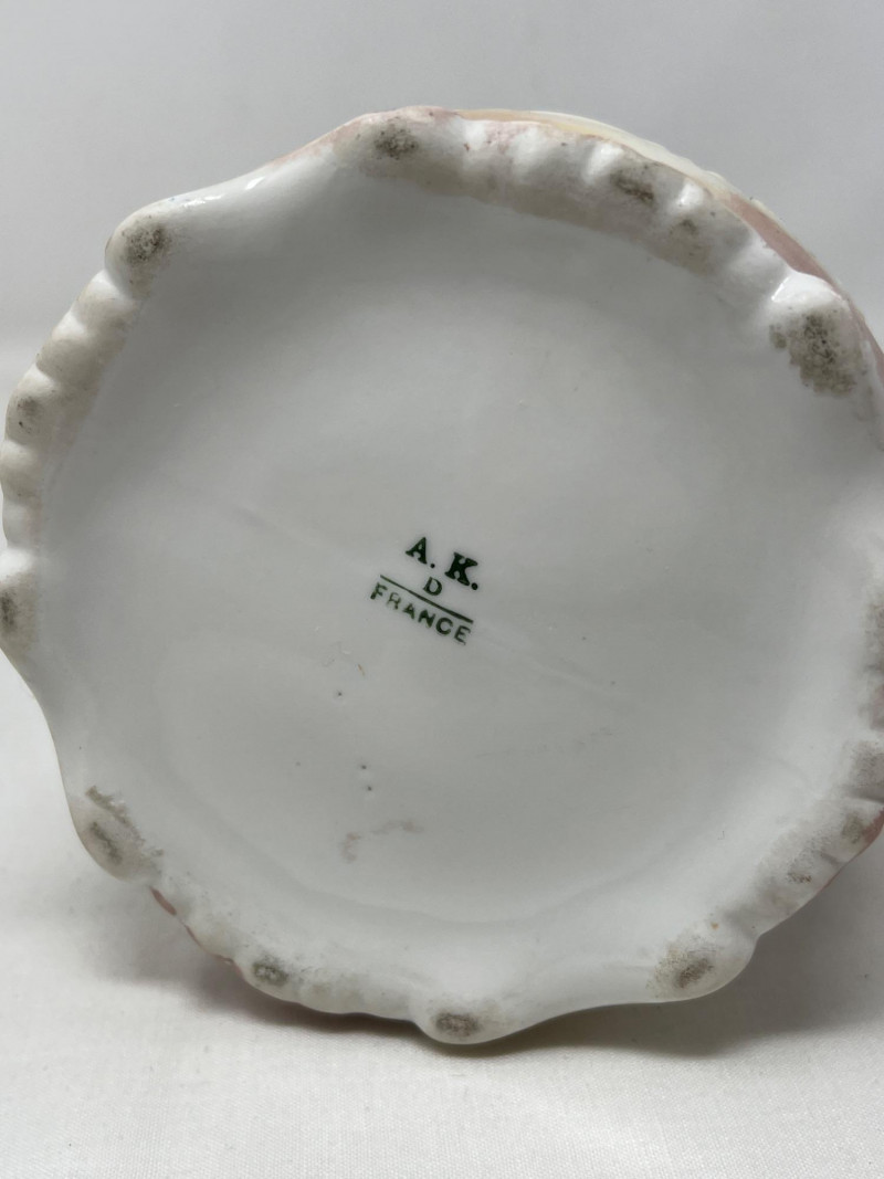 An elegant French porcelain tankard or ewer marked AK Limoges—a refined example of Limoges craftsmanship known for its delicate forms and hand-painted artistry. The piece features a graceful silhouette with ornate handle and spout detailing, likely intended for decorative or ceremonial use. Ideal for collectors of European ceramics, French decorative arts, or Limoges porcelain. The AK mark refers to A. Klingenberg, a known exporter and decorator active in Limoges between the late 19th and early 20th centuries.