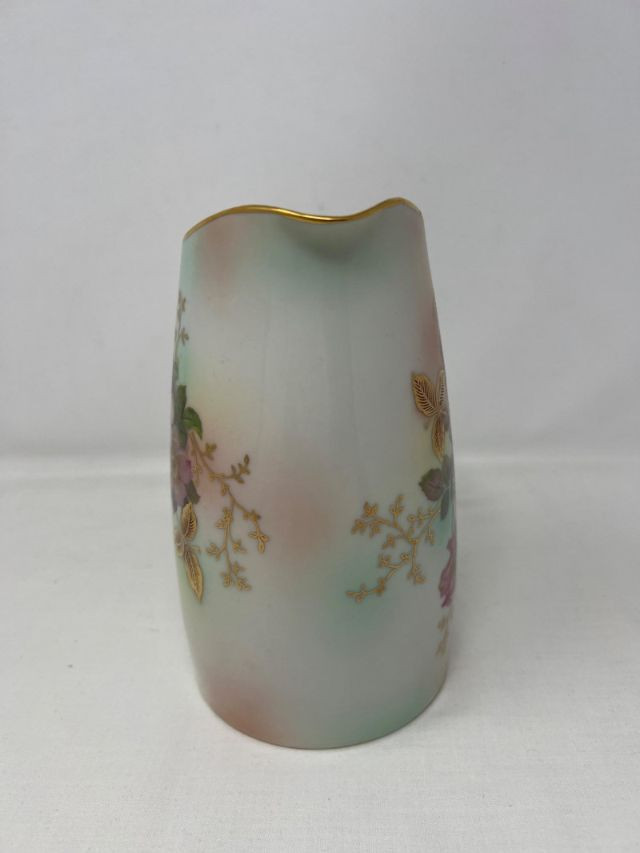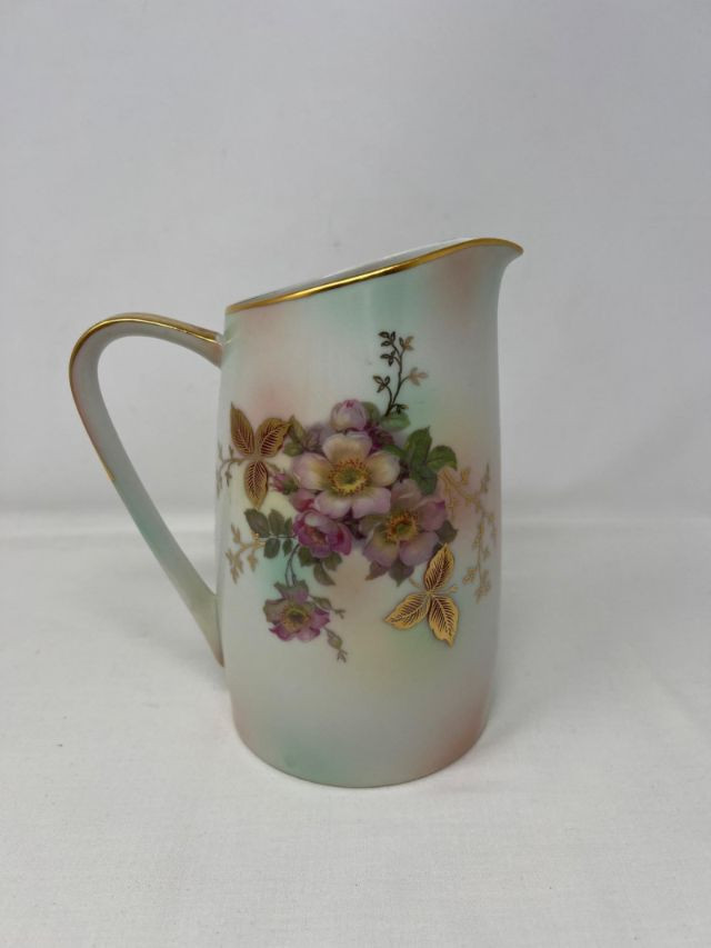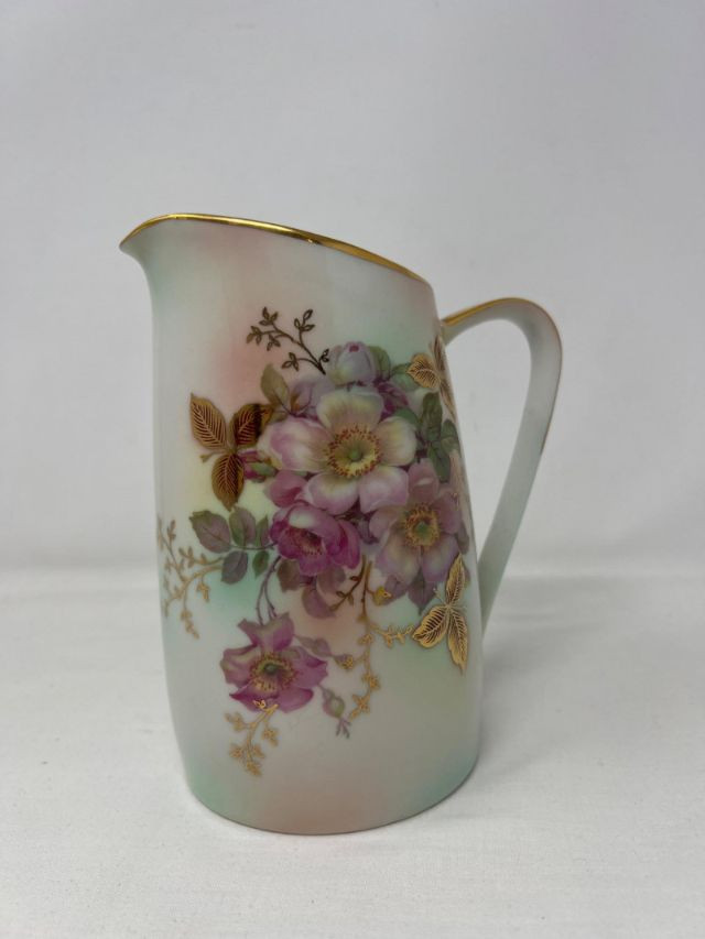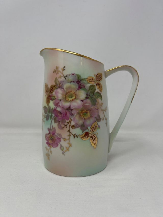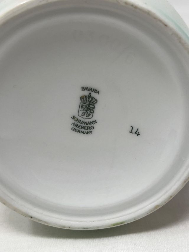 A graceful porcelain pitcher marked Bavaria Schumann Arzberg Germany, featuring the crown and lion emblem used between 1932 and 1944. This mark signifies production during a pivotal era of Schumann’s legacy, when the Arzberg factory was renowned for its refined forms and decorative artistry. The pitcher showcases classic Bavarian styling—likely hand-decorated with floral or cobalt accents, and shaped with elegant curves suited for both display and ceremonial use. A rare find for collectors of European porcelain, especially those drawn to pre-war German craftsmanship.