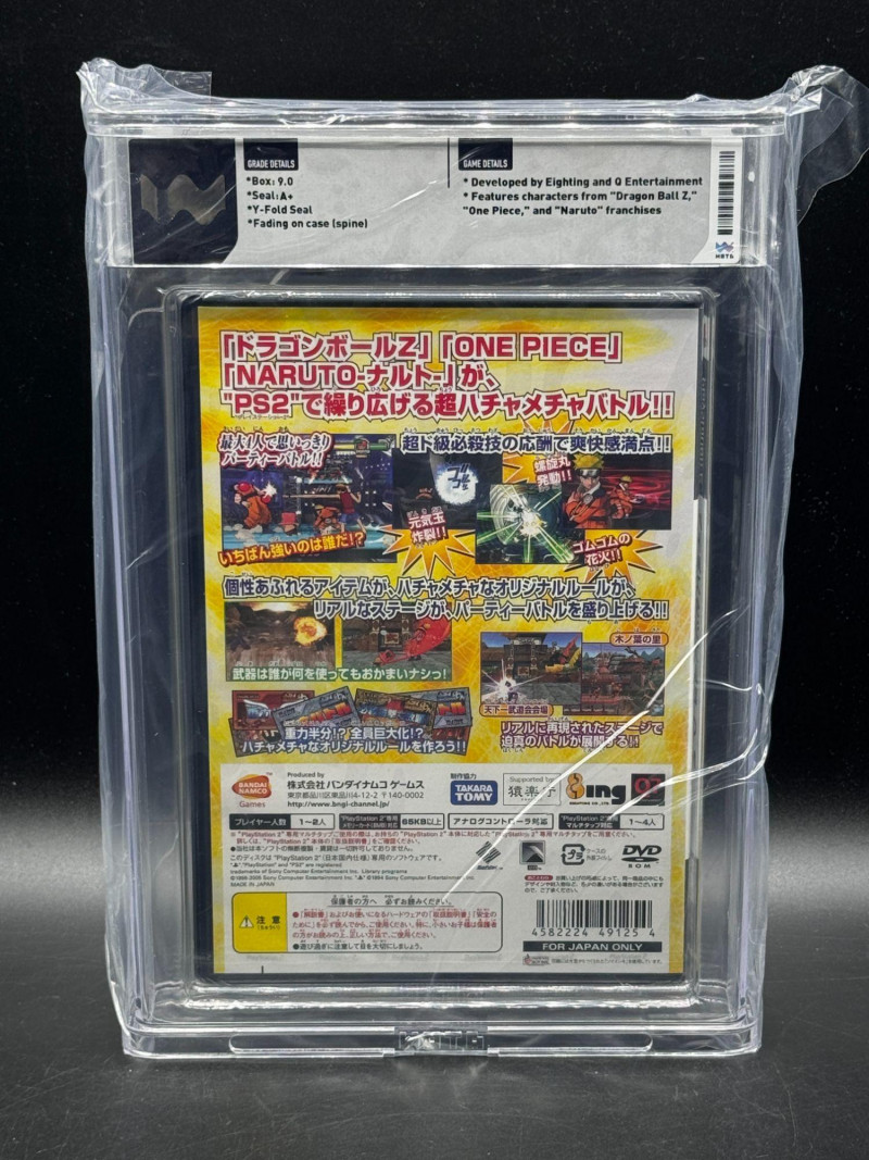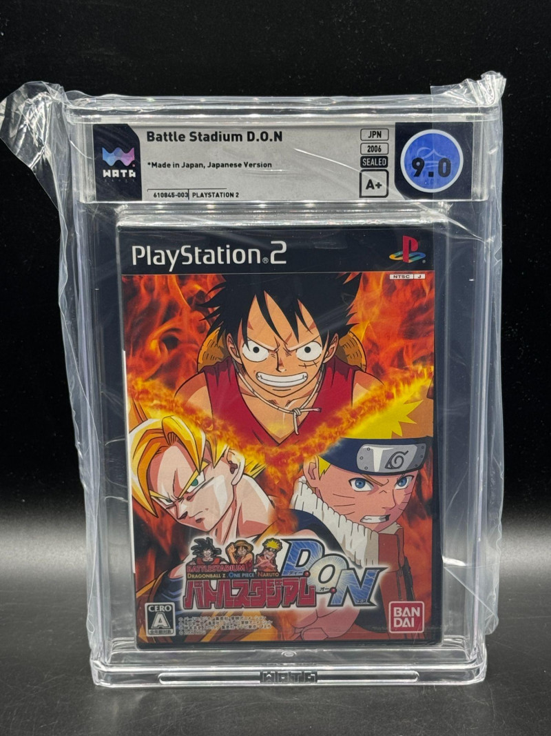 A factory-sealed Japanese edition of Battle Stadium D.O.N for PlayStation 2, professionally graded WATA 9.0 A+. This rare crossover fighting game features characters from three legendary anime franchises: Dragon Ball Z, One Piece, and Naruto. Platform: PlayStation 2 (Japanese release) Condition: Sealed, WATA 9.0 A+ Packaging: Original factory seal, clear WATA case Franchises: Dragon Ball Z, One Piece, Naruto A must-have for anime collectors, fighting game enthusiasts, or sealed-grade investors. This title was never released outside Japan, making it a standout piece for international collectors and crossover fans.