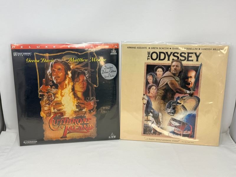A sealed LaserDisc pairing of Cutthroat Island and Odyssey, offering a retro media experience for collectors of vintage formats and cult cinema. Original shrink wrap.