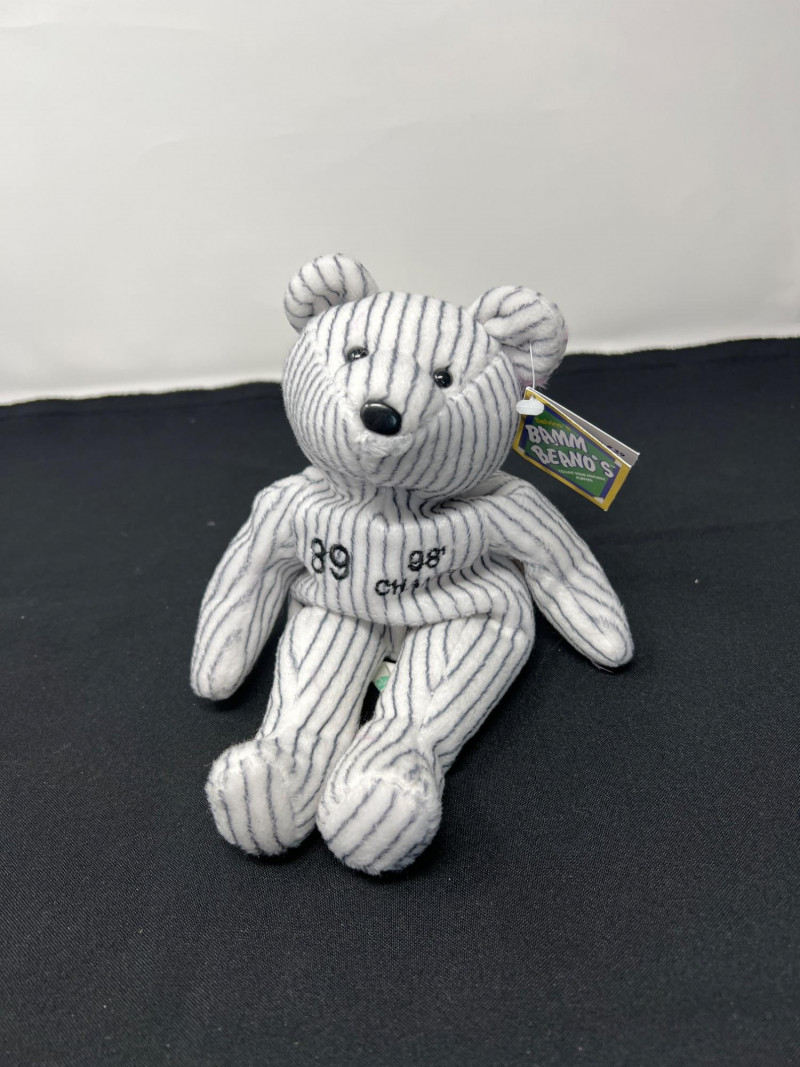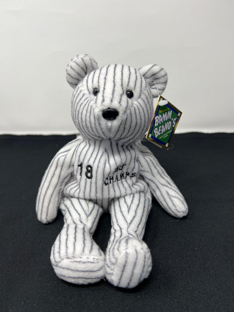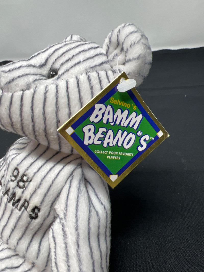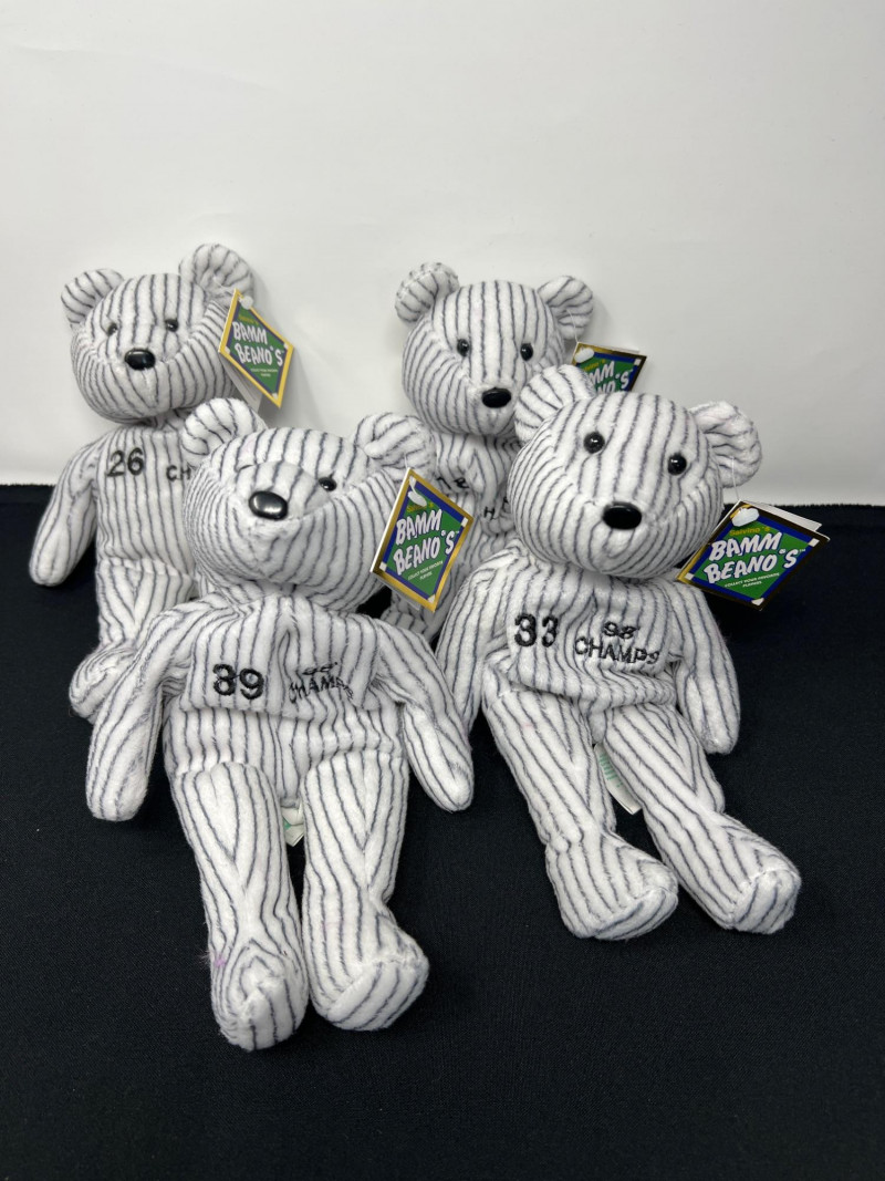 four Bamm Beano’s plush bears by Salvino, Inc., produced in Corona, California. These collectible bears were part of a limited run that blended sports fandom, Americana, and Beanie Baby-era nostalgia. Brand: Salvino’s Bamm Beano’s - Hernandez, Brosius, Strawberry and Wells Origin: Corona, California Quantity: 4 bears