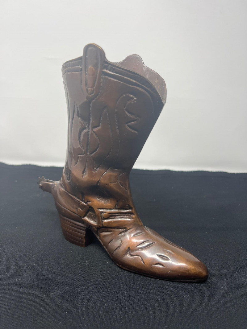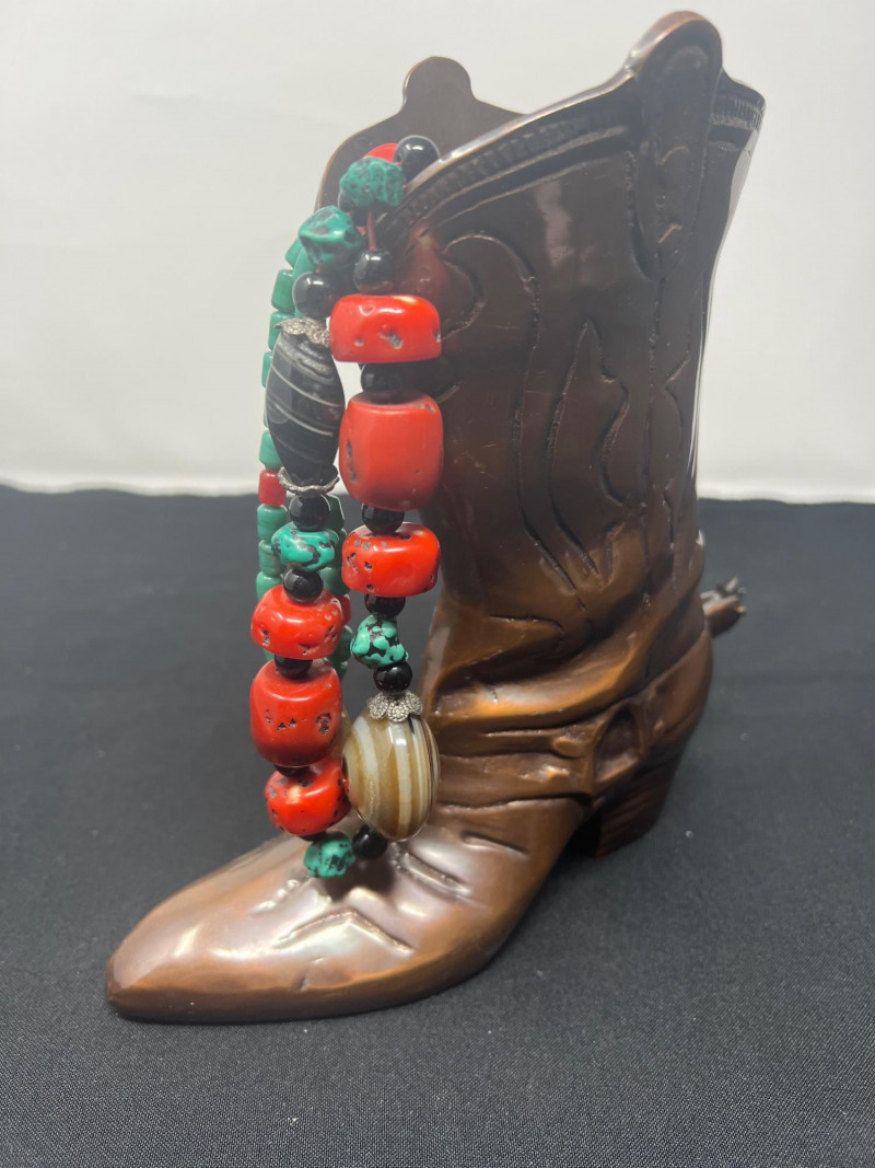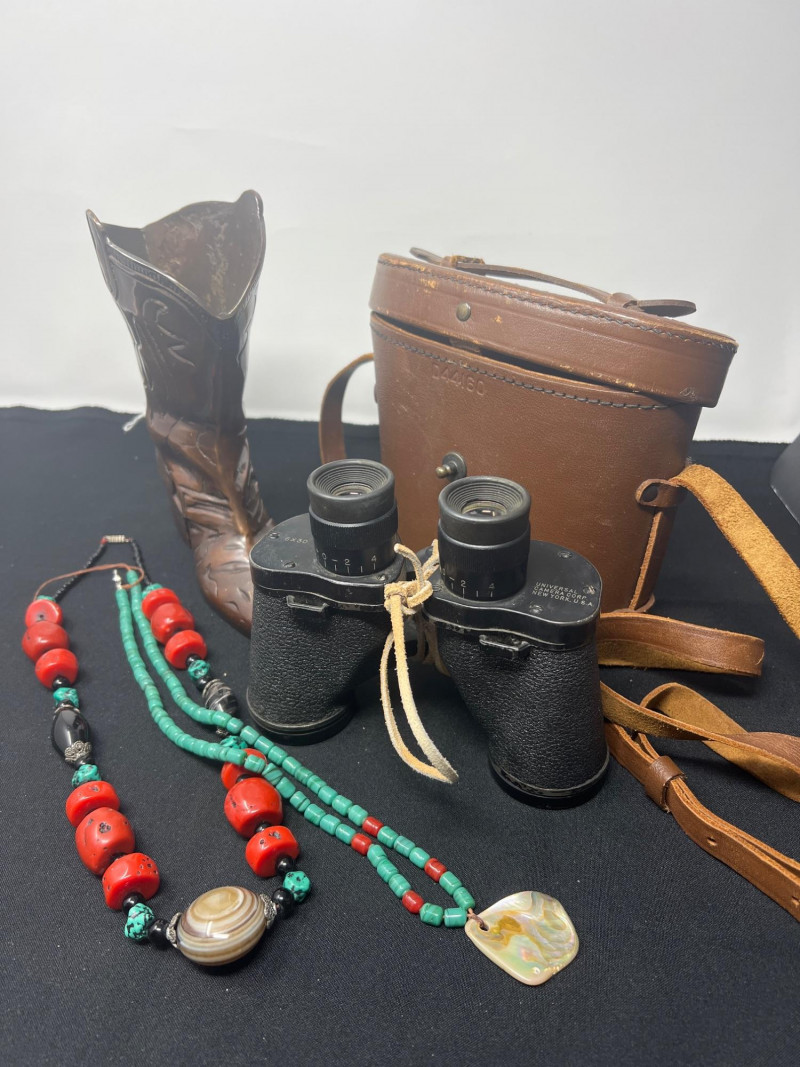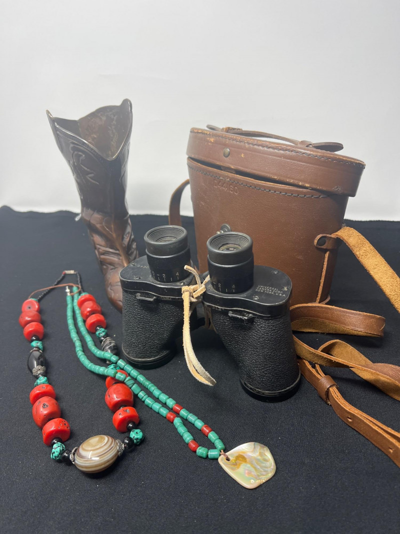 A mixed vintage lot featuring Universal camera binoculars and a strand of genuine coral beads. Also included is a metal boot (7.75" height x 6.5" length).