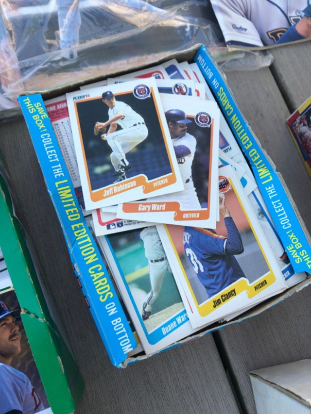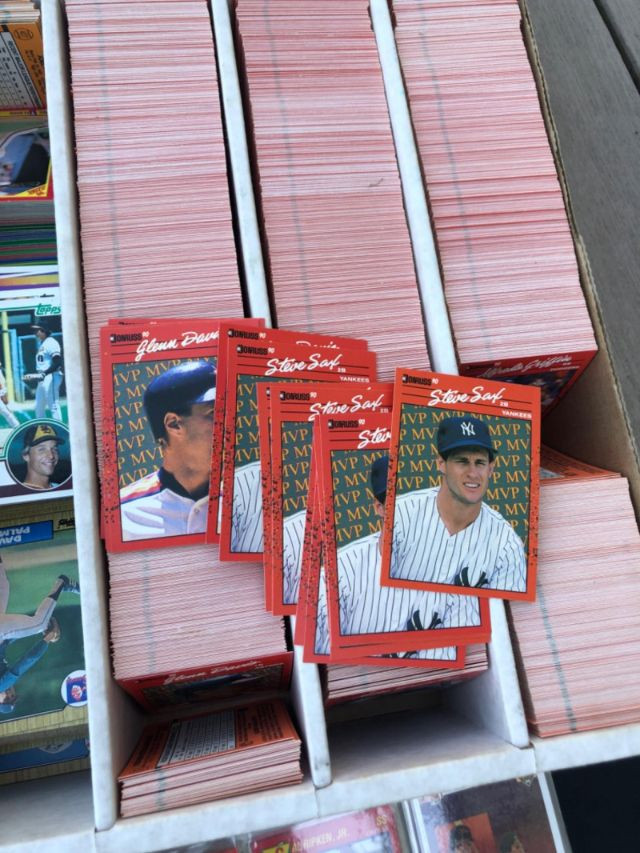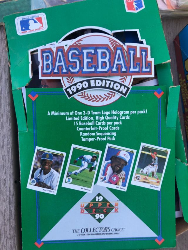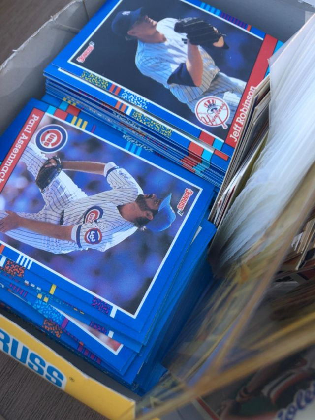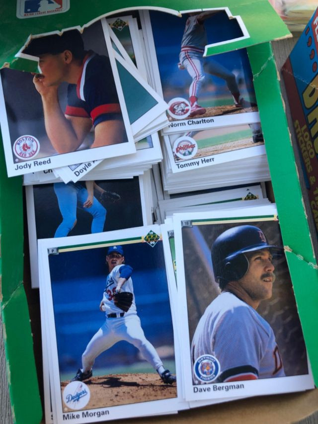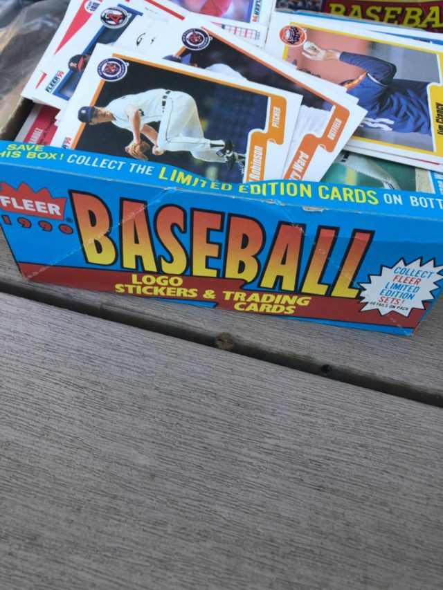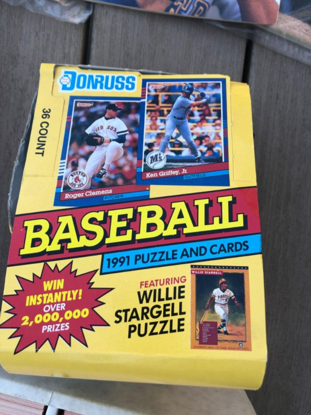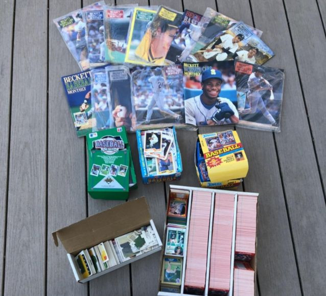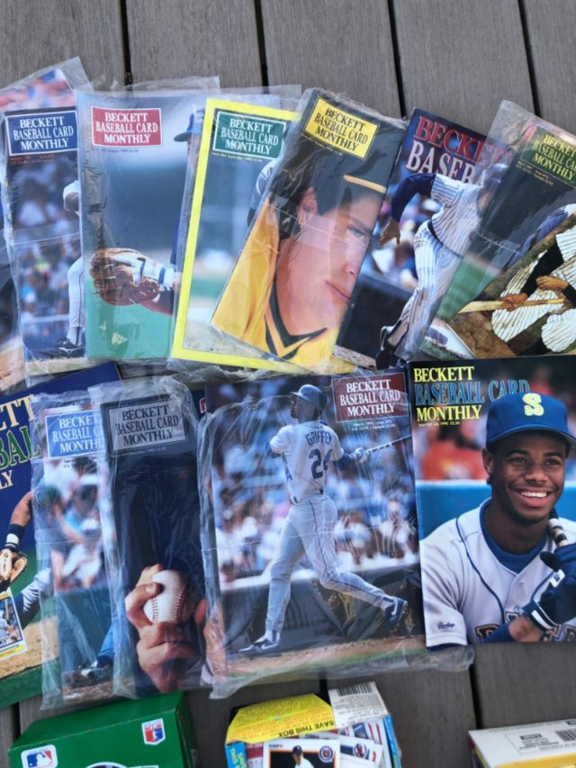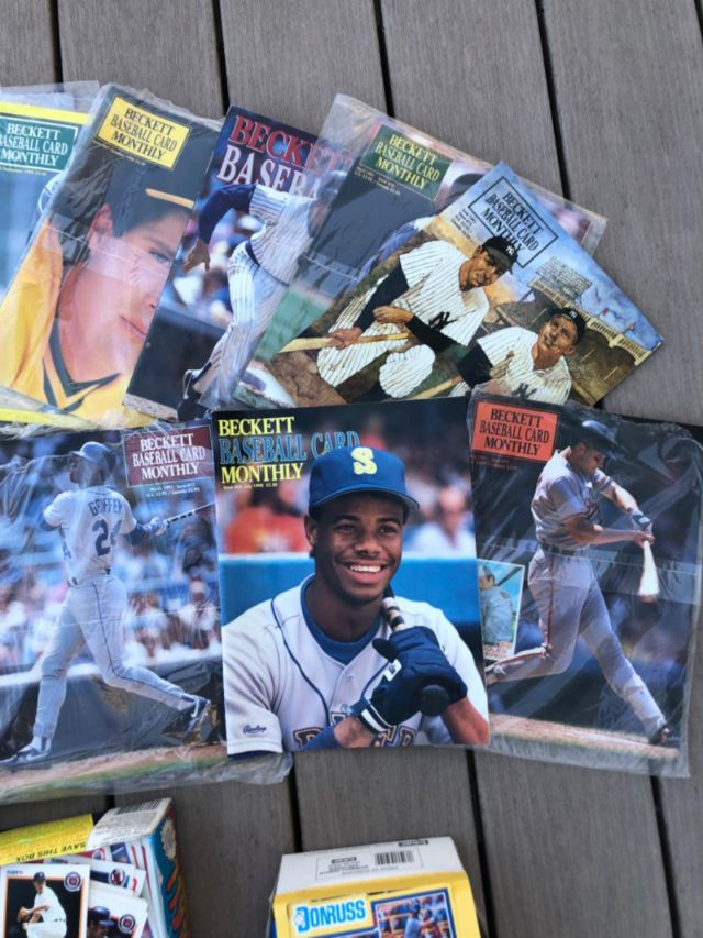 This baseball card lot includes 1980'a and 1990's baseball trading cards (Topps, Fleer Donruss, Upper DeckDeck.), a box full of 1990's Donruss baseball trading cards, a box full of Leaf Inc. Diamon King Puzzle Pieces, a box of 1991 Donruss baseball trading cards, a box of 1990's Fleer Baseball Trading Cards, A box of 1990 Upper Deck Baseball Trading Cards and 14 Becket Baseball Card Monthly Price Magazines