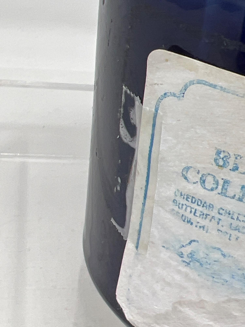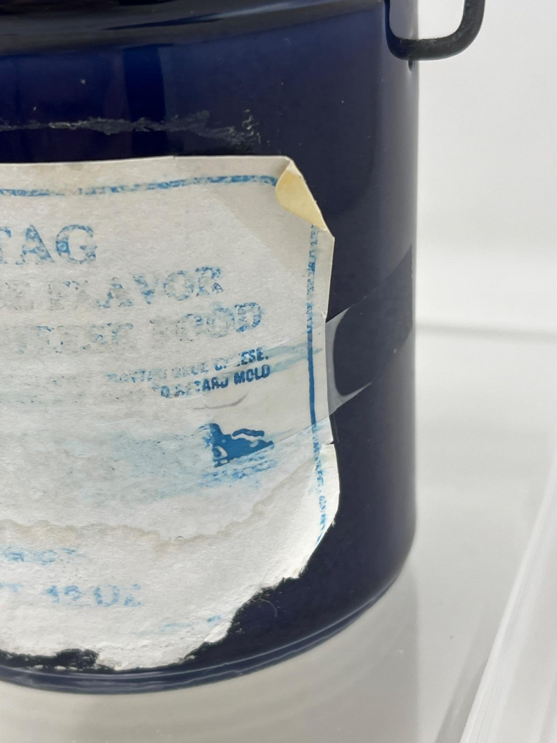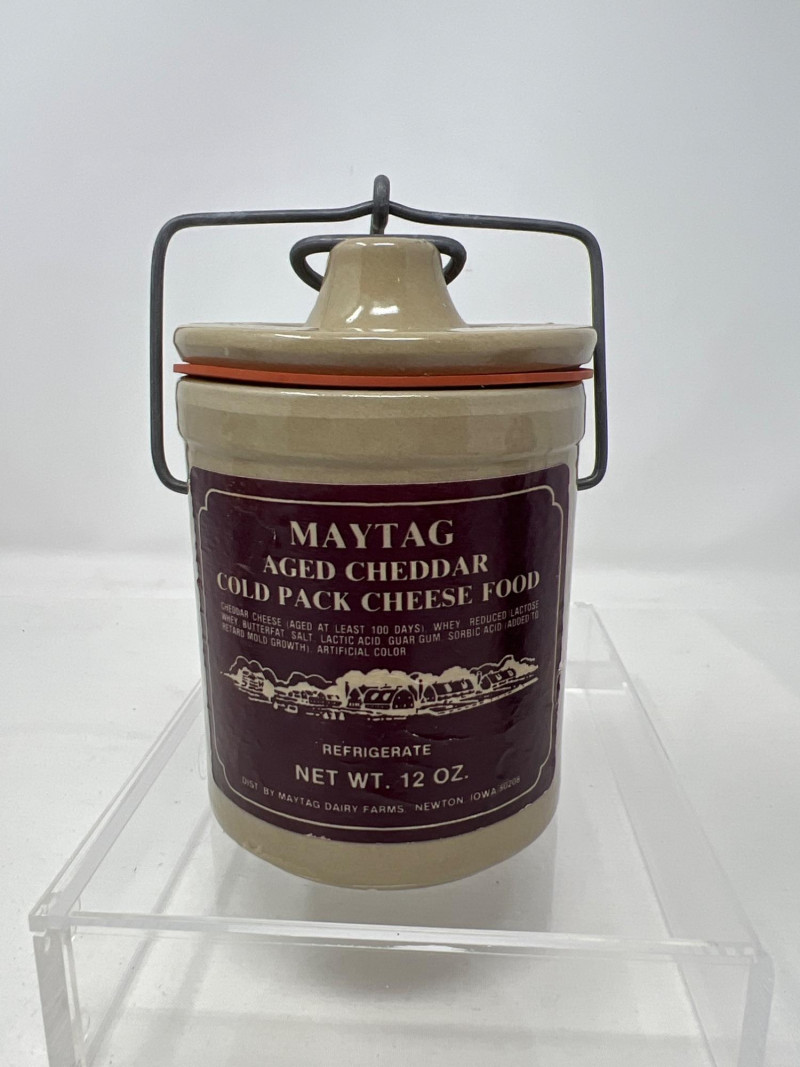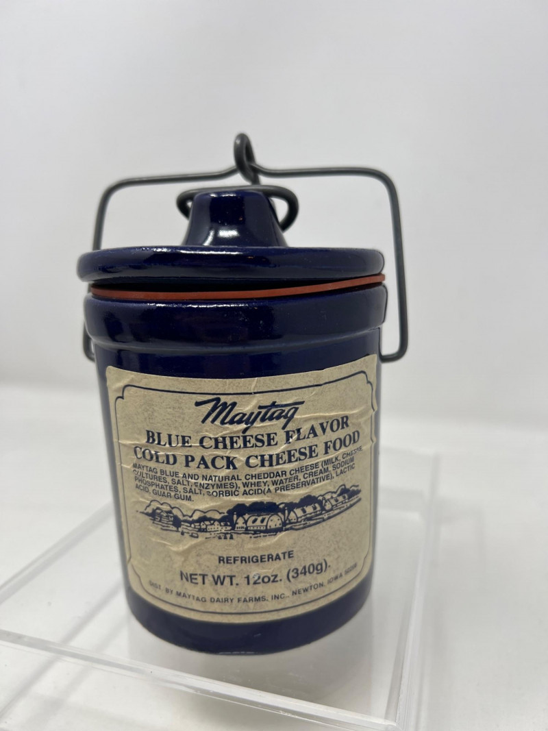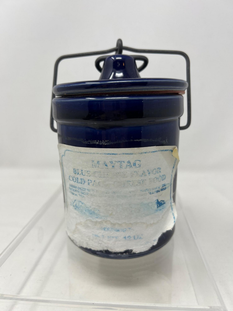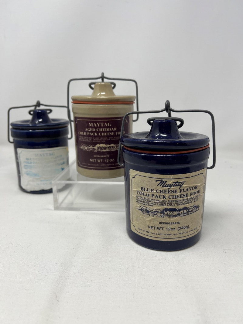 Three (3) Maytag Blue Cheese cold pack ceramic containers, each a quiet tribute to Midwestern dairy heritage and timeless stoneware design. These crocks once held the famed Maytag blue cheese, known for its rich flavor and artisanal roots. With classic blue graphics and sturdy ceramic form, they now serve as charming collectibles or rustic kitchen accents. A slice of Americana, preserved in porcelain. One label is rather rough and is retaped onto jar with scotch tape.