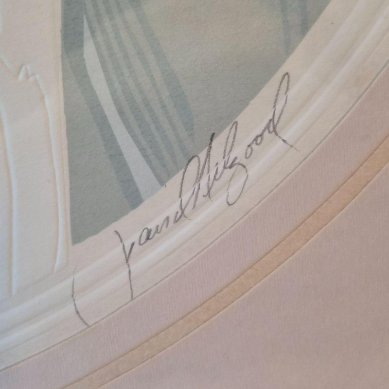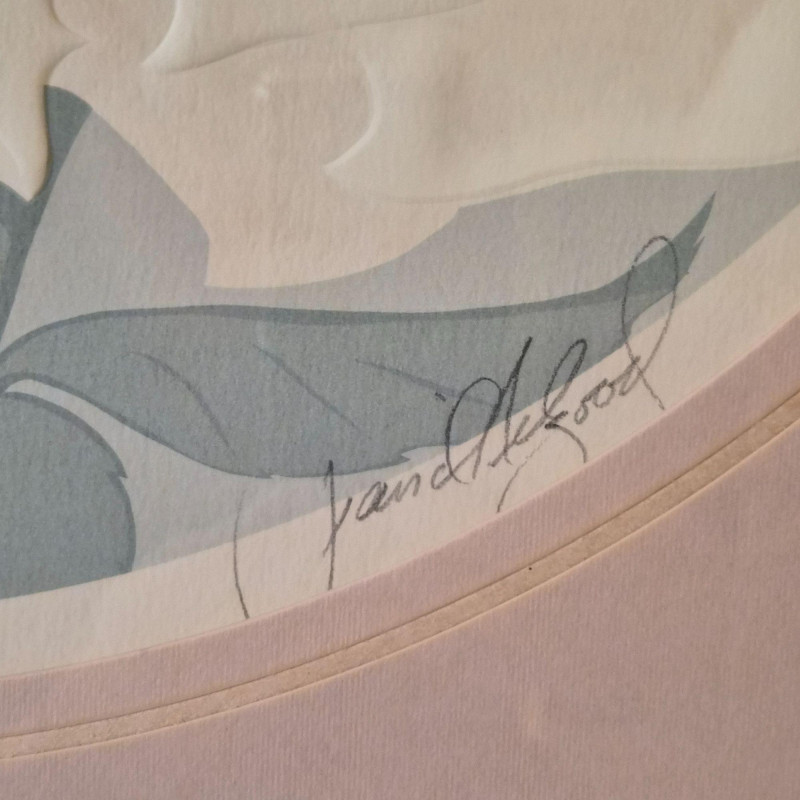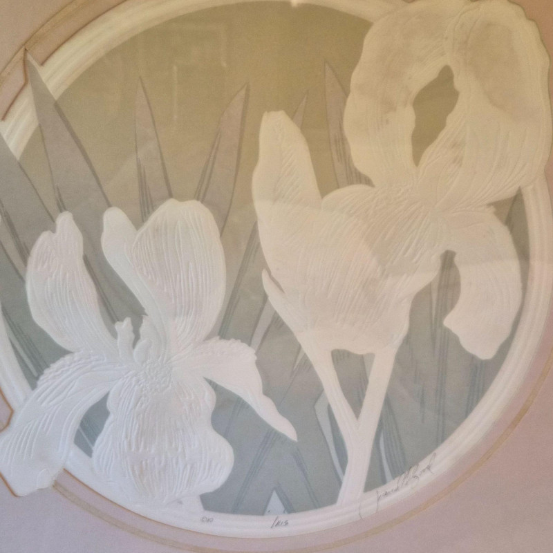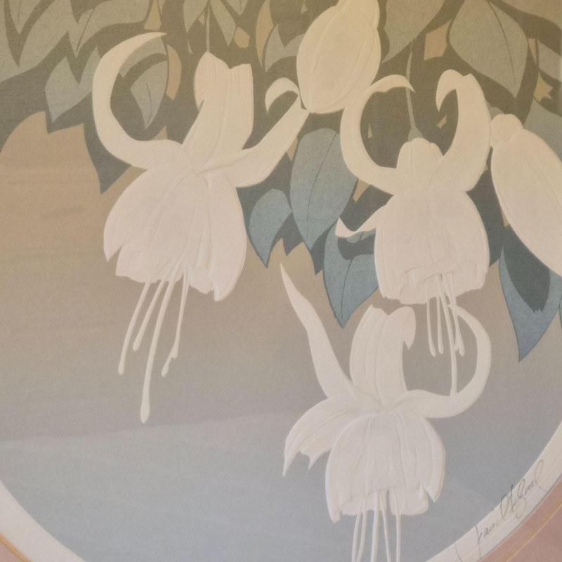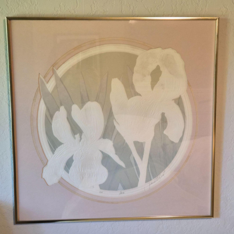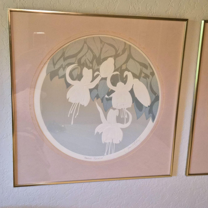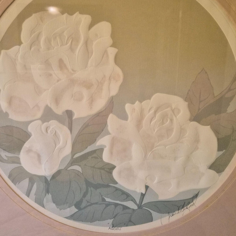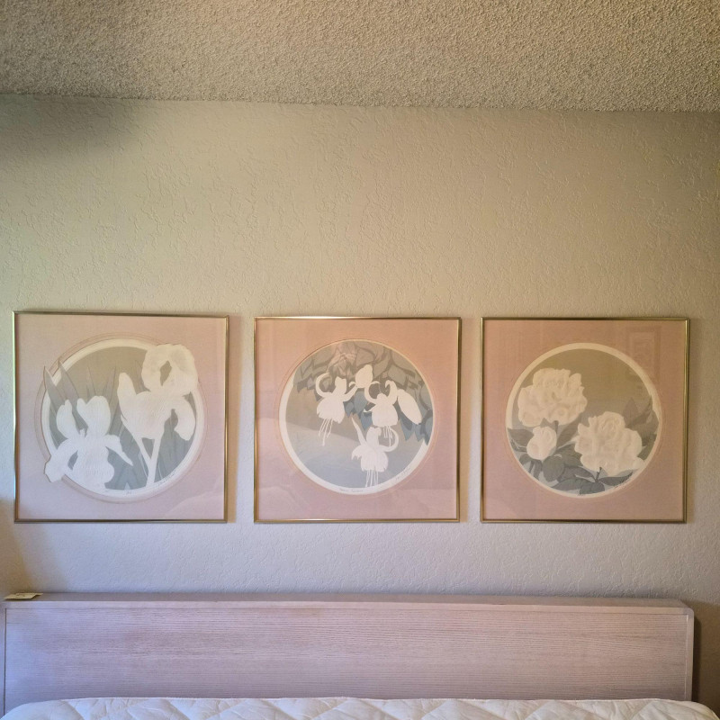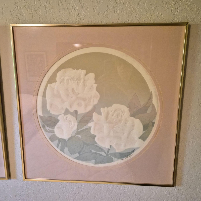 Serene trio of embossed serigraph prints by artist David Allgood, dated 1980. Each framed piece showcases a delicate floral study in muted pink and etched white tones, capturing: Rendered in Allgood’s signature embossed serigraph technique, these prints evoke quiet elegance and botanical grace. A harmonious set for collectors of vintage fine art or those seeking soft, sophisticated wall décor.