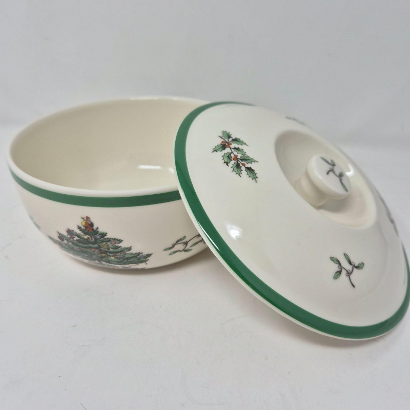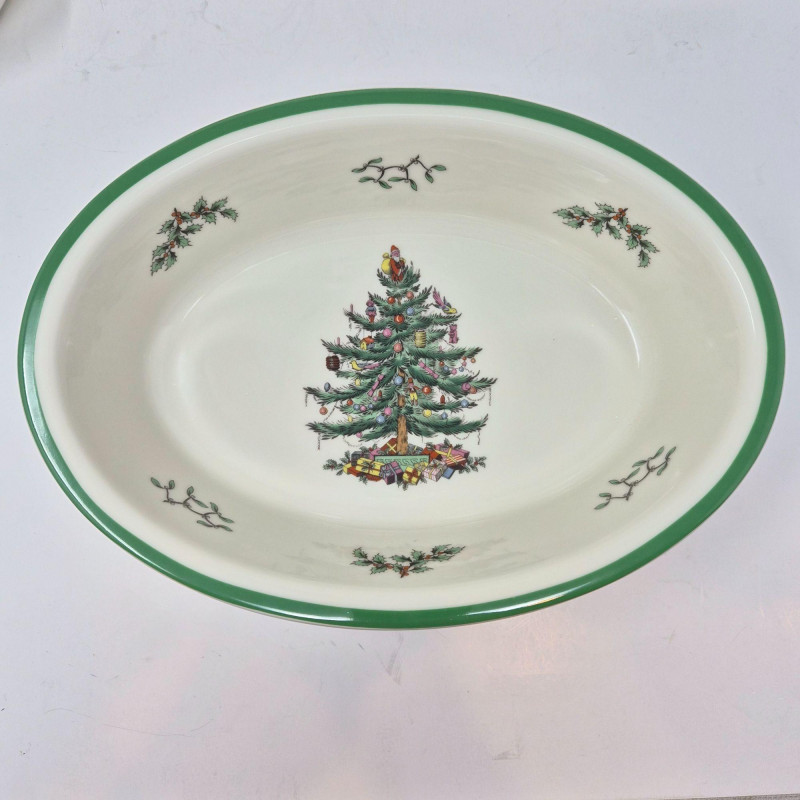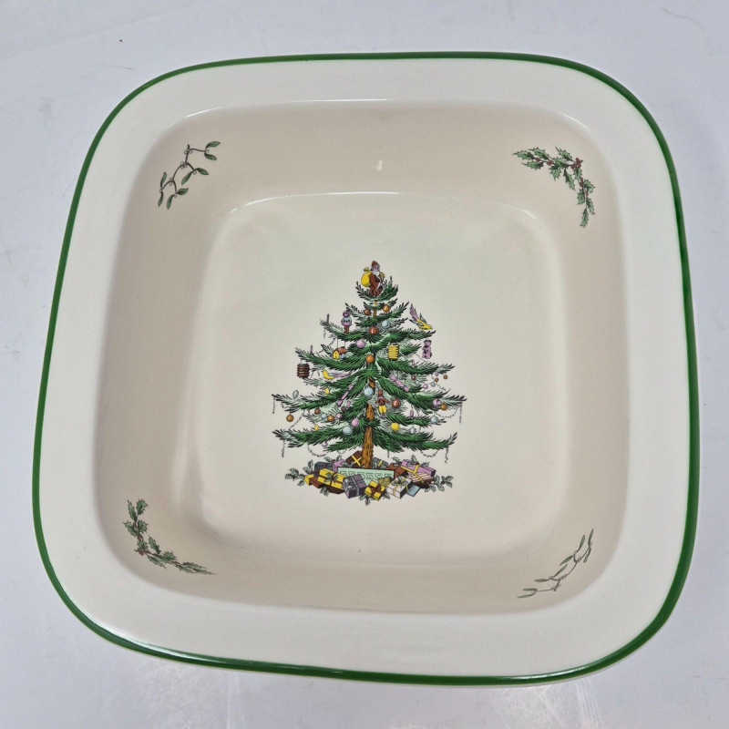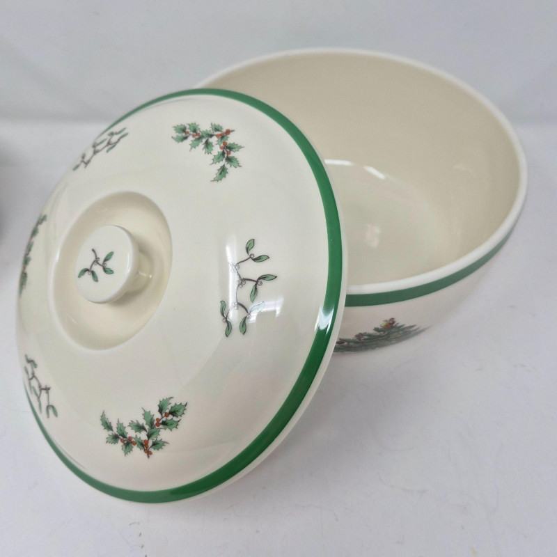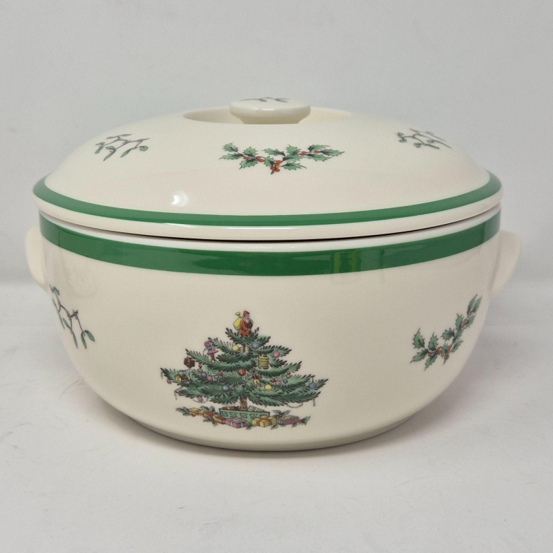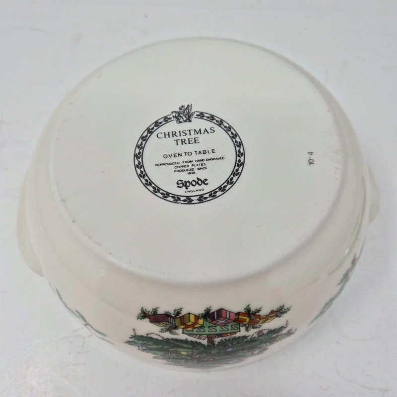 Bakeware from oven to table: Serve up holiday magic with this charming quartet of Spode Christmas Tree covered and open casserole bakeware dishes, each adorned with the iconic tree motif and holly-trimmed rims. This vintage-inspired set includes: Crafted in classic white porcelain with festive green accents, these dishes transition seamlessly from oven to table, adding nostalgic charm to your seasonal spread. Whether you're hosting a cozy dinner or decking the buffet, this Spode set brings warmth, tradition, and timeless elegance to every gathering. Kindly bring your own packing supplies—bags, boxes, and padding—to ensure your items travel home securely.