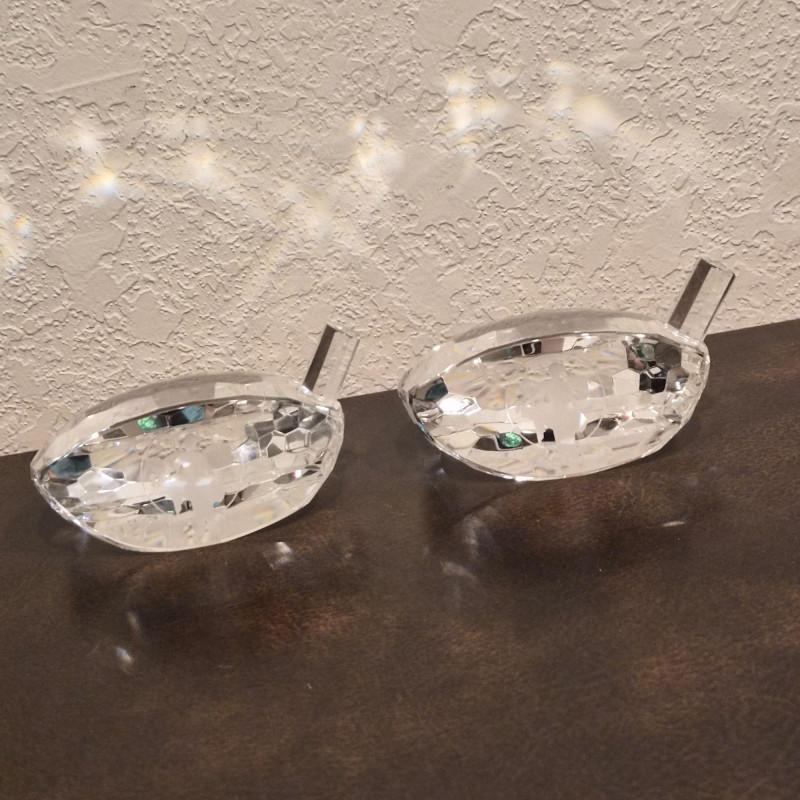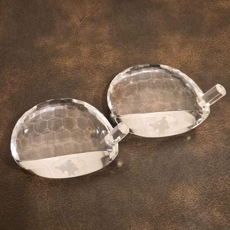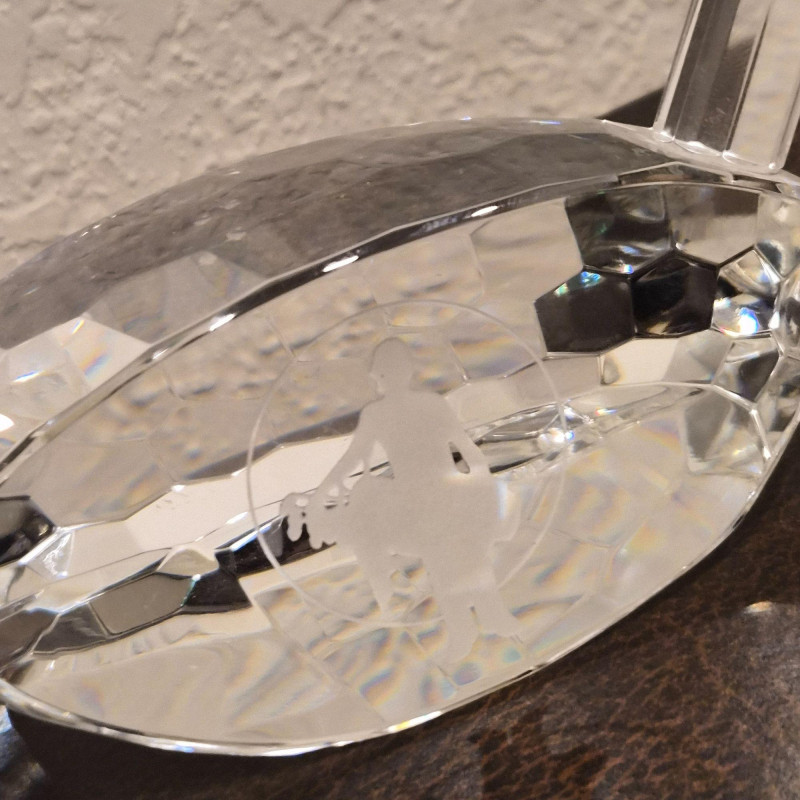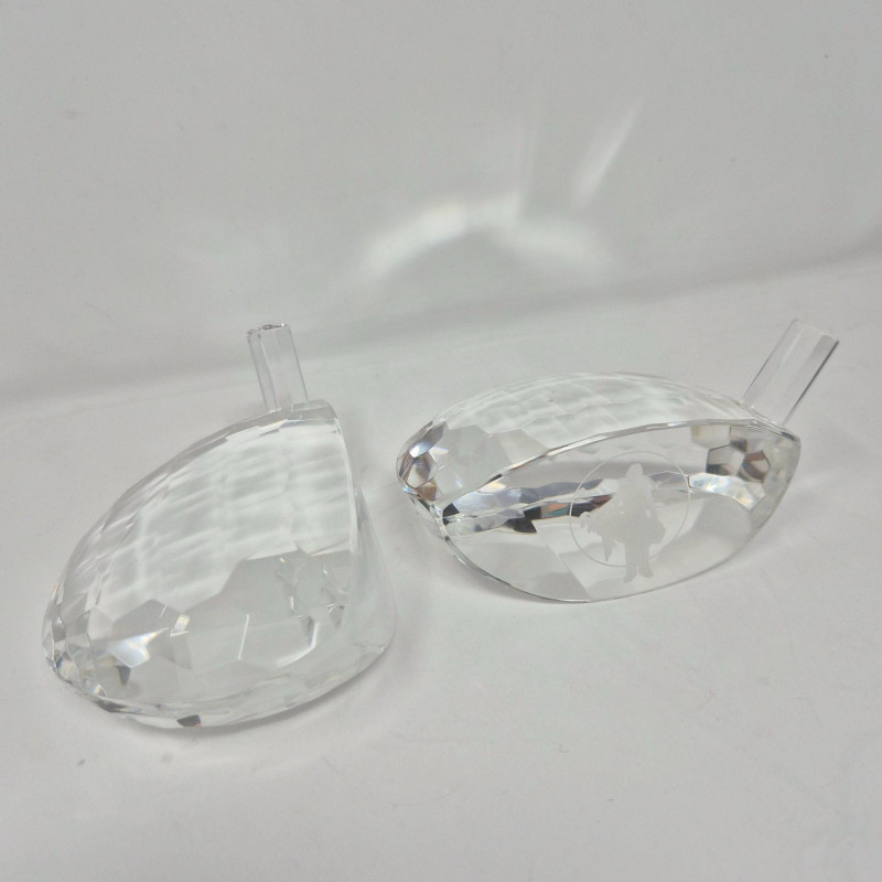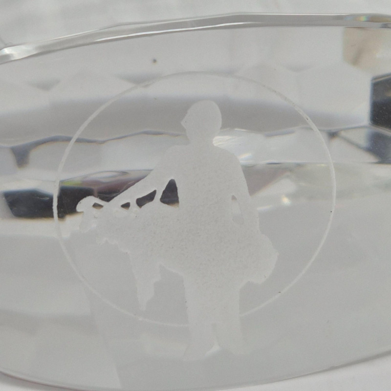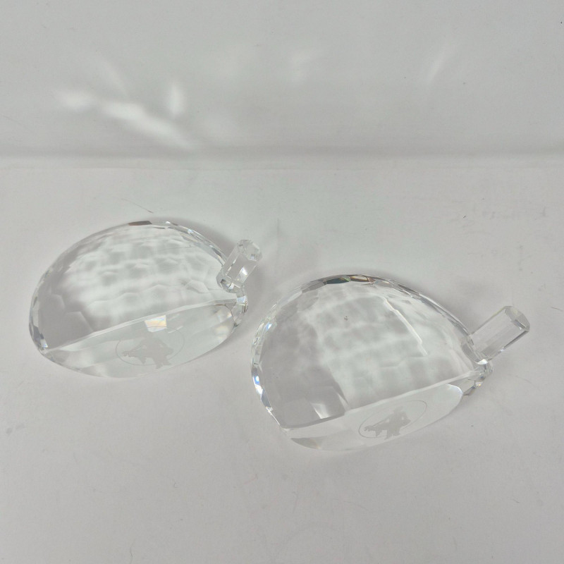 Celebrate the elegance of the game with this pair of Swarovski-style crystal golf club award figures from a local tournament. They have not been personalized, so make a perfect gift or add to your crystal collection. Each piece is precision-cut and faceted to catch the light, creating a dazzling display of clarity and craftsmanship. Frosted etched golfer carrying bag of clubs. Measuring 4" x 3.5", these sculptural accents feature a sleek golf club silhouette with floral-etched detailing, evoking both sport and sophistication. Originally gifted as tournament decor, they make a striking addition to any golfer’s trophy shelf, office, or crystal collection. No makers mark. No box.