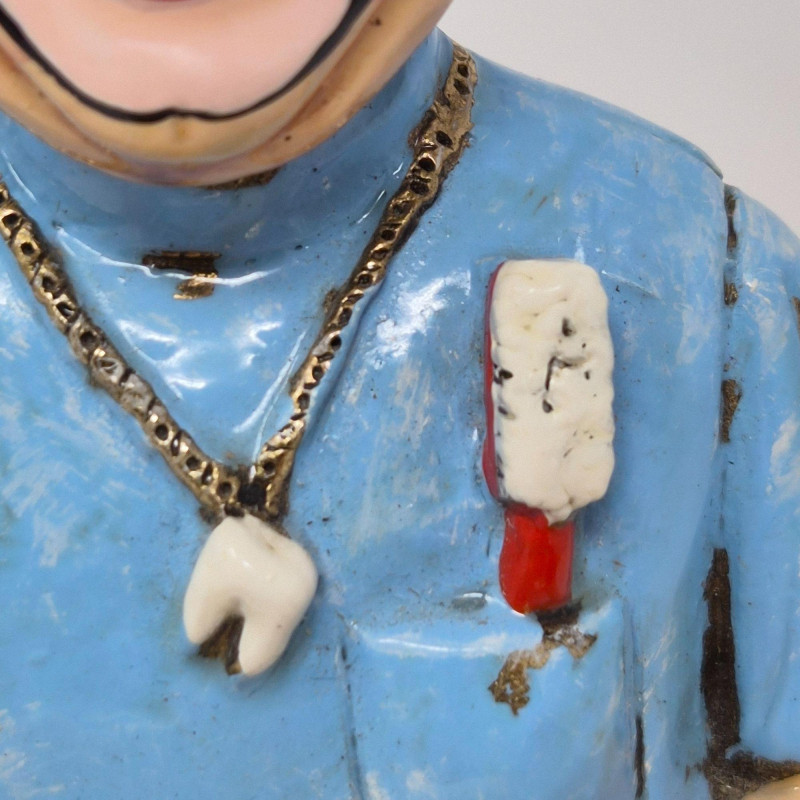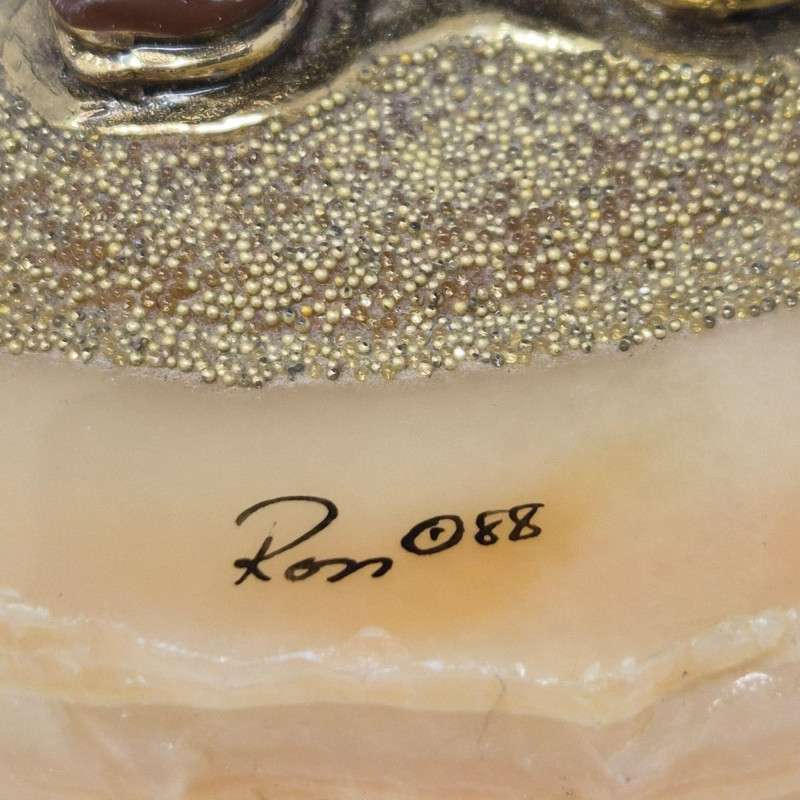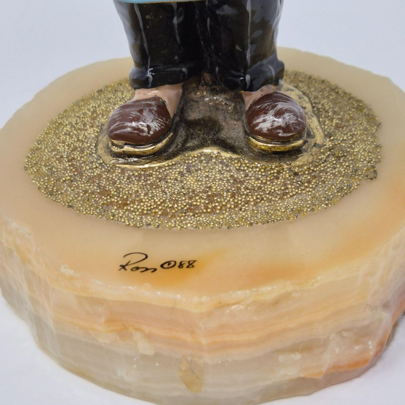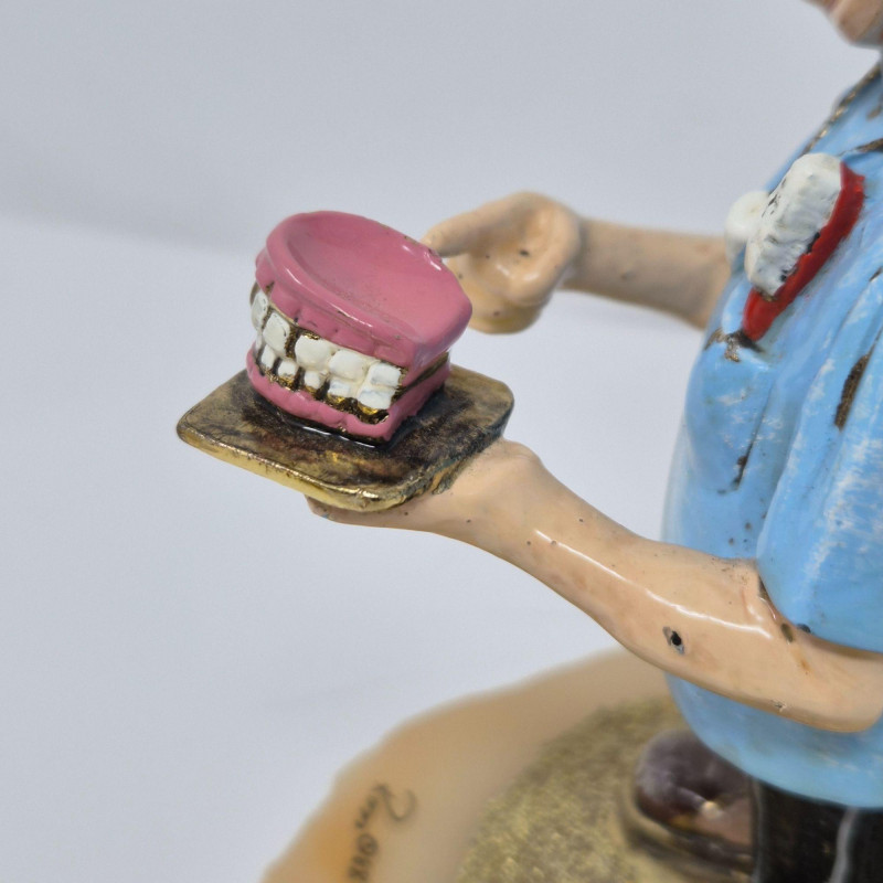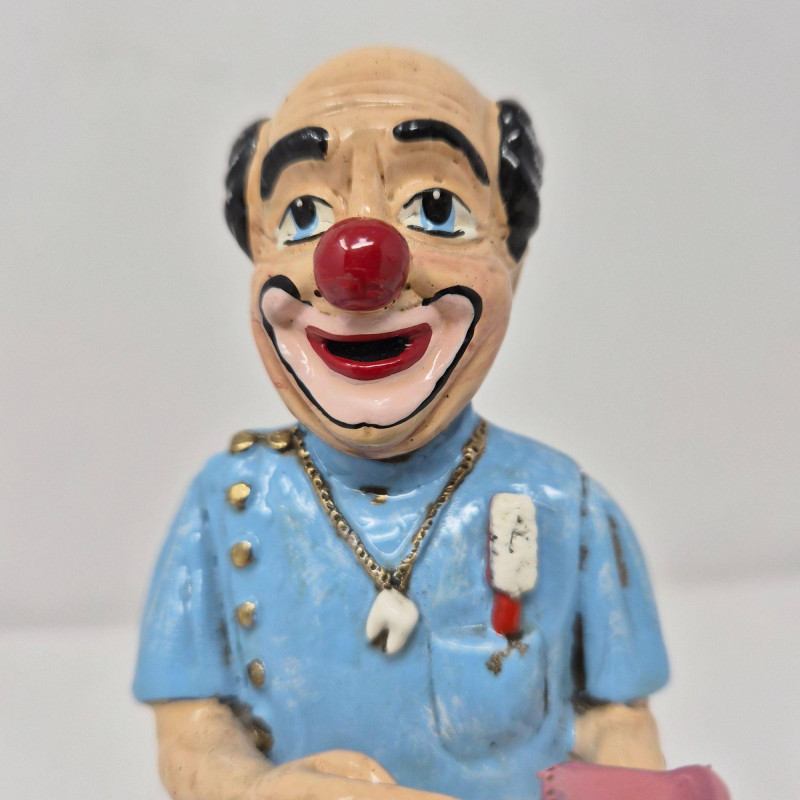 Humorous Ron Lee figurine brings levity to the dental profession with a clown dressed in a blue dental coat, holding a toothbrush and dental model while pointing with theatrical flair. Mounted on a polished alabaster base inscribed “Dentist,” the piece captures Ron Lee’s signature blend of whimsy and craftsmanship. Dated 1988, it stands 7" tall by 4" wide and makes a delightful gift or collectible for dental professionals, clown enthusiasts, or lovers of quirky Americana.