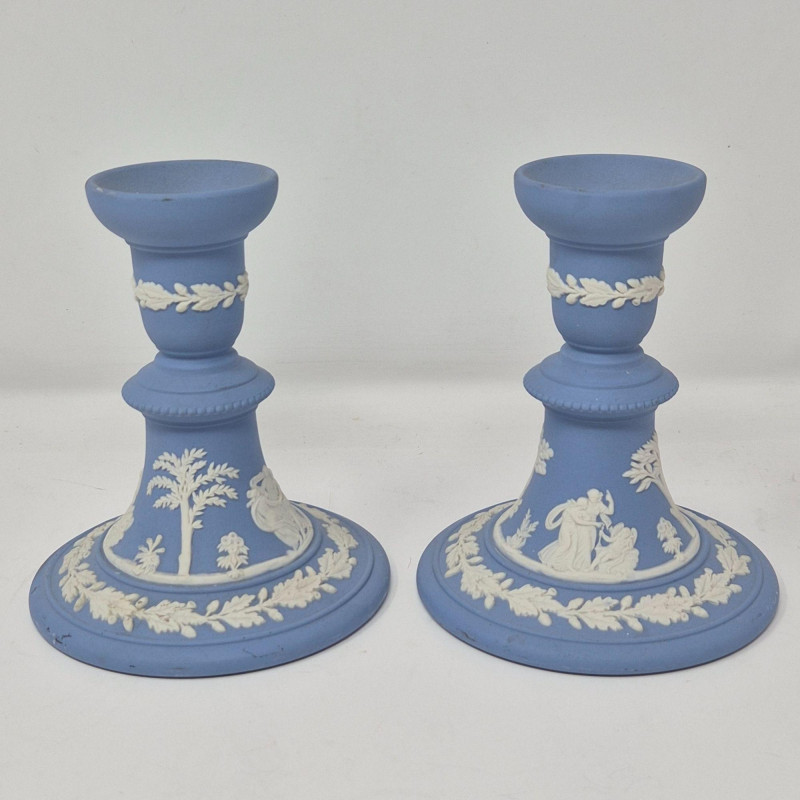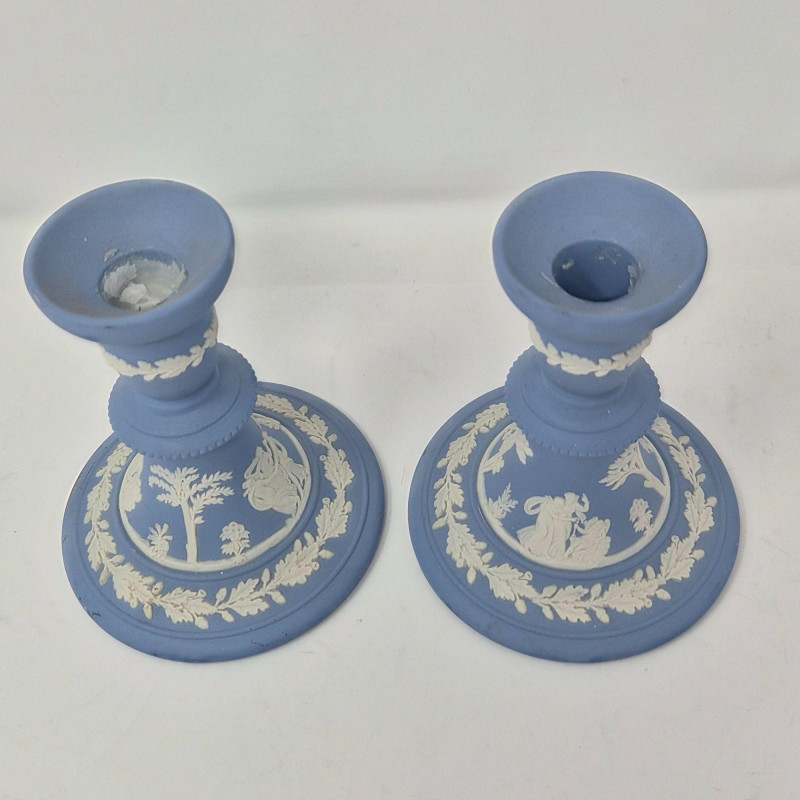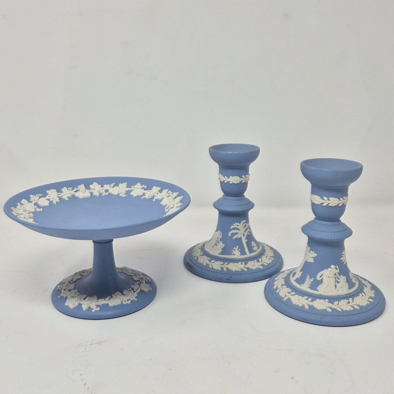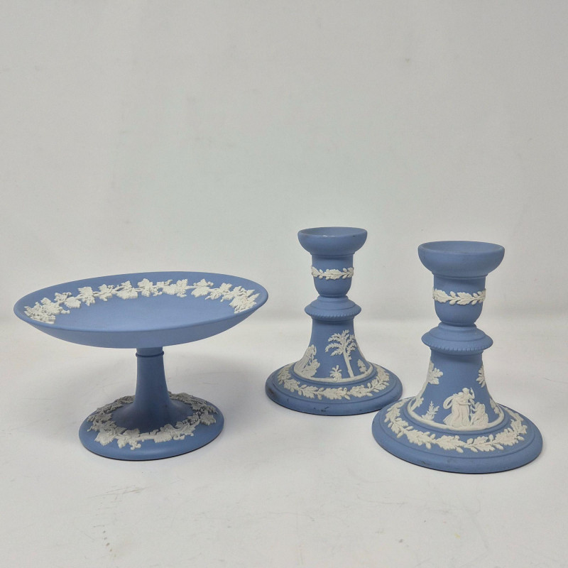 Lot # 47 - Blue Wedgwood Candlestick Holders & Pedestal Compote Dish