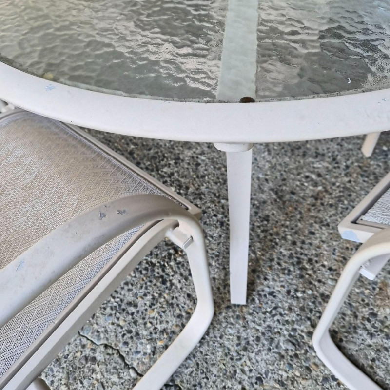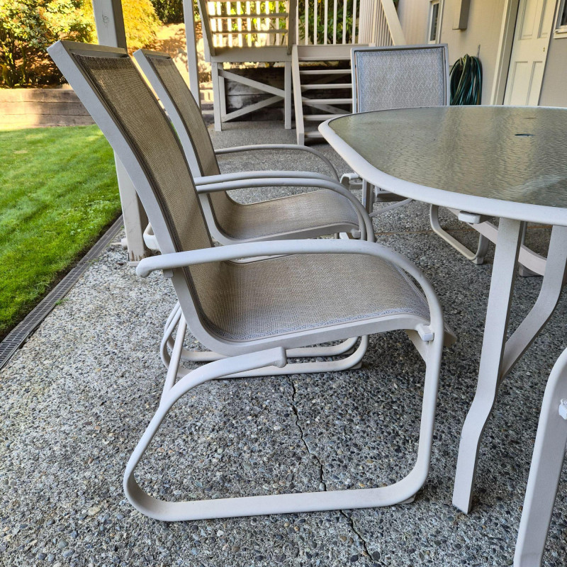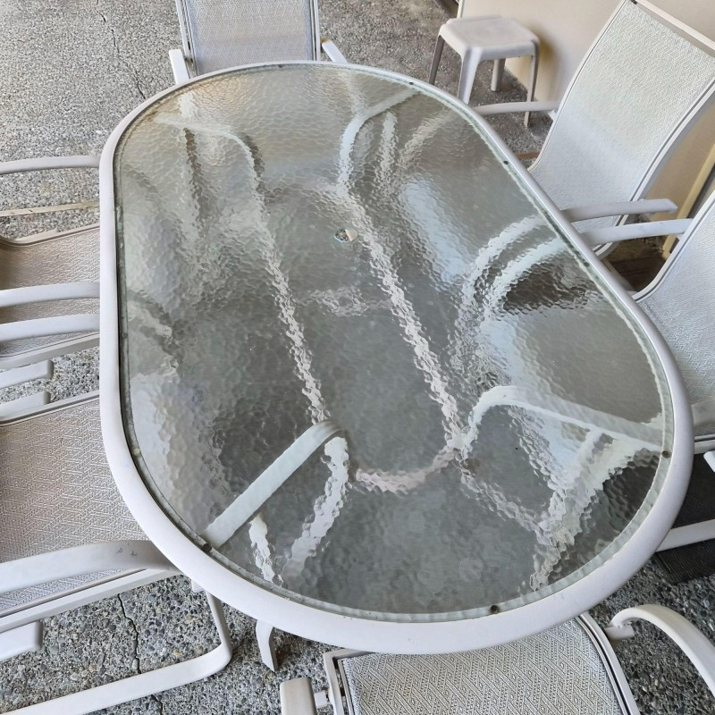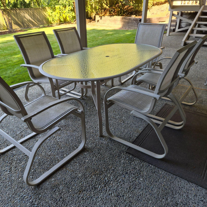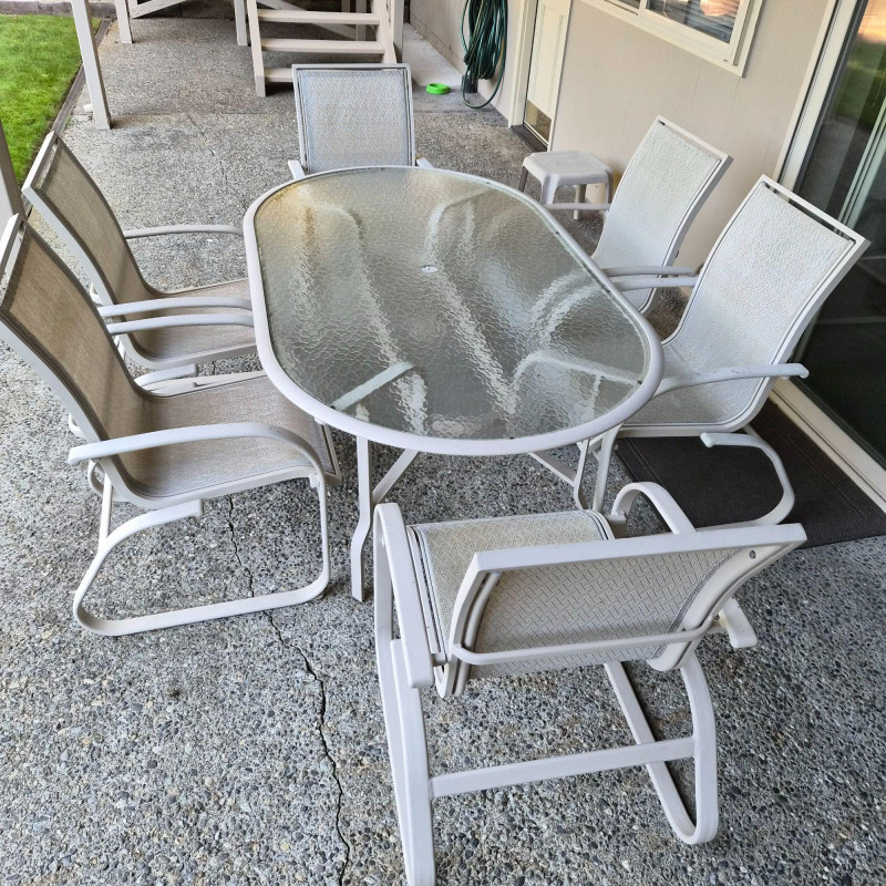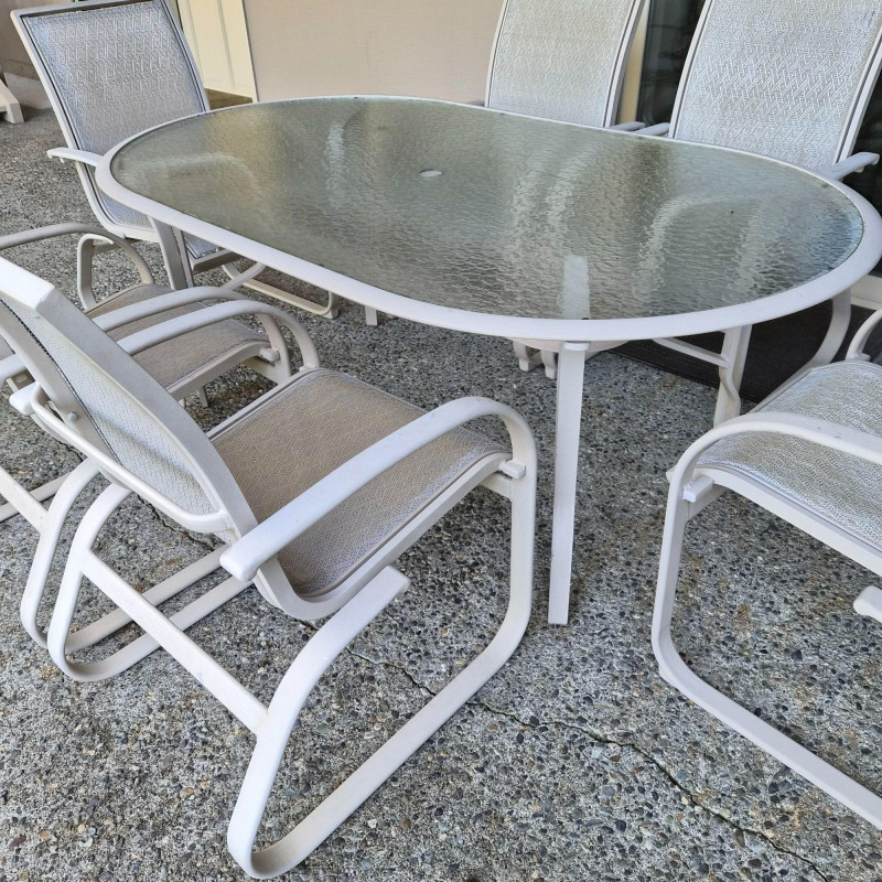 This outdoor patio set features a sturdy yet lightweight aluminum metal frame with a beige powder-coated finish. The glass tabletop includes a center hole designed for an umbrella (umbrella not included), making it ideal for shaded outdoor dining. The set includes six matching chairs, each measuring approximately 38" tall by 26" wide and 26" deep. While the finish shows signs of age and could benefit from a fresh coat of paint and light cleaning, the structure remains solid and ready for use. A practical and inviting set for garden gatherings, deck dinners, or backyard lounging. Due to its size and weight, bidding on this lot confirms agreement to bring at least two or more able-bodied individuals, an appropriate sized moving vehicle (NOTE MEASUREMENTS) and appropriate equipment (e.g., dollie, hand truck) for safe removal. Failure to comply may result in forfeiture without refund. No staff on site to assist with moving this item.