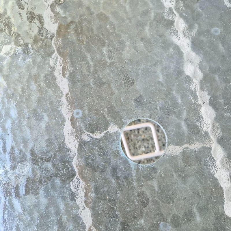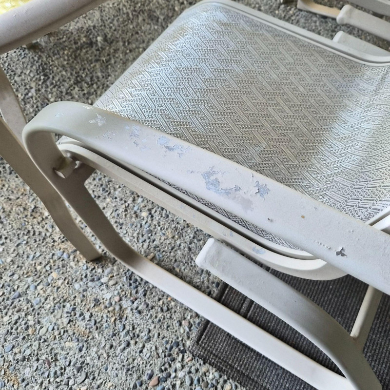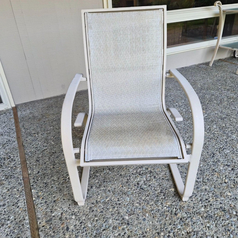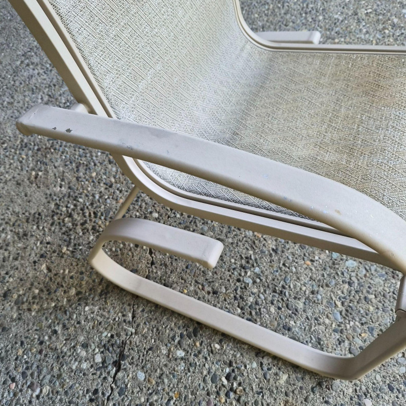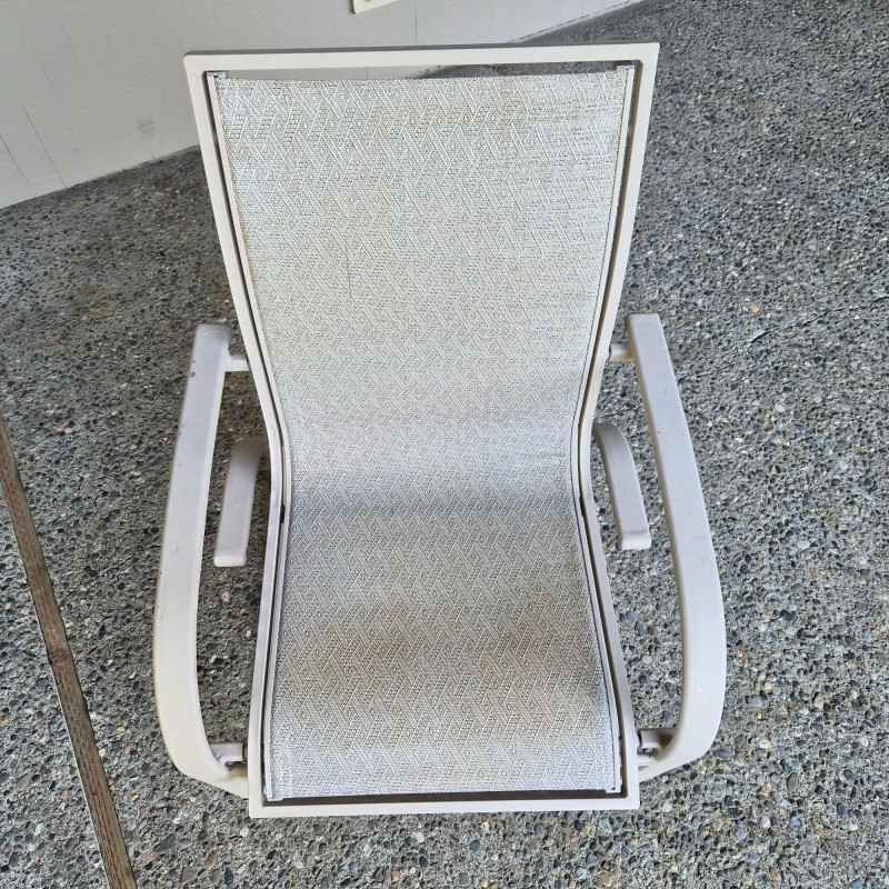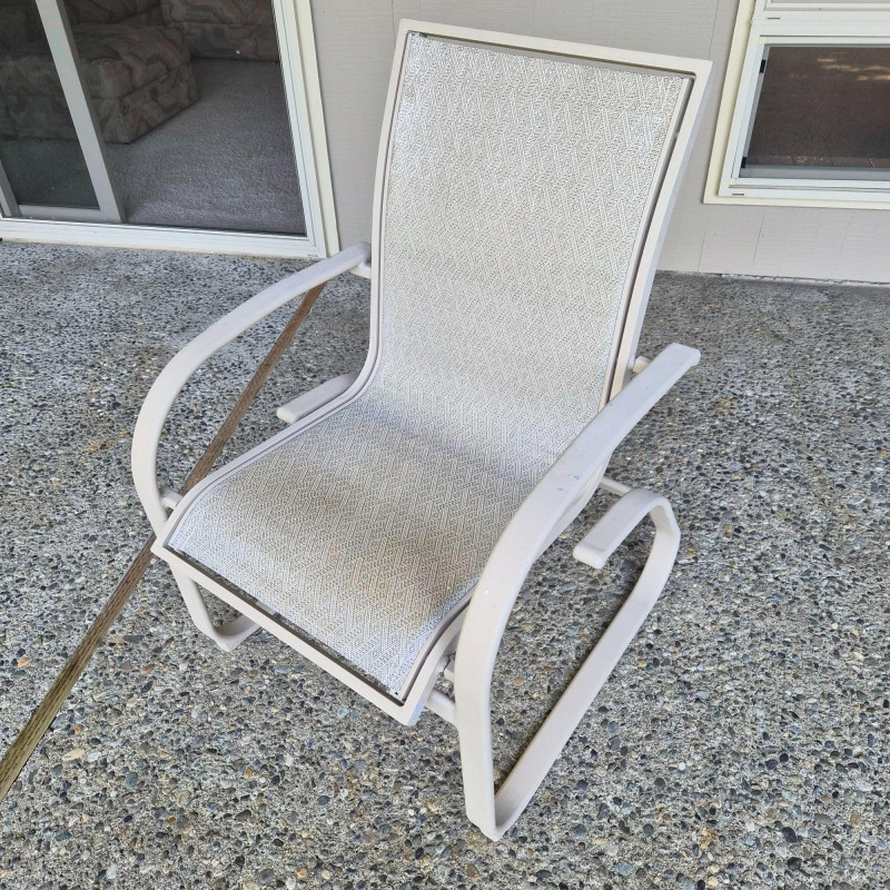 This outdoor patio set features a sturdy yet lightweight aluminum metal frame with a beige powder-coated finish. The glass tabletop includes a center hole designed for an umbrella (umbrella not included), making it ideal for shaded outdoor dining. The set includes six matching chairs, each measuring approximately 38" tall by 26" wide and 26" deep. While the finish shows signs of age and could benefit from a fresh coat of paint and light cleaning, the structure remains solid and ready for use. A practical and inviting set for garden gatherings, deck dinners, or backyard lounging. Due to its size and weight, bidding on this lot confirms agreement to bring at least two or more able-bodied individuals, an appropriate sized moving vehicle (NOTE MEASUREMENTS) and appropriate equipment (e.g., dollie, hand truck) for safe removal. Failure to comply may result in forfeiture without refund. No staff on site to assist with moving this item.